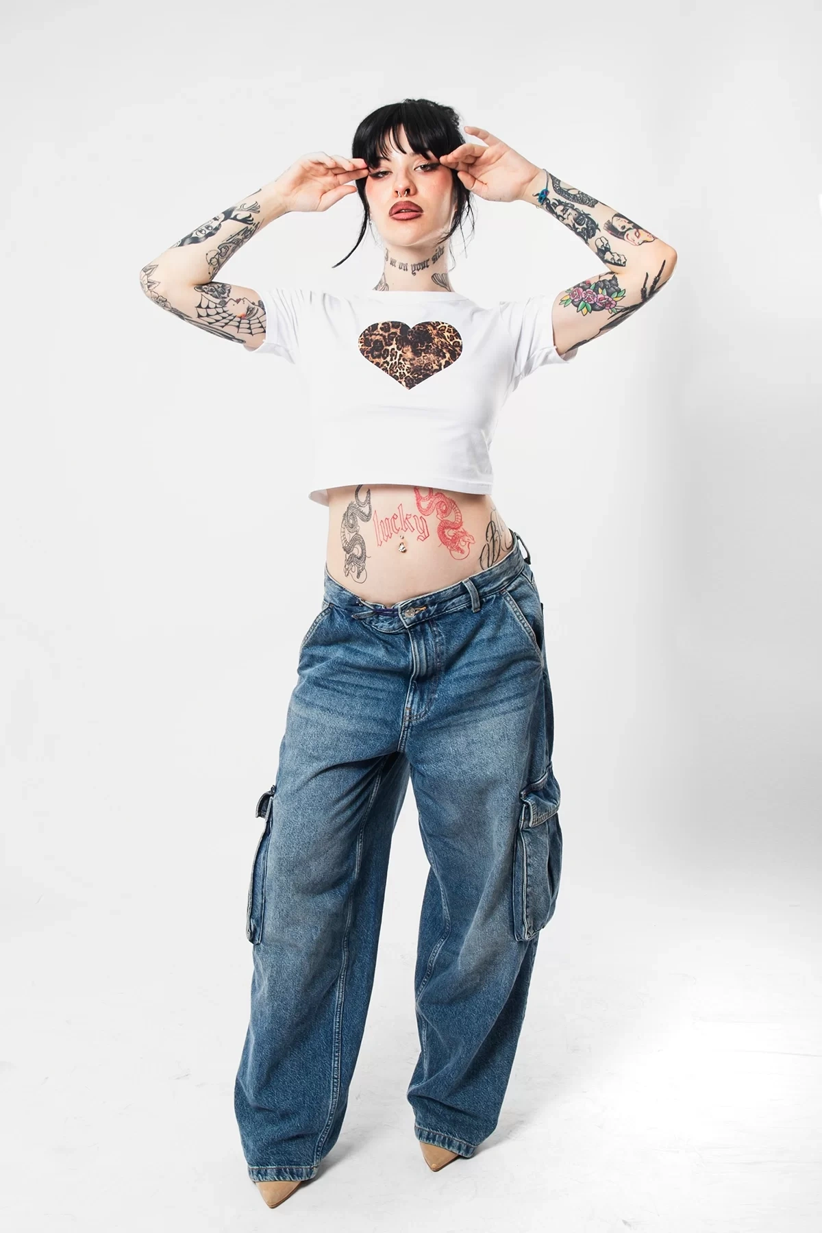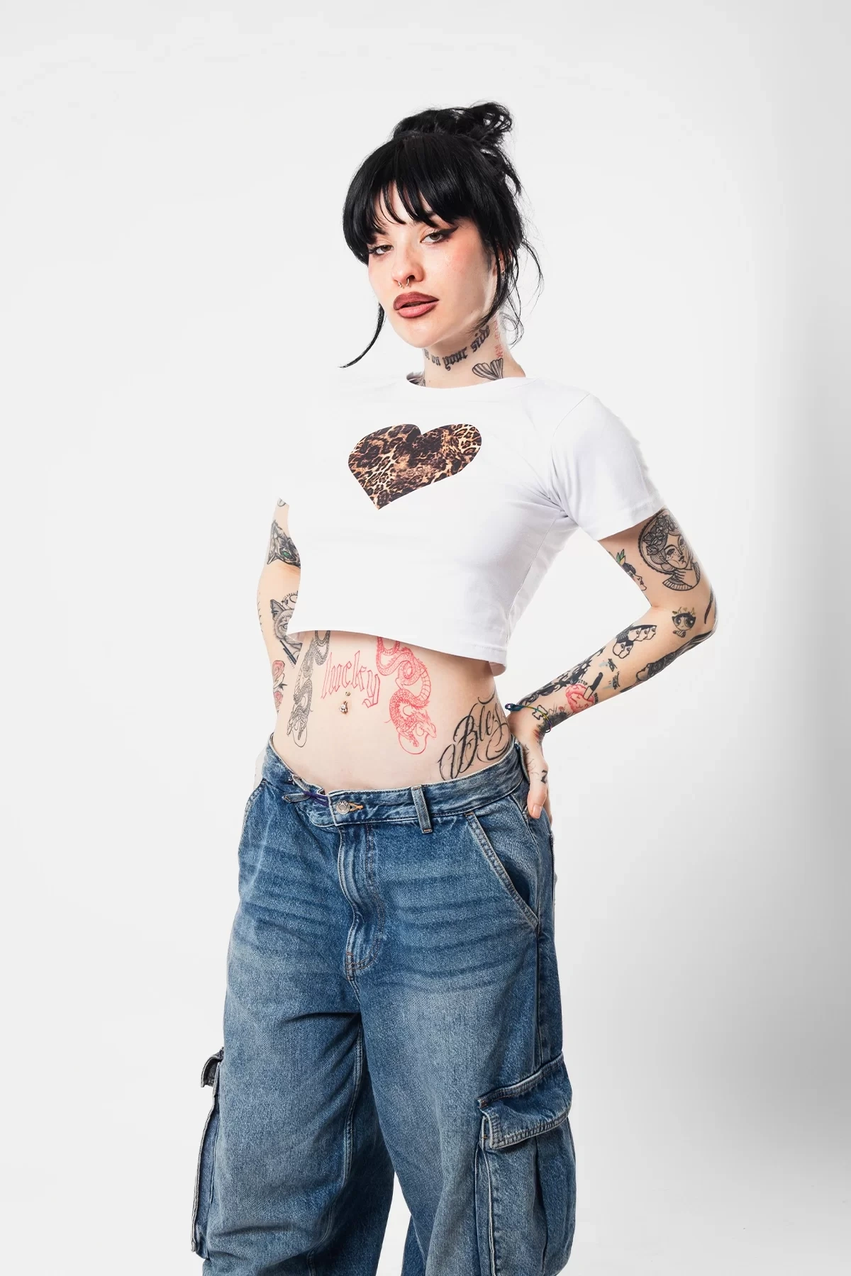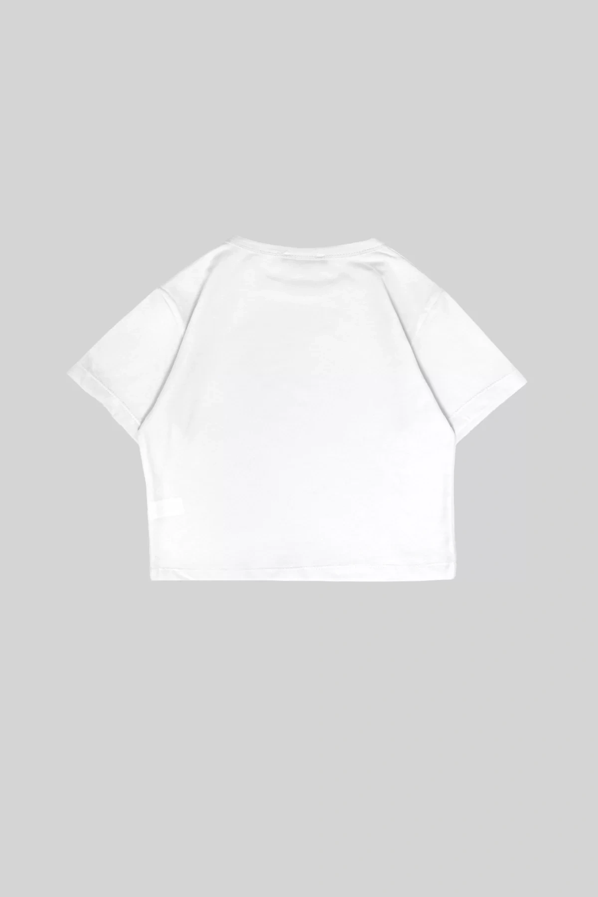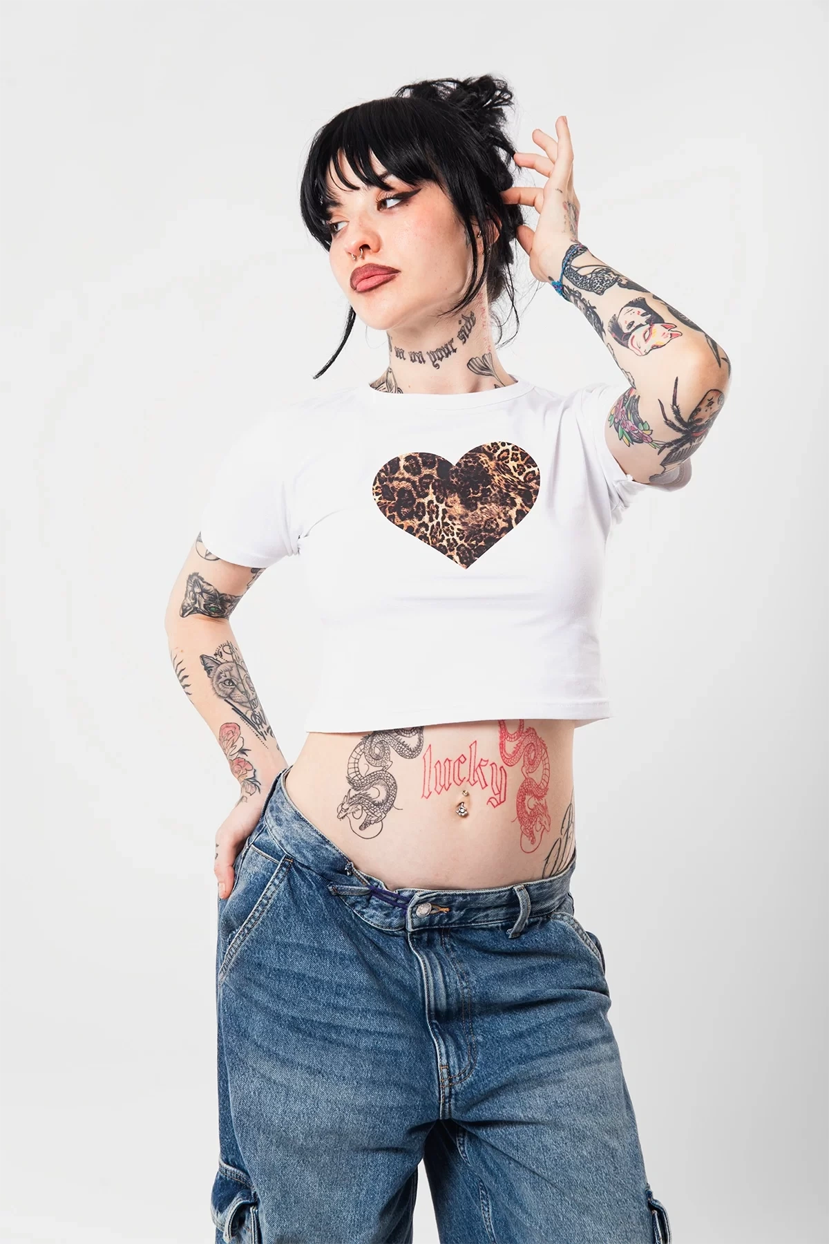 "V2" Leopar Star Baskılı Beyaz Crop Top