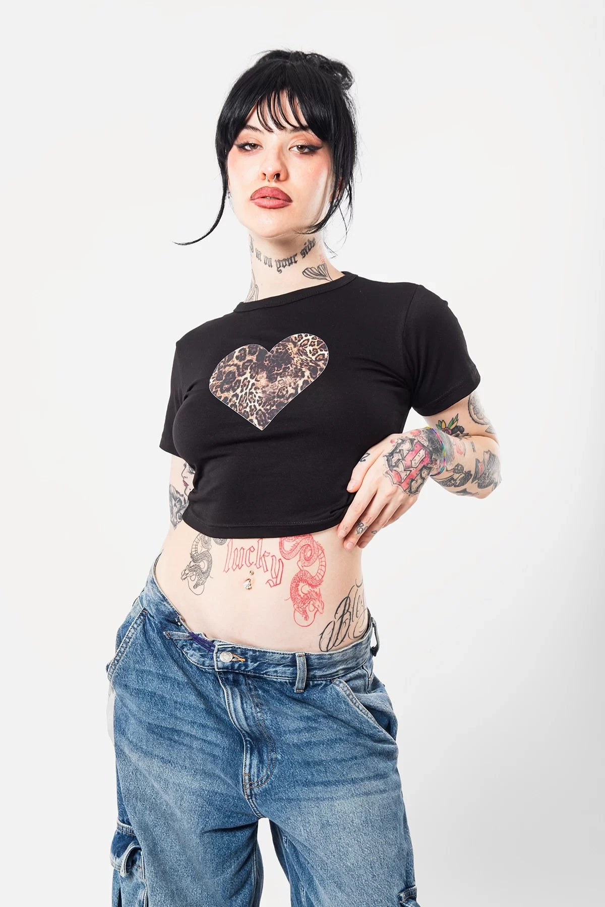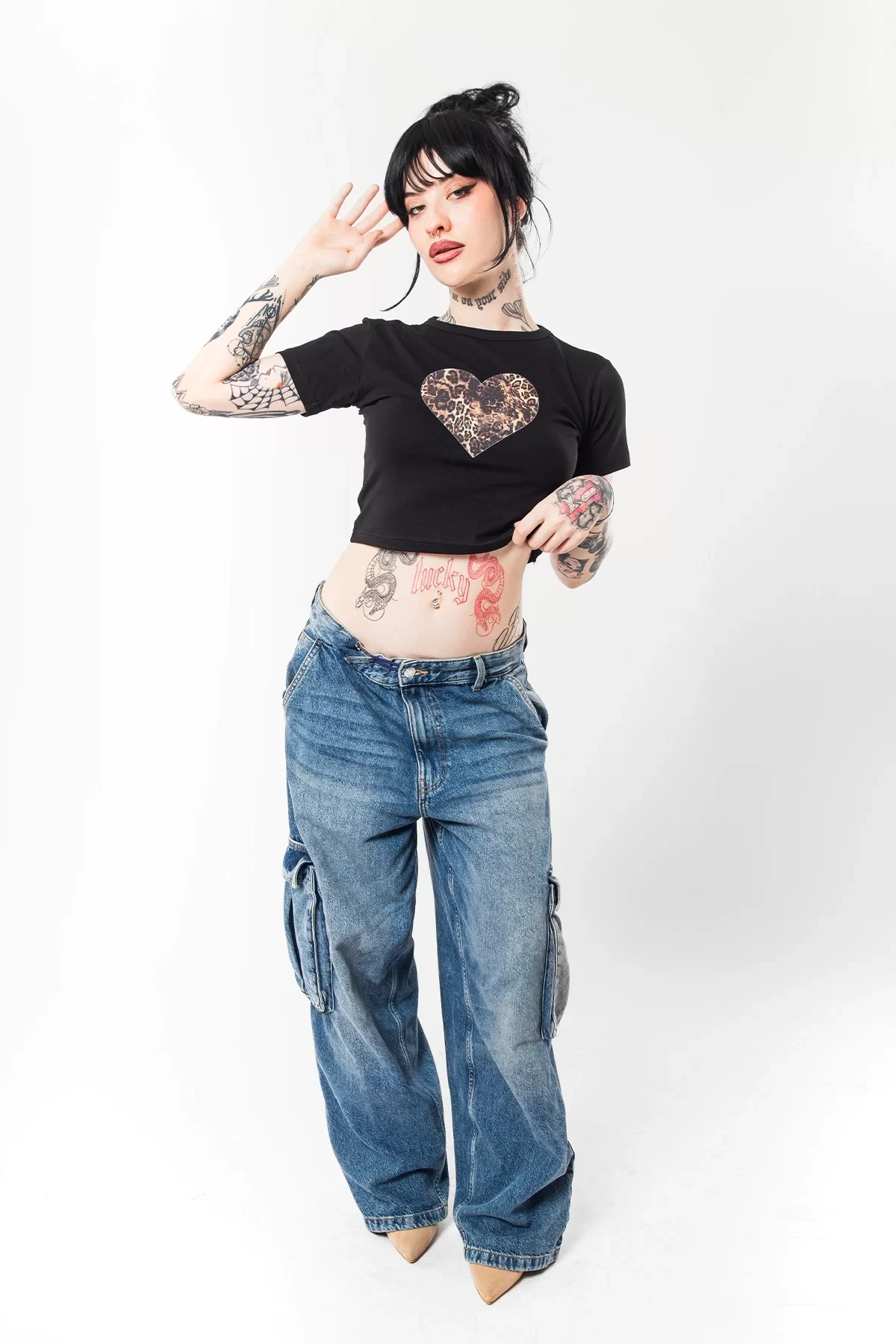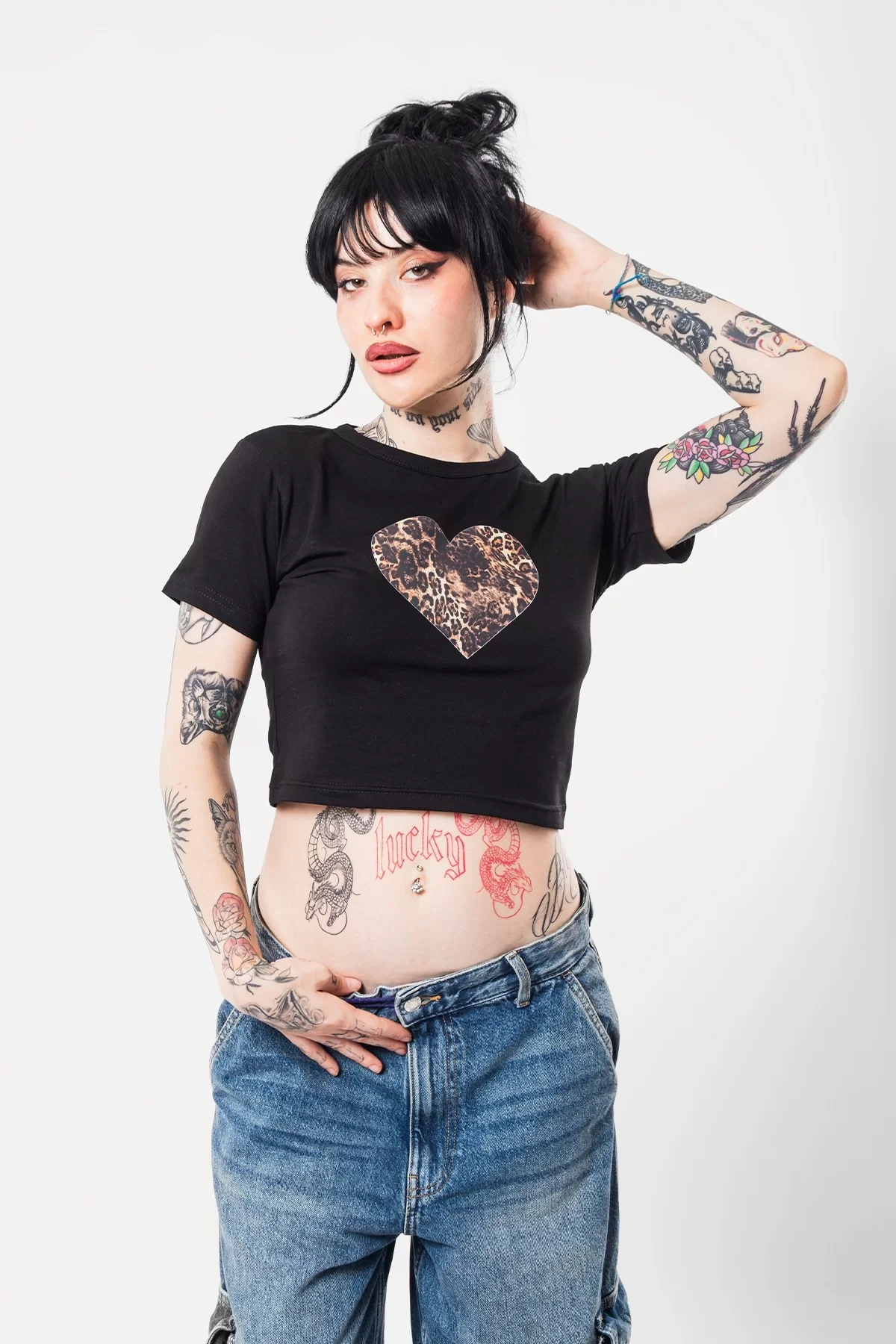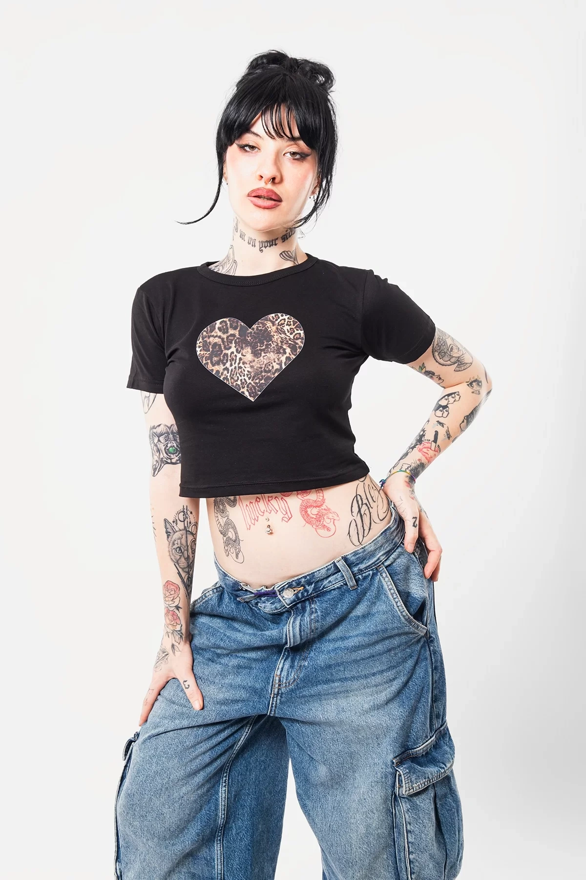 "V2" Leopar Star Baskılı Siyah Crop Top