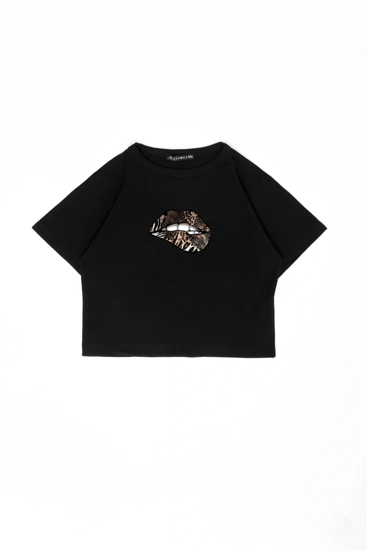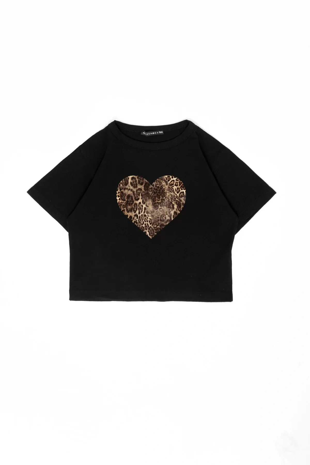 Fiyonk Leopar Baskılı Siyah Crop Top