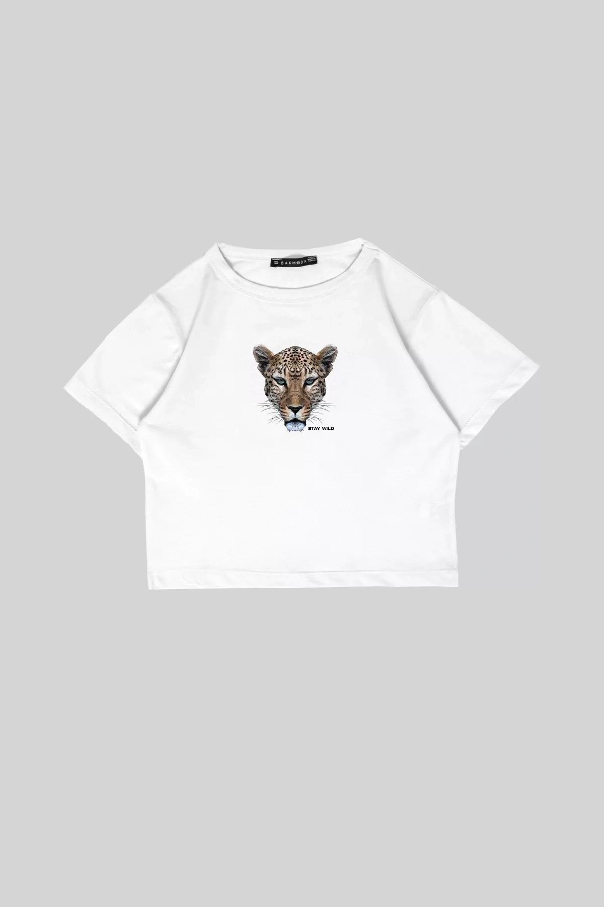 Leopar Stay Wild Baskılı Oversize Unisex Beyaz Crop Top