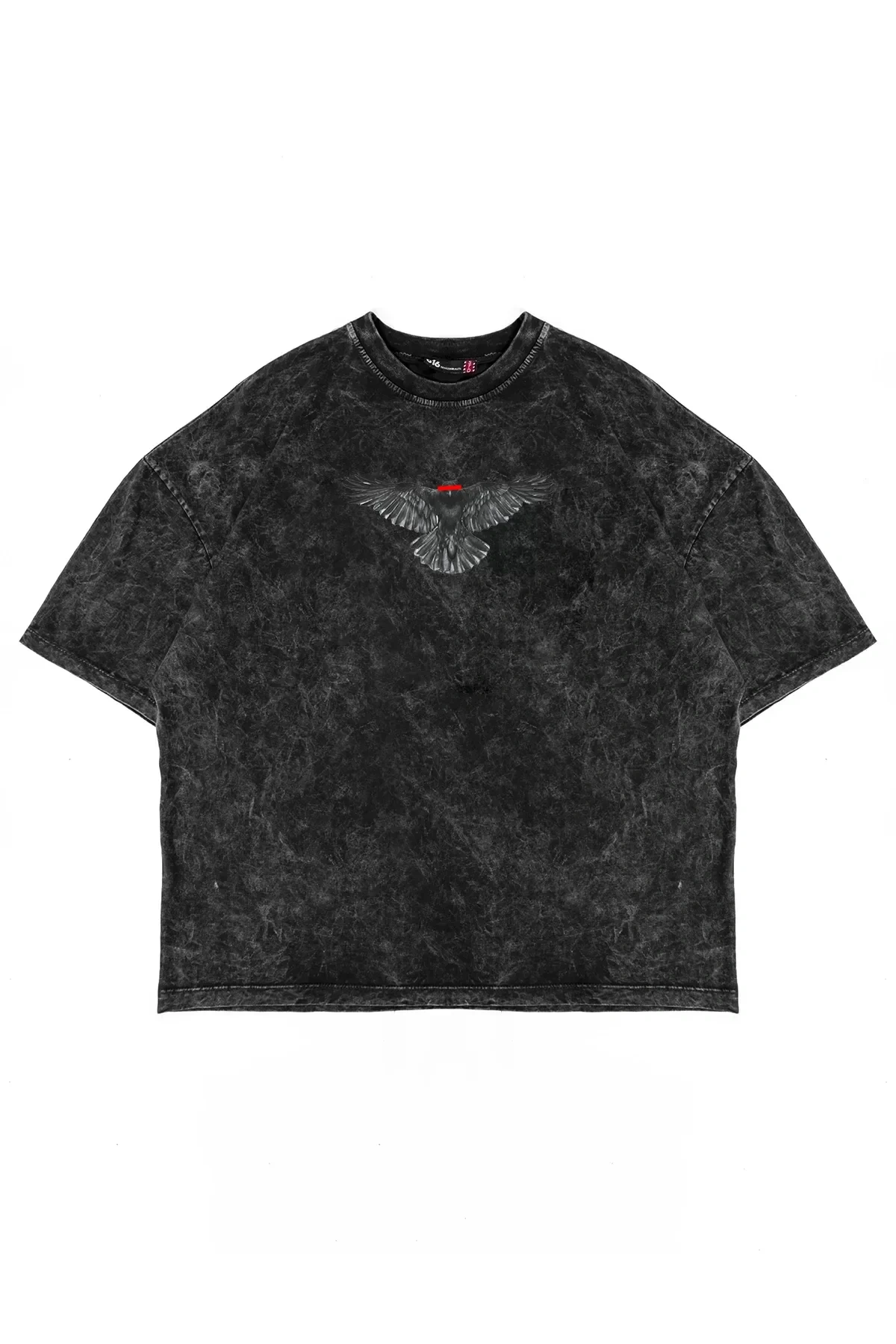 Defensive Crow Baskılı Premium Oversize Unisex Yıkamalı Siyah Tshirt