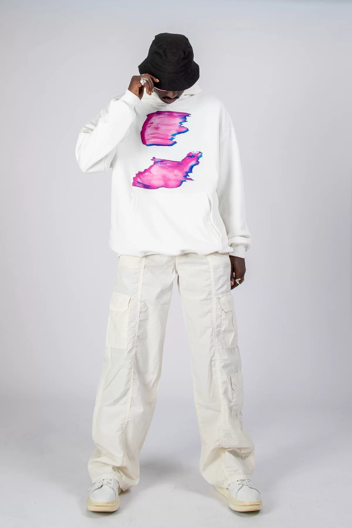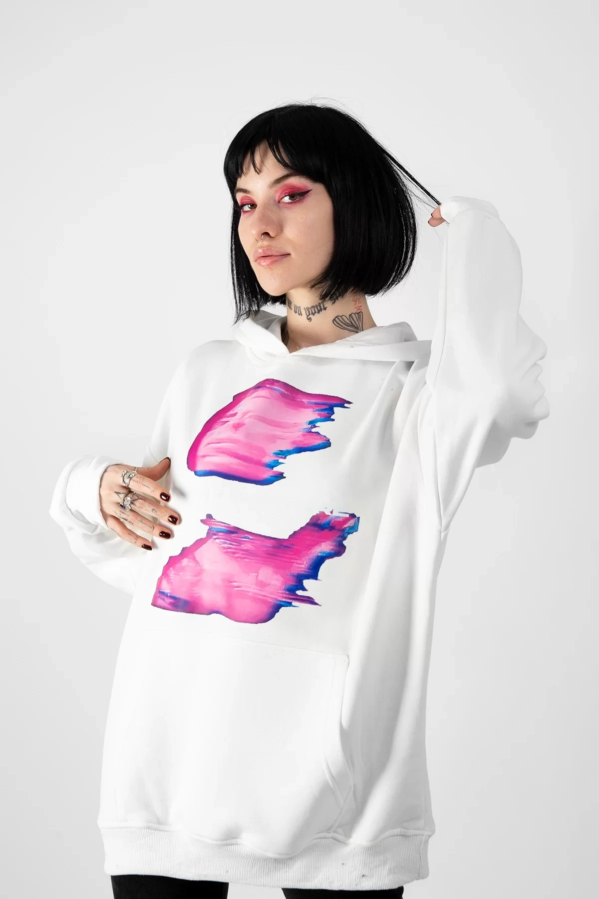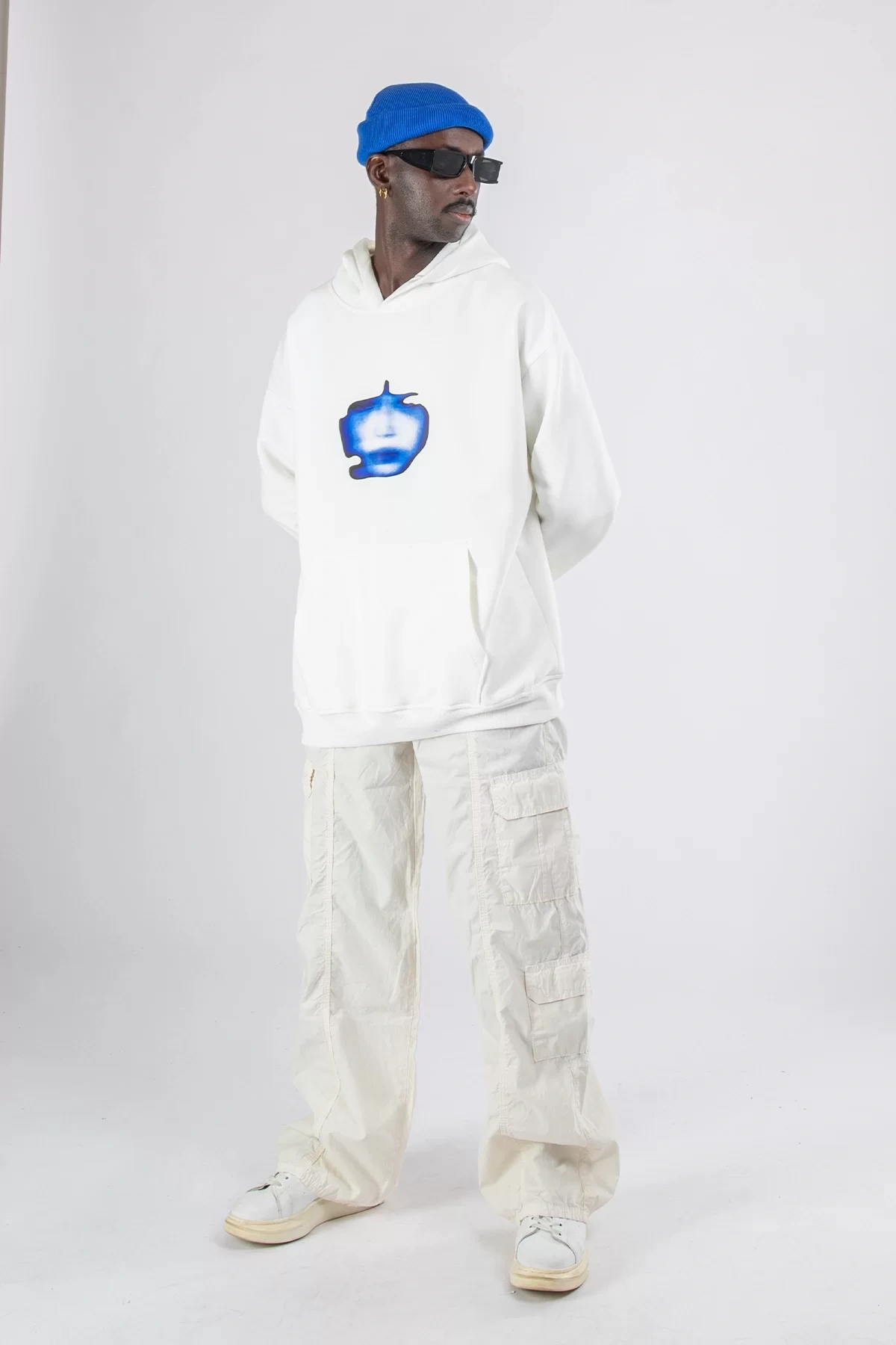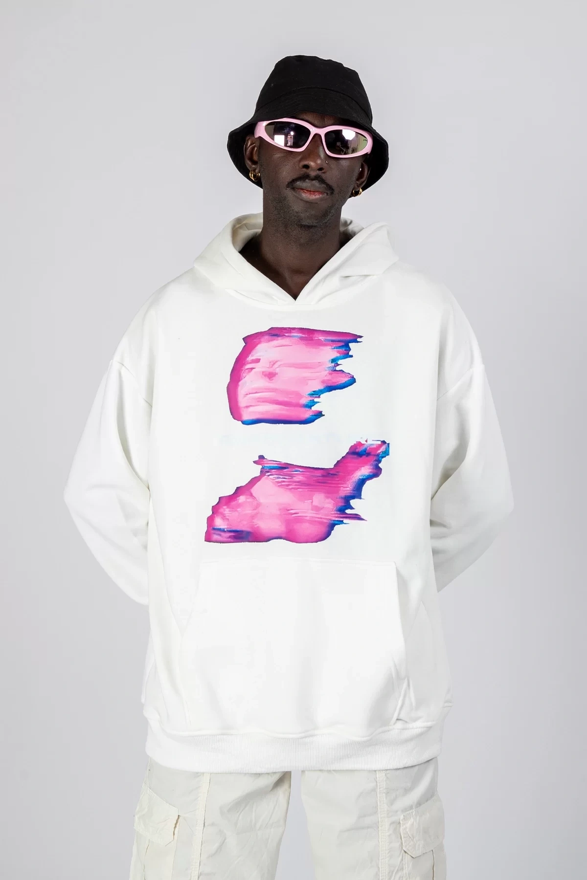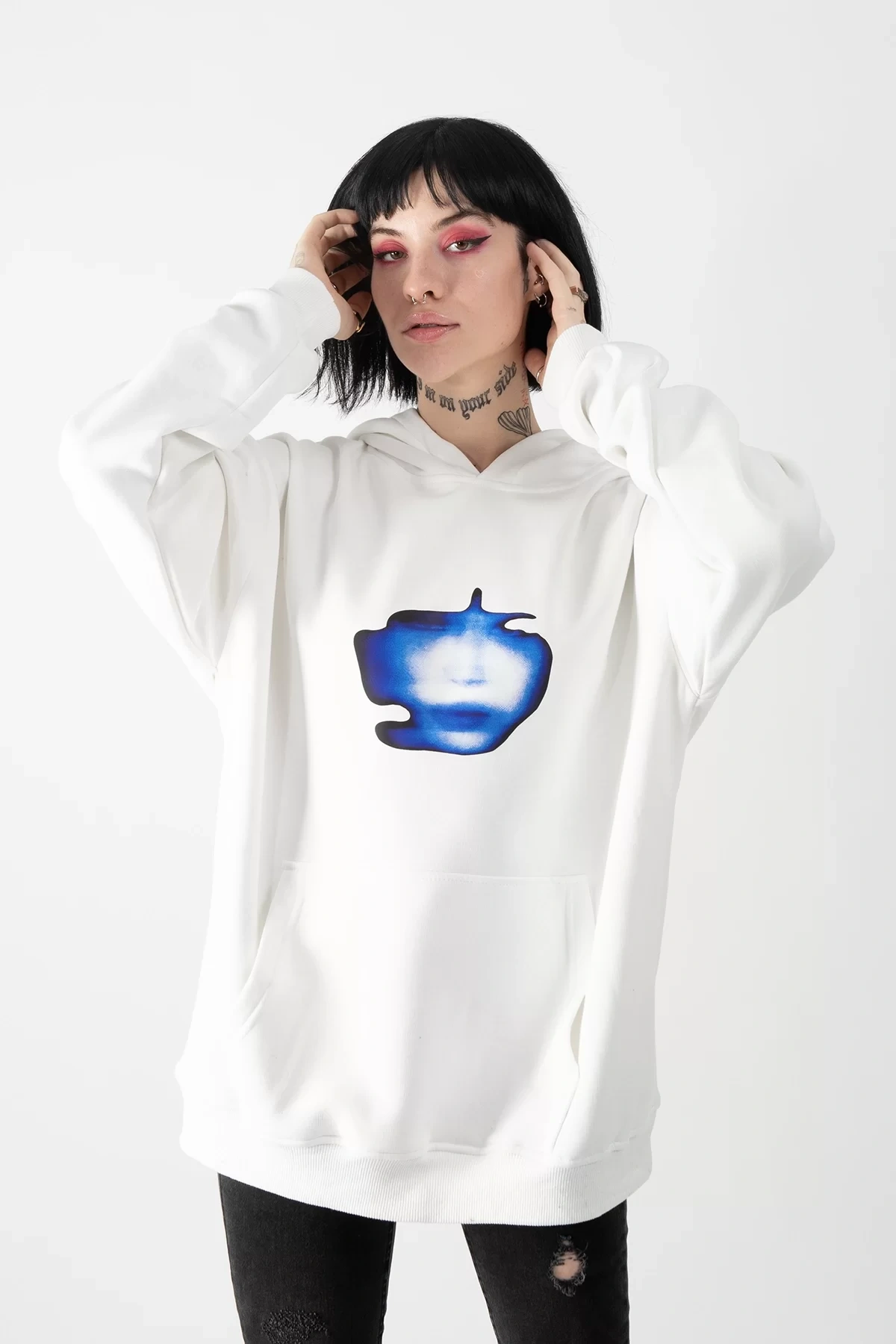 Illusion Face Baskılı Oversize Unisex Beyaz Hoodie