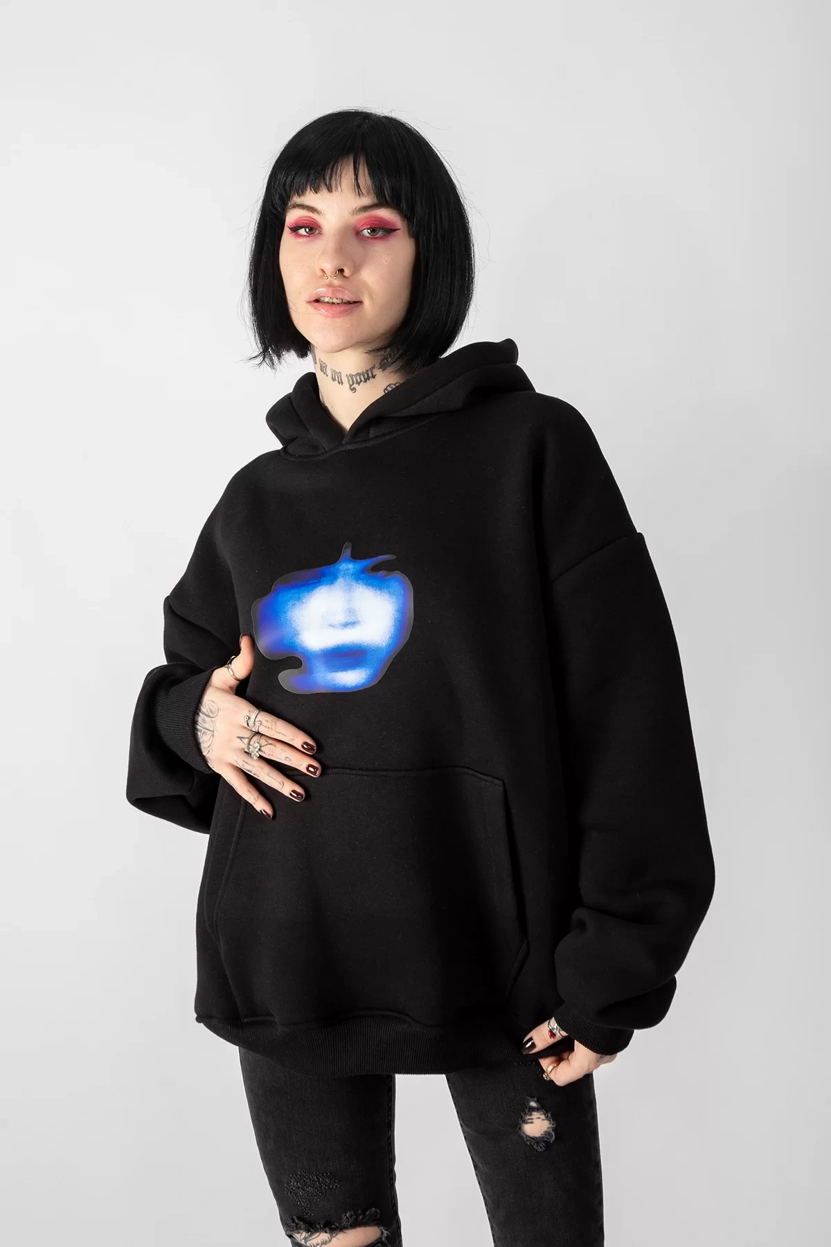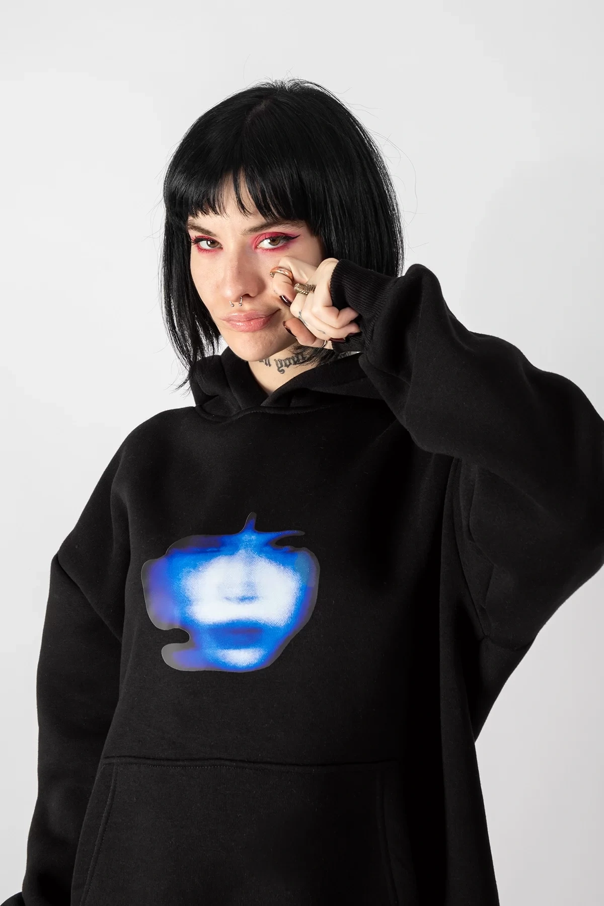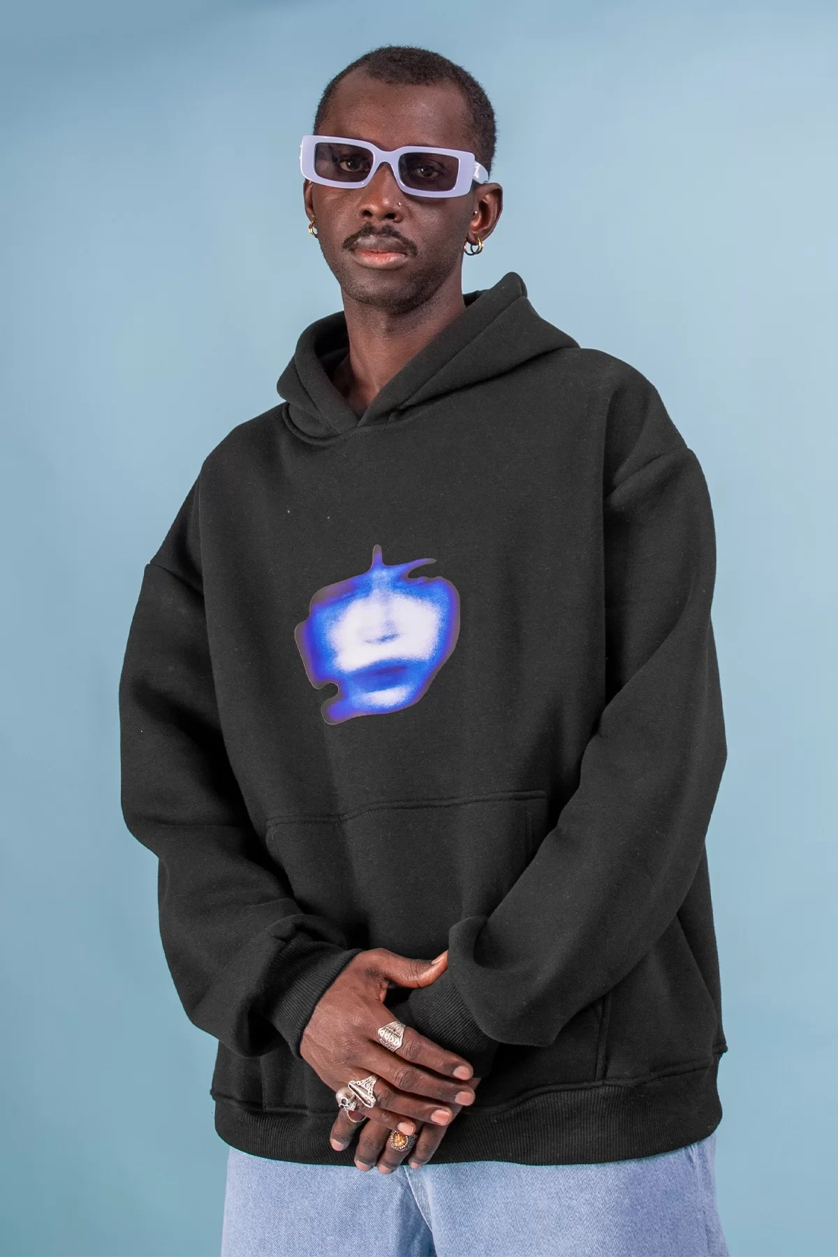 Illusion Face Baskılı Oversize Unisex Siyah Hoodie