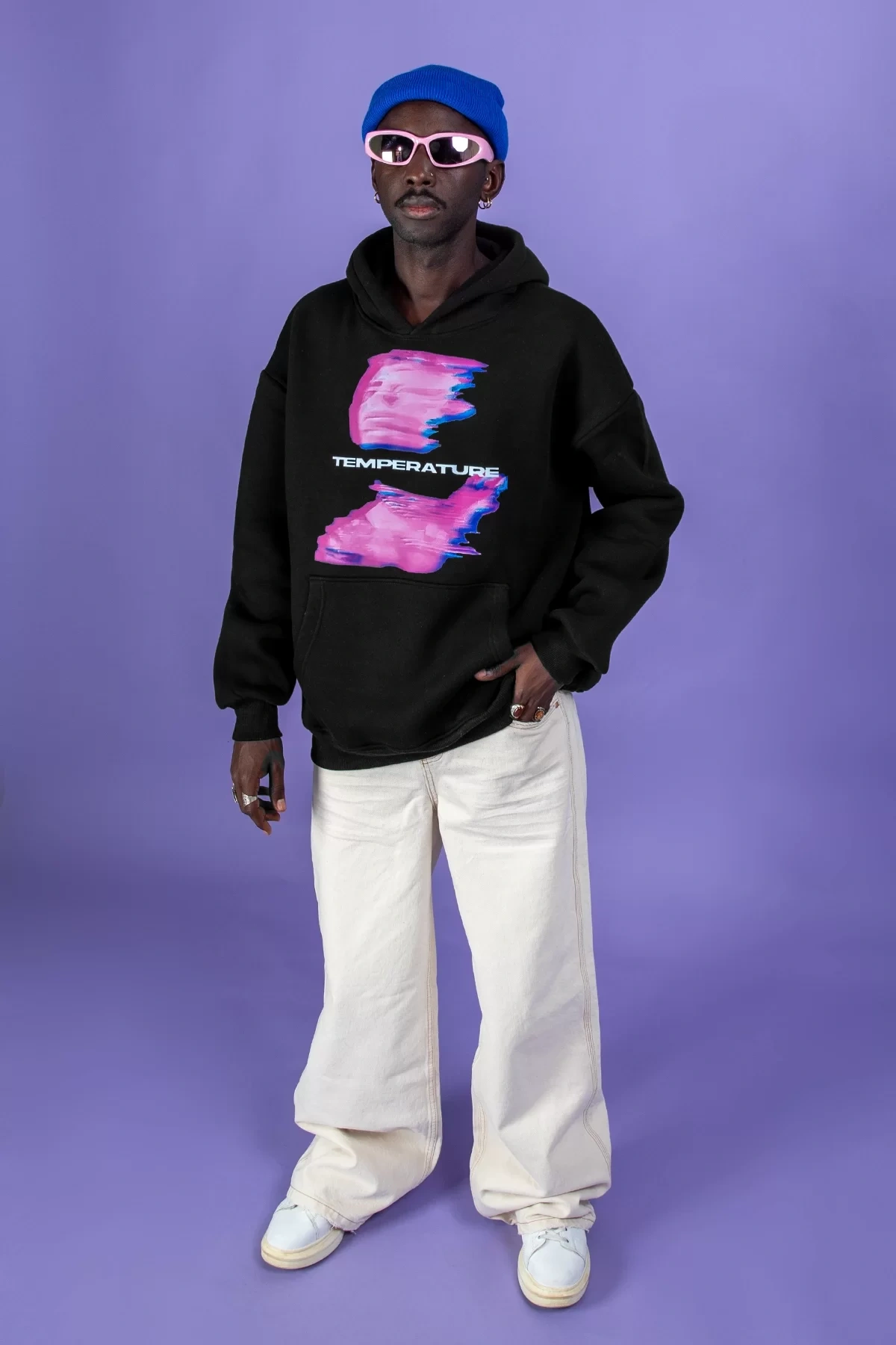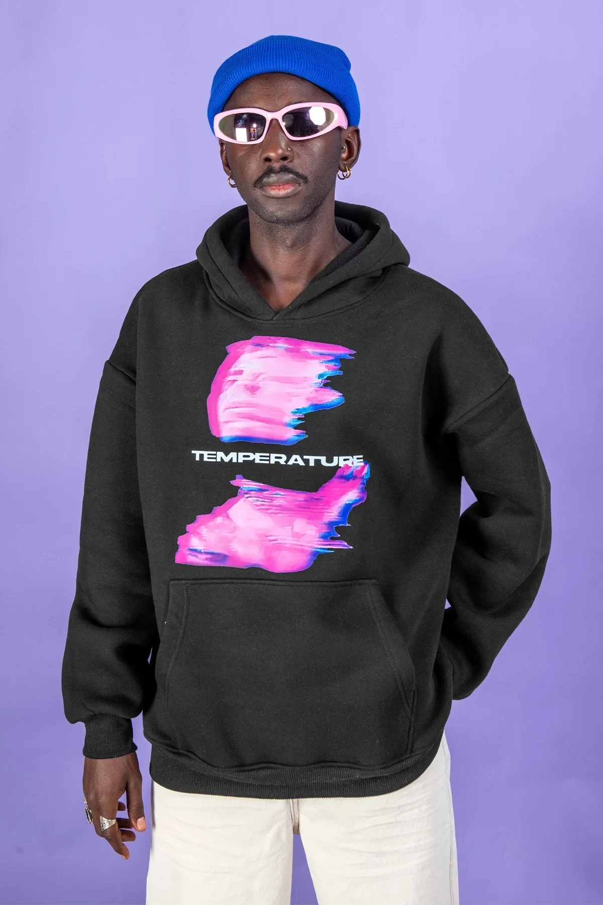 Temperature Baskılı Oversize Unisex Siyah Hoodie