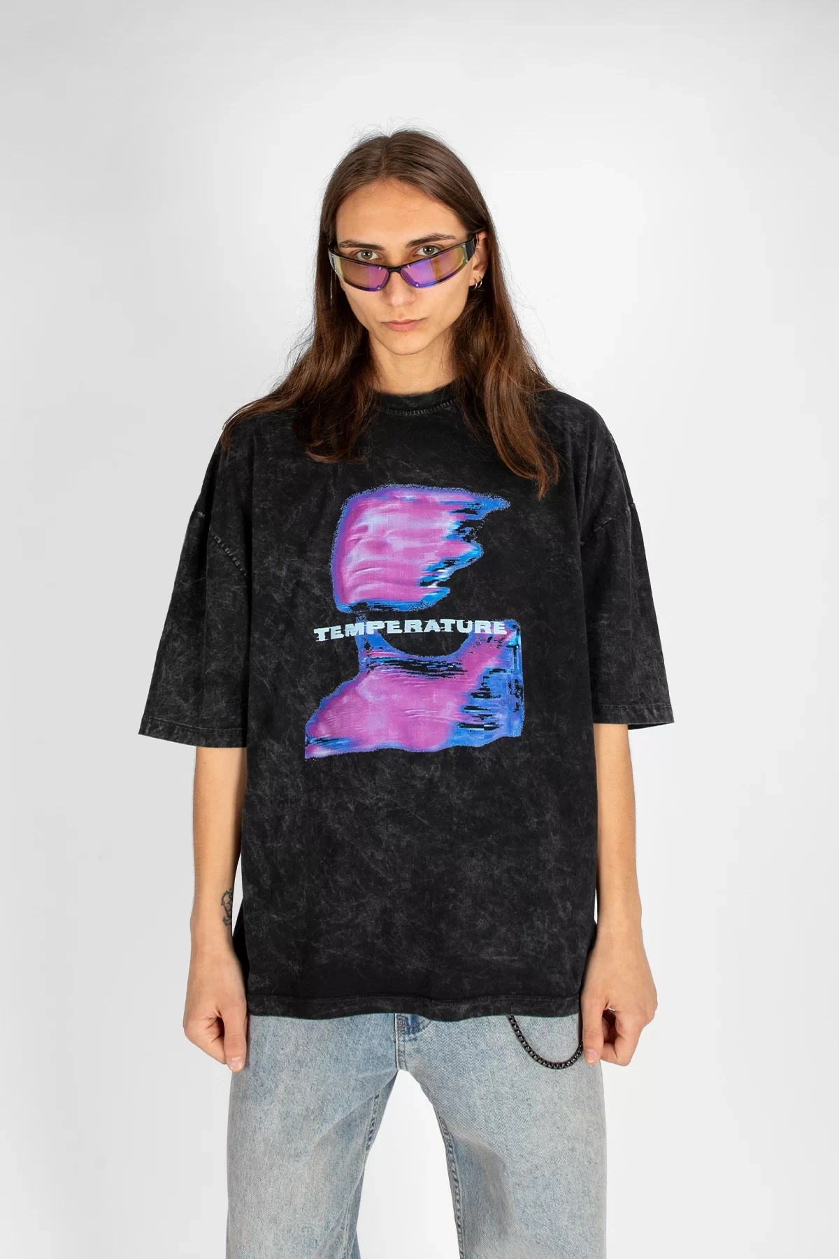 Temperature Baskılı Oversize Unisex Yıkamalı Siyah Tshirt