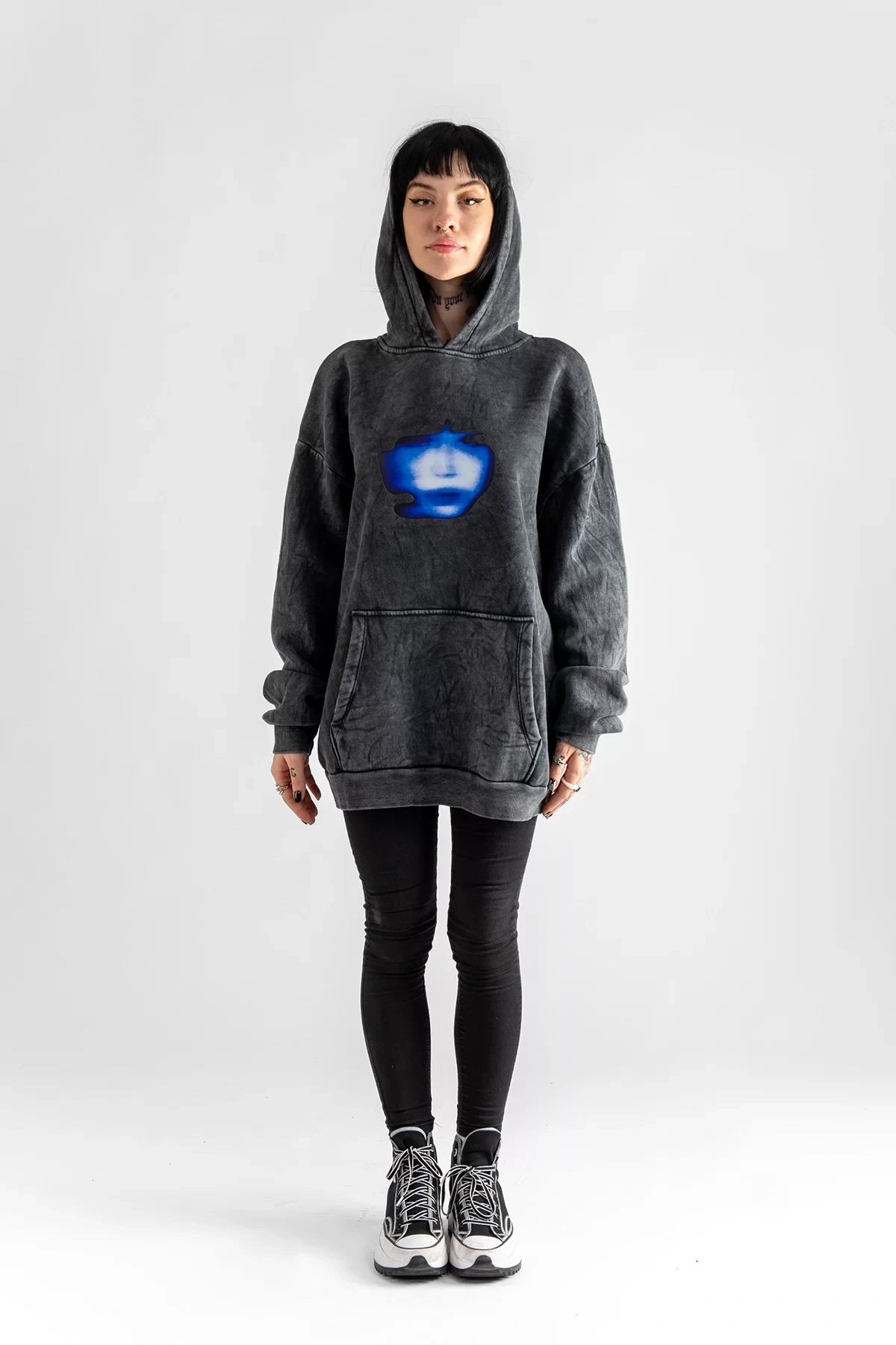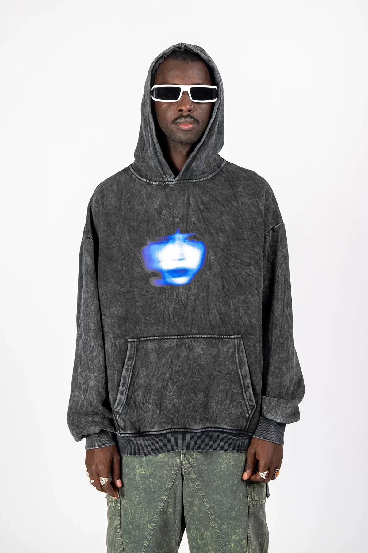 Yıkamalı Siyah Illusion Face Baskılı Oversize Unisex Hoodie