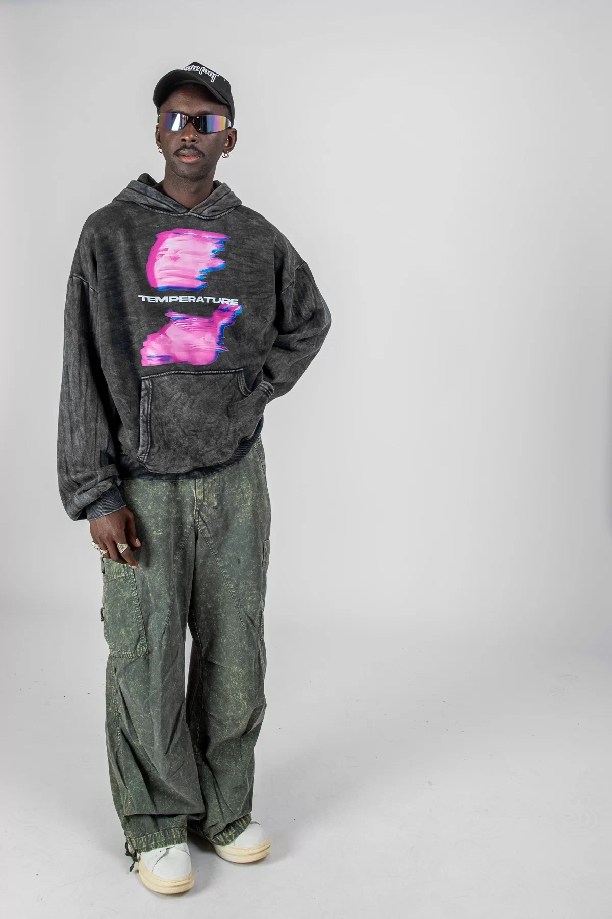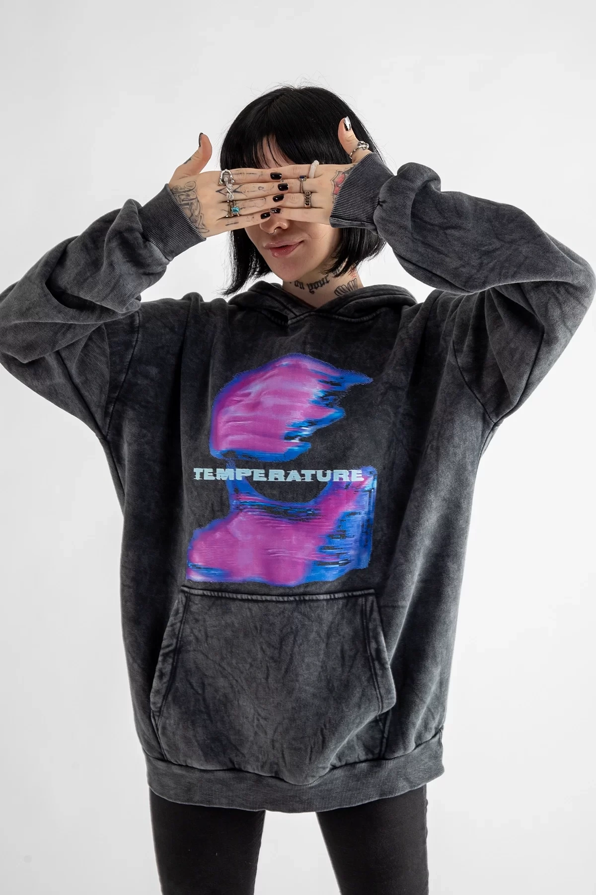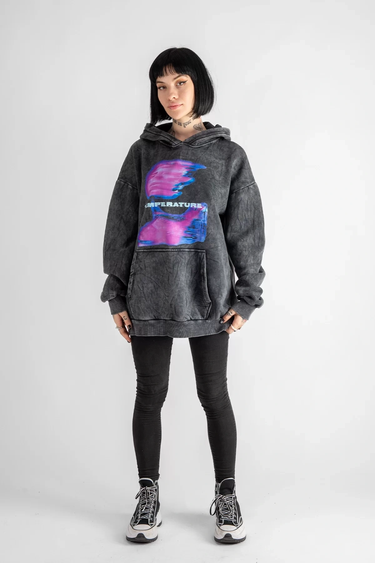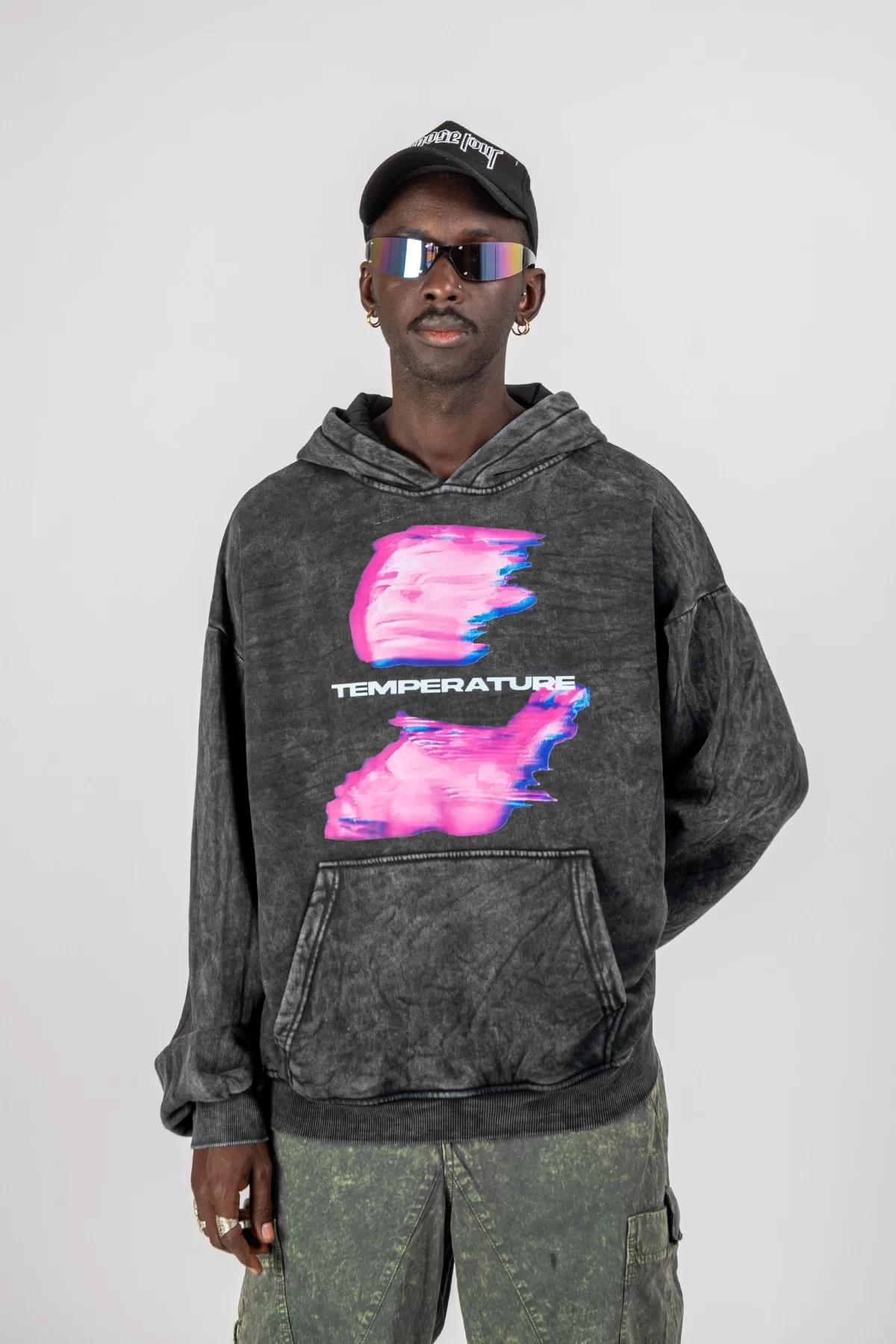 Yıkamalı Siyah Temperature Baskılı Oversize Unisex Hoodie