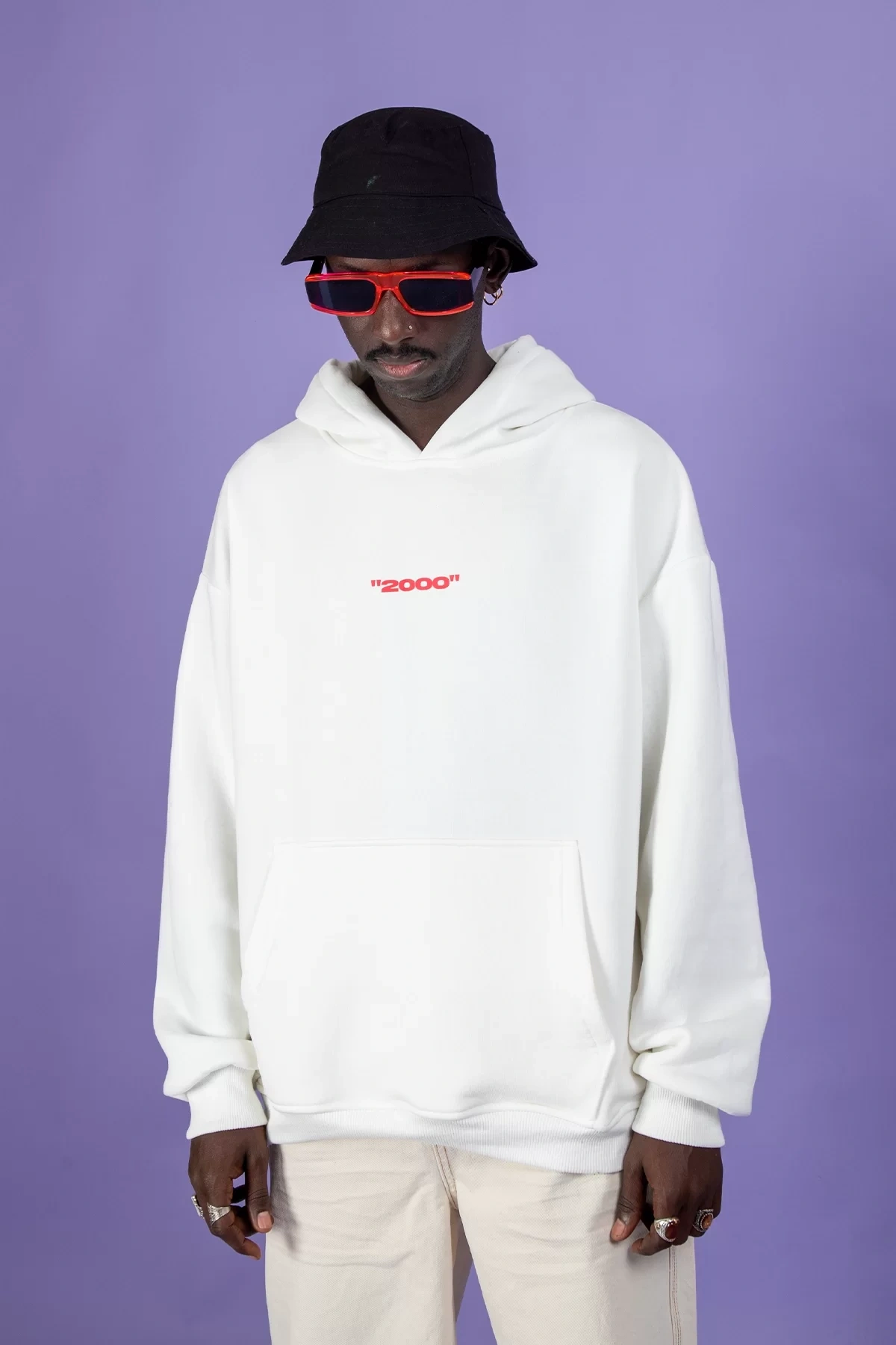 Rahat Kalıp İki İplik Termal Hand Baskılı Unisex Beyaz Hoodie
