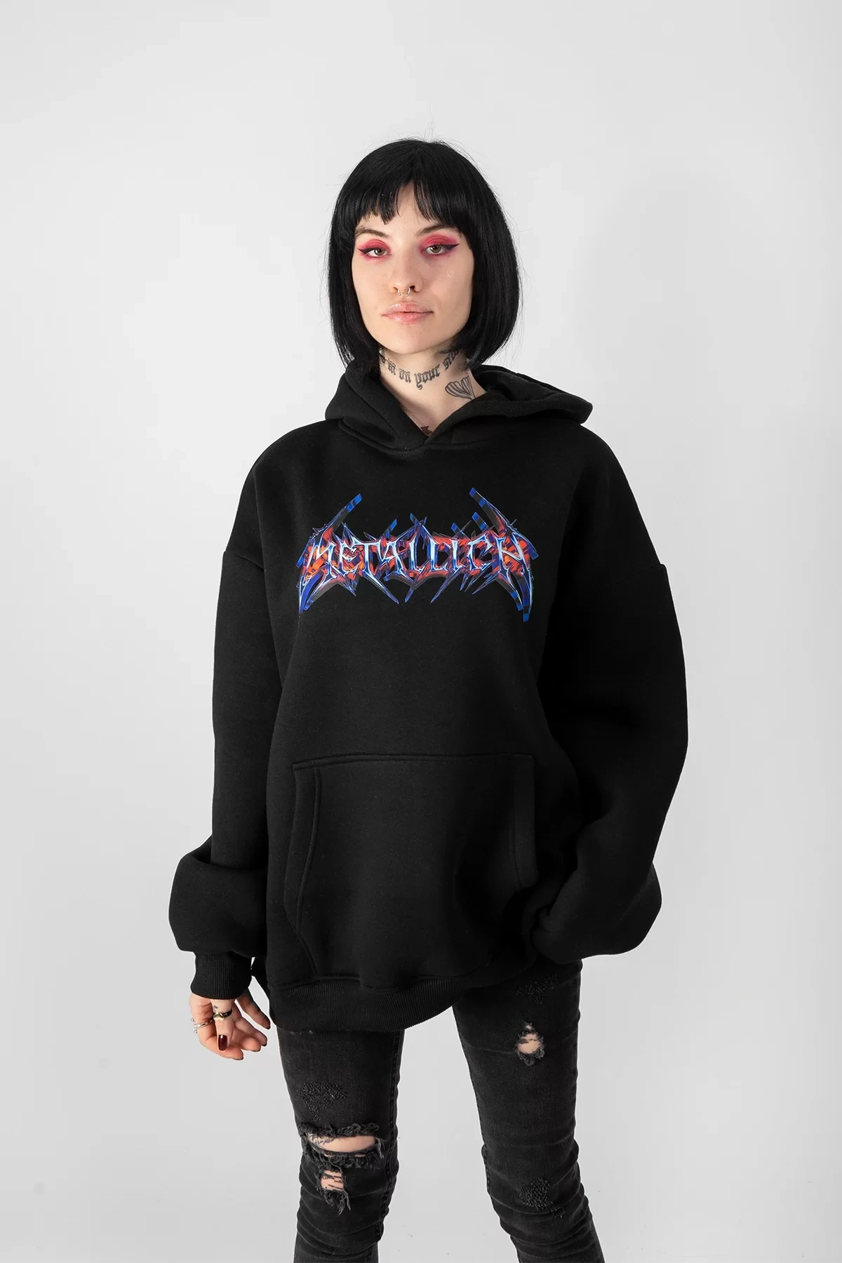 Colourful Metallica Logo Baskılı Oversize Unisex Siyah Hoodie