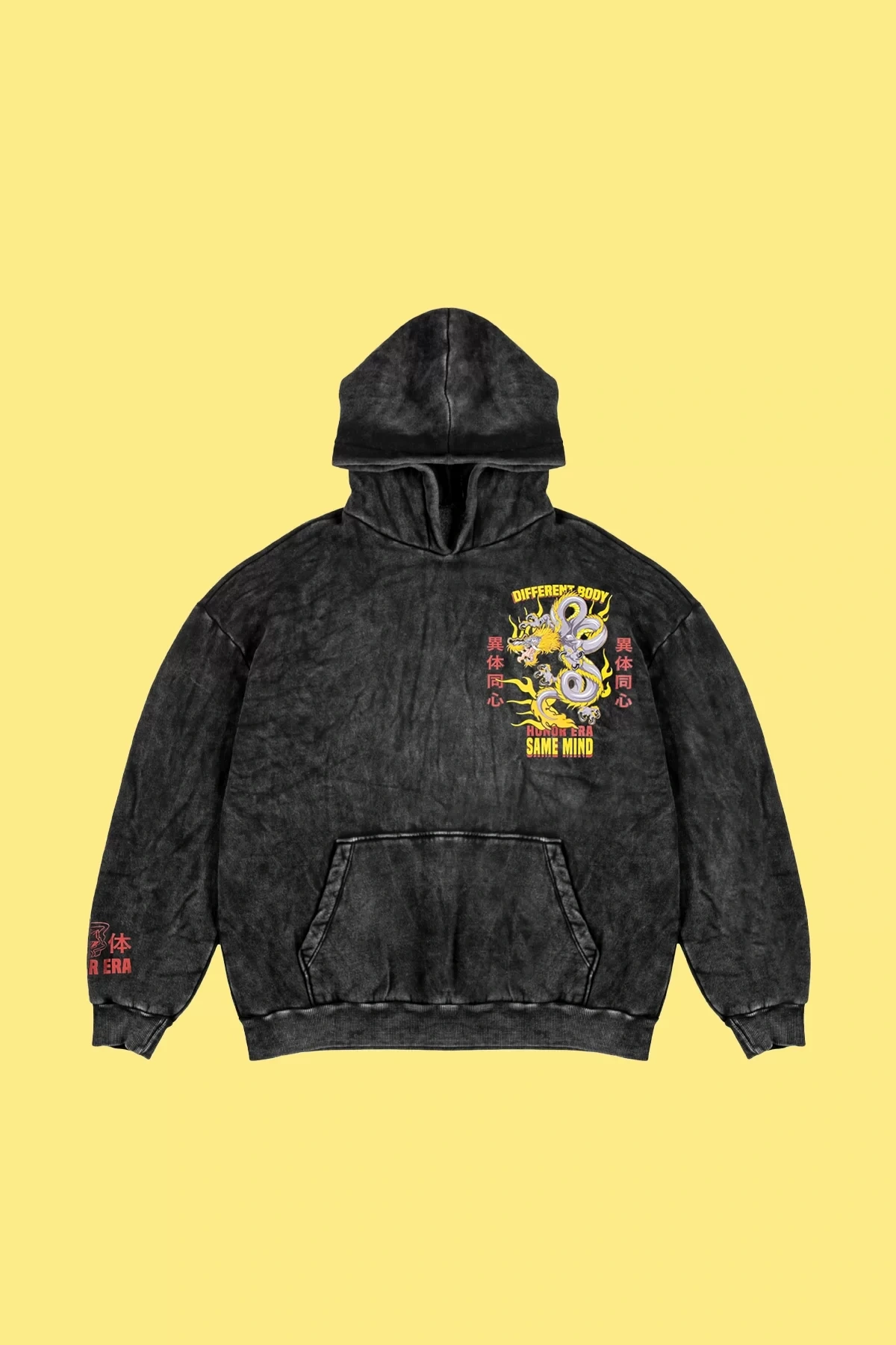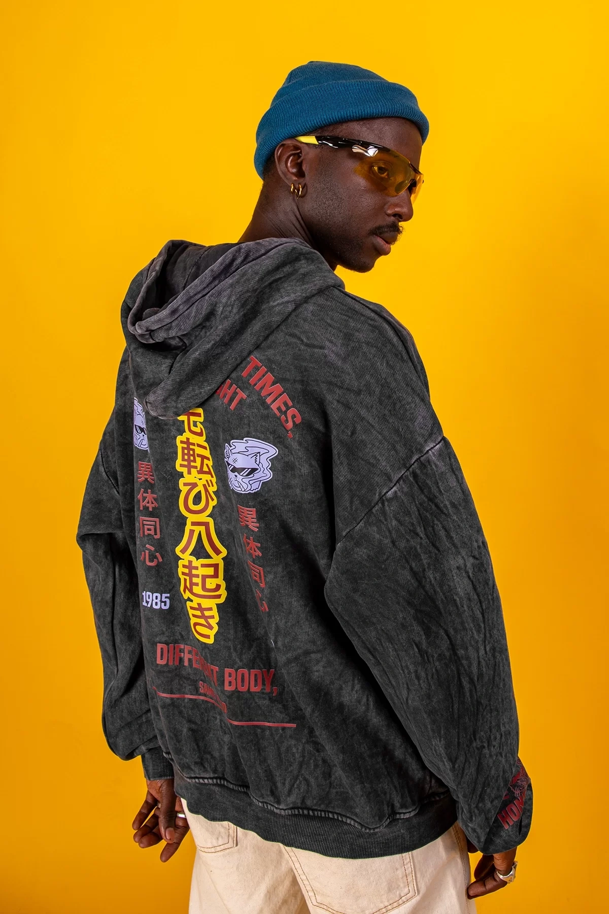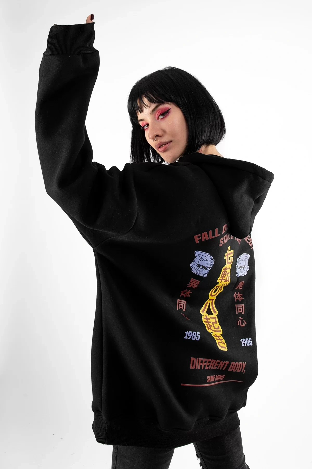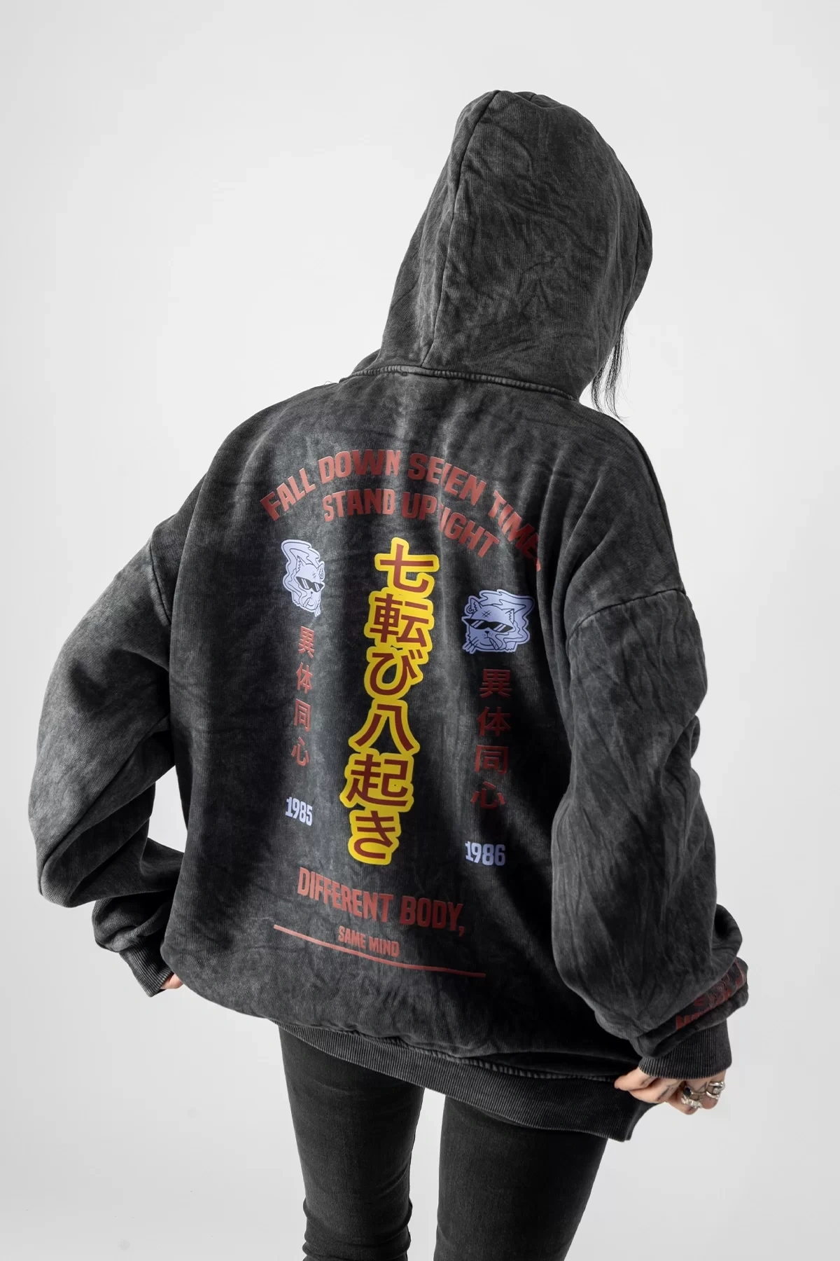 Yıkamalı Siyah Diffrent Body Sırt Baskılı Oversize Unisex Hoodie
