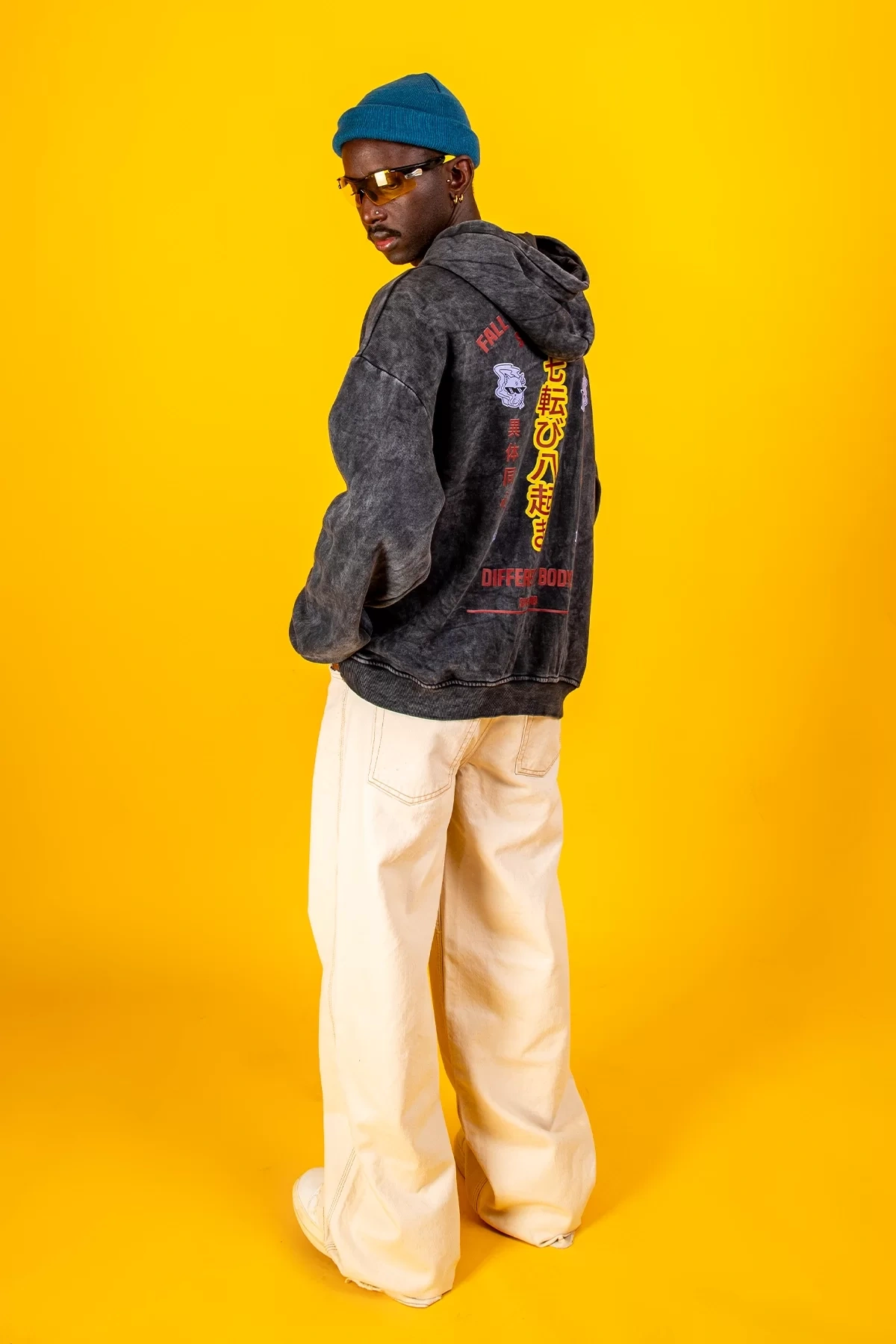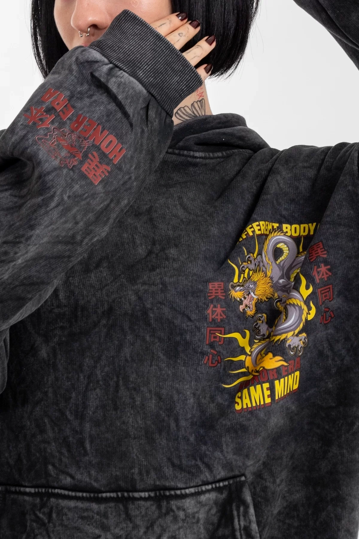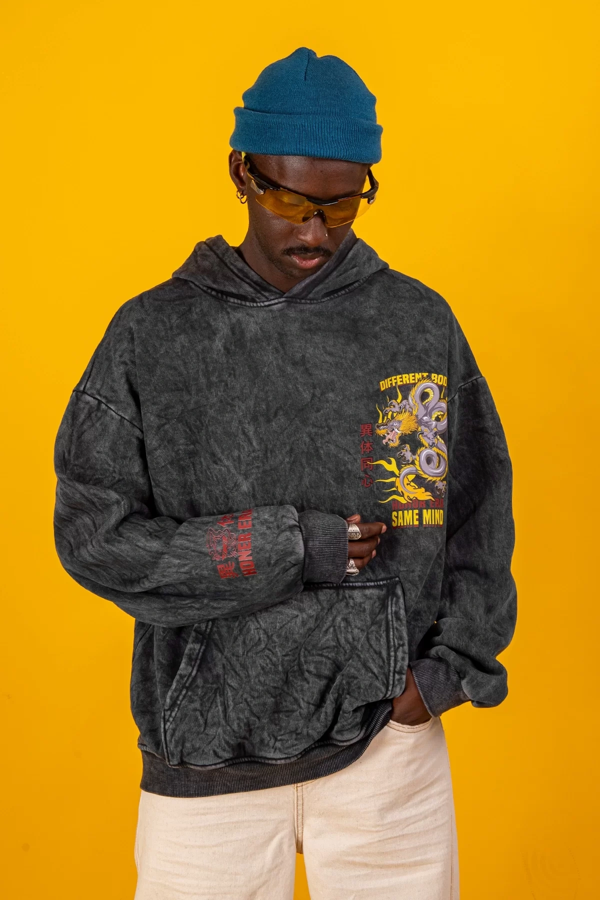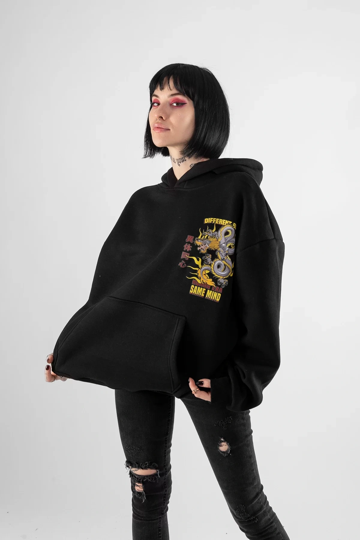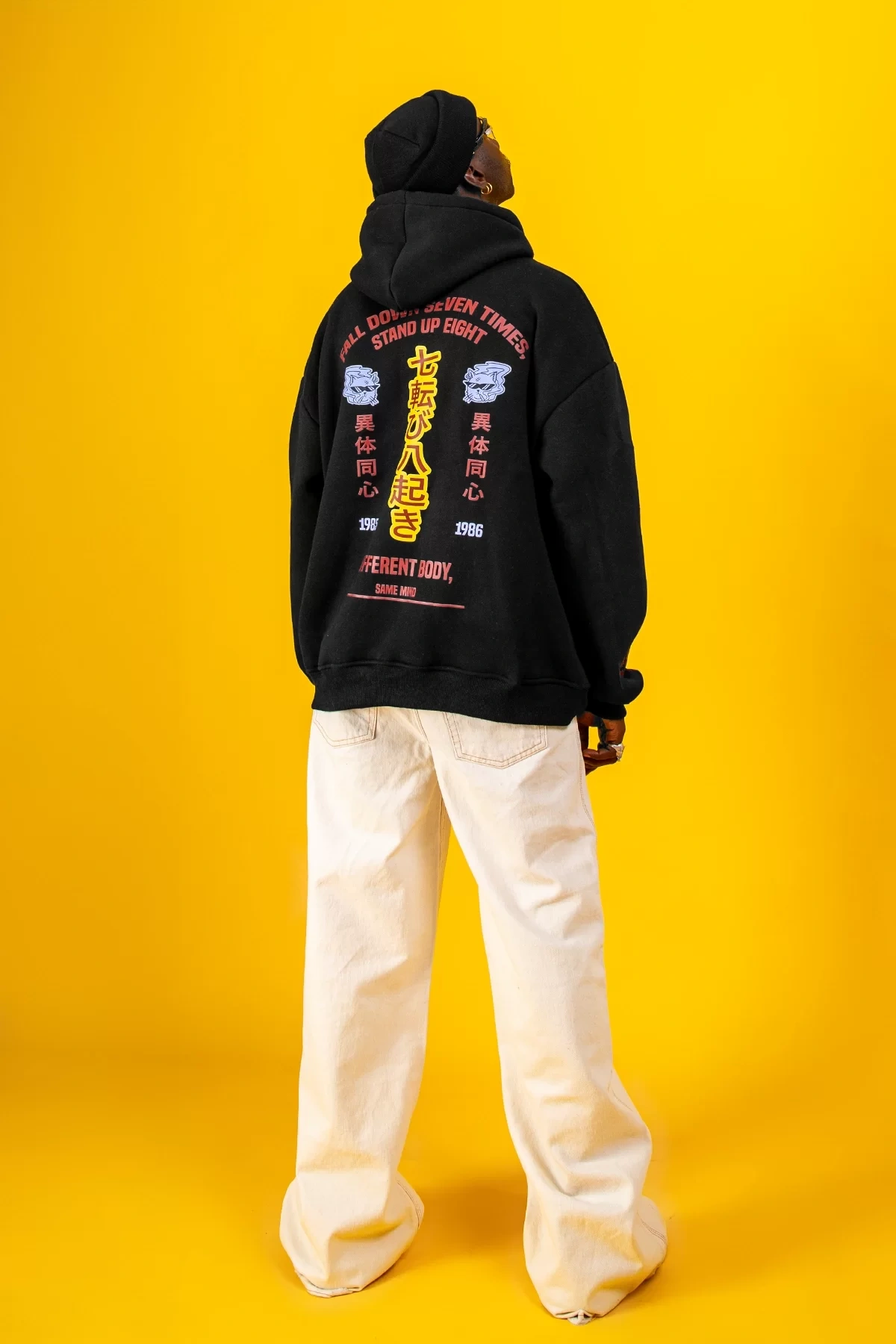 Yıkamalı Siyah Diffrent Body Sırt Baskılı Oversize Unisex Hoodie