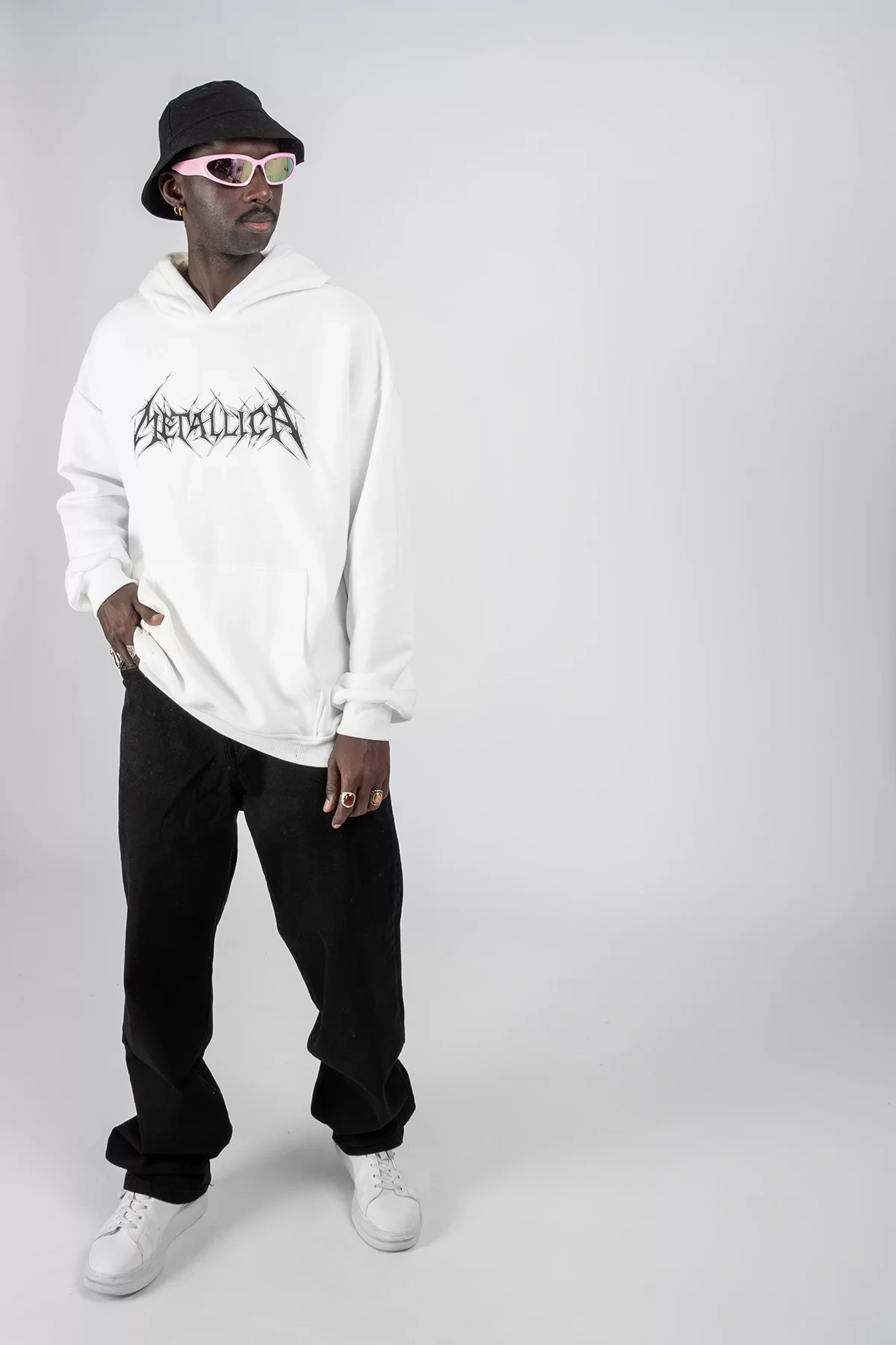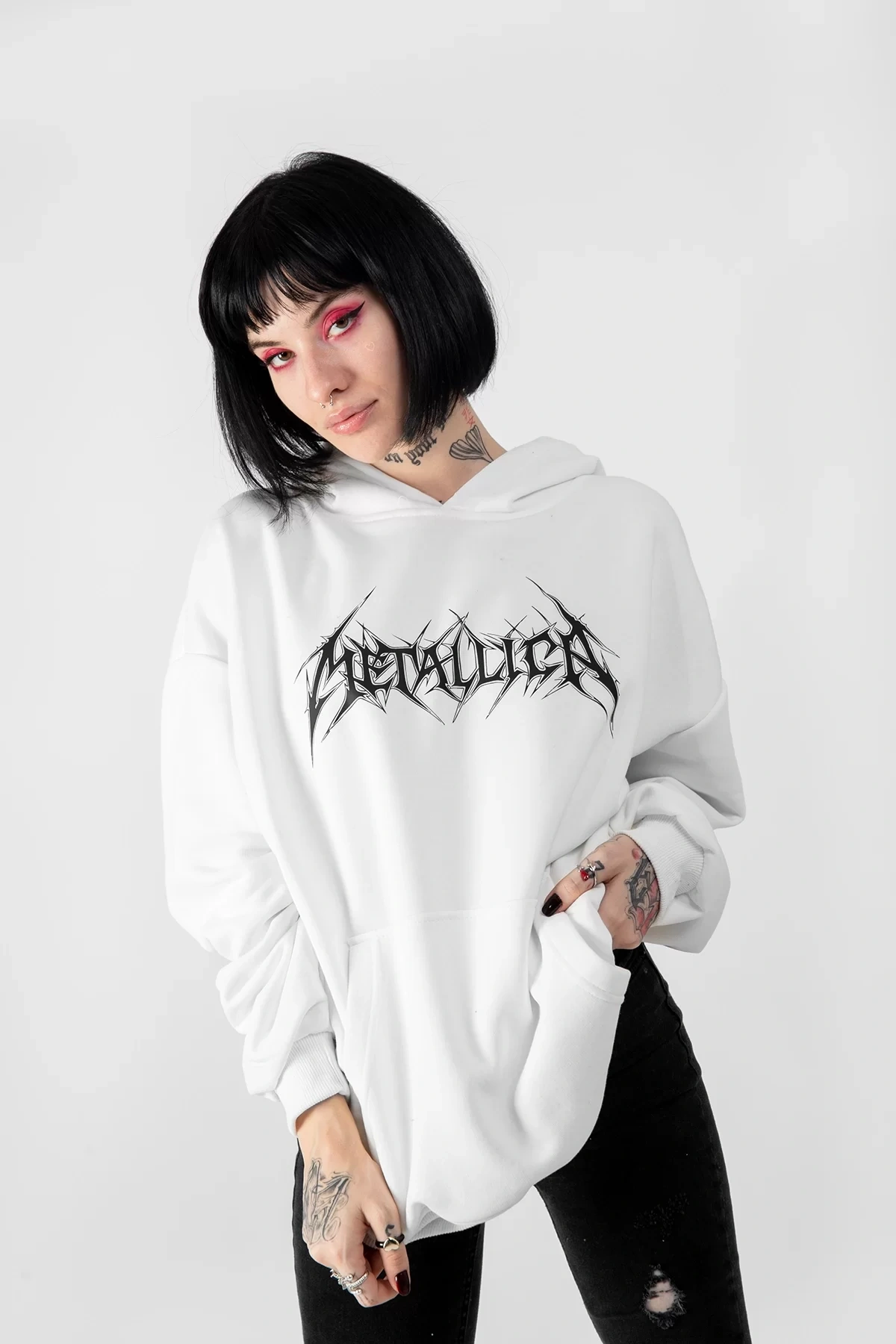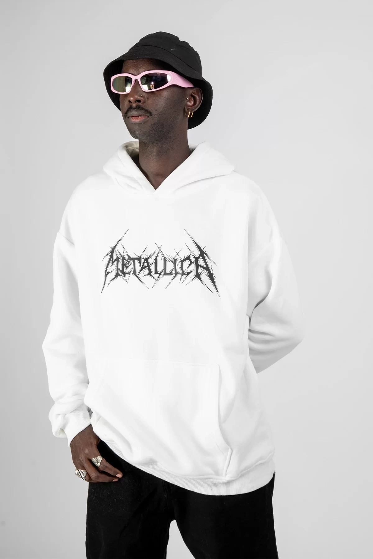 Metallica Logo Baskılı Oversize Unisex Beyaz Hoodie