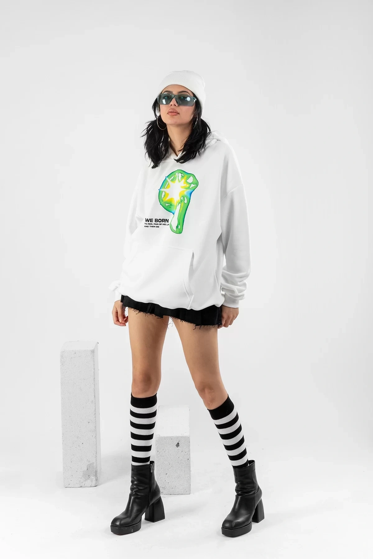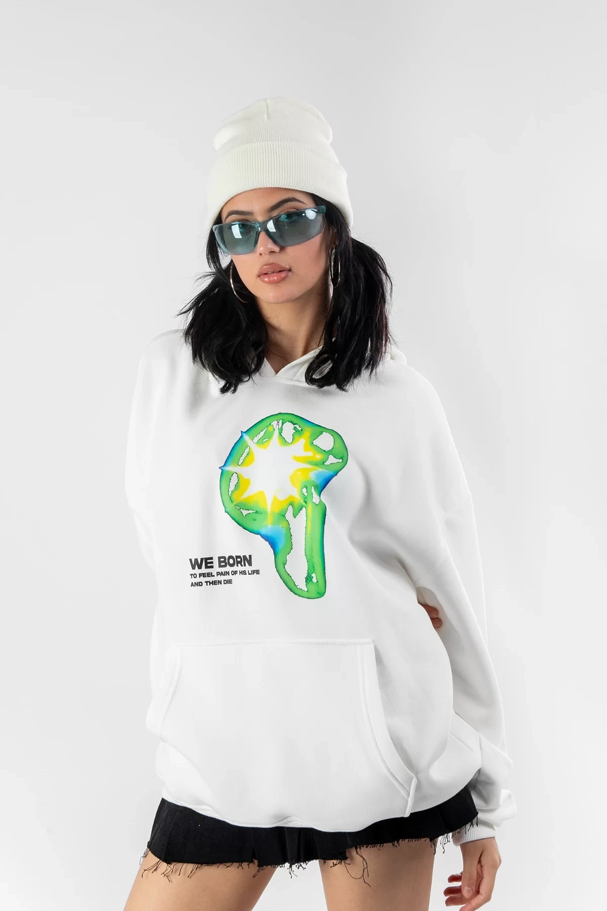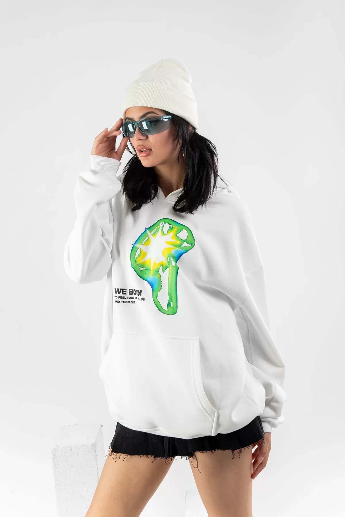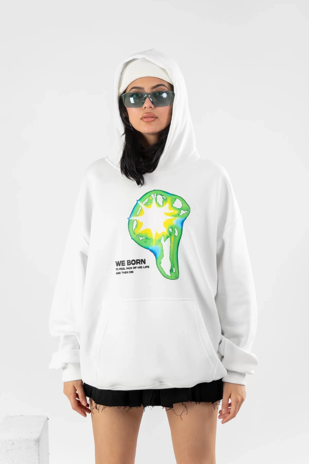 WE BORN Baskılı Oversize Unisex Beyaz Hoodie