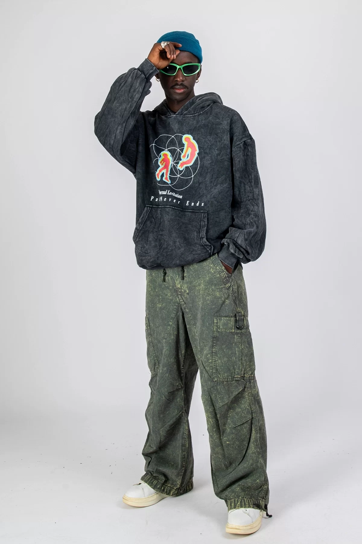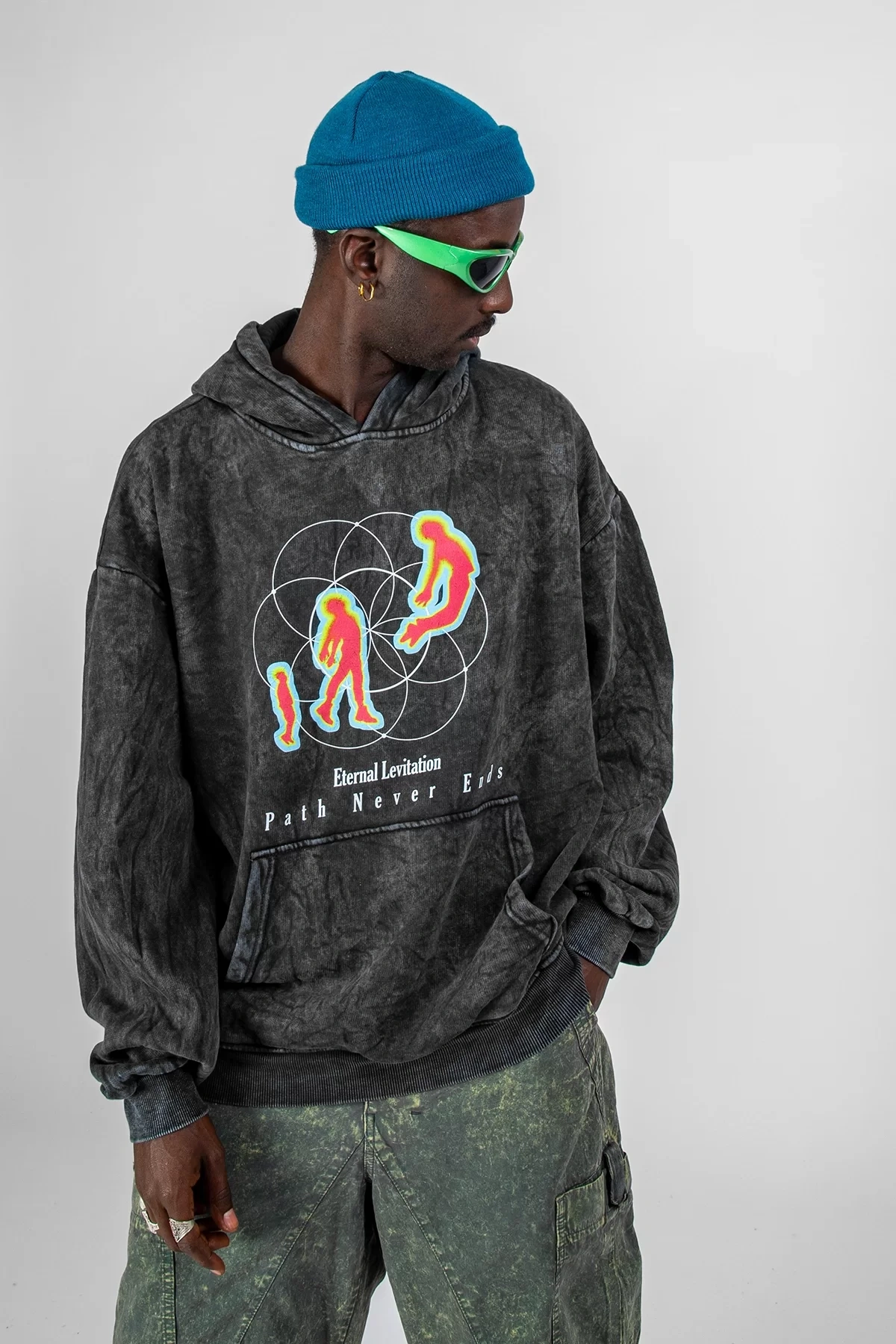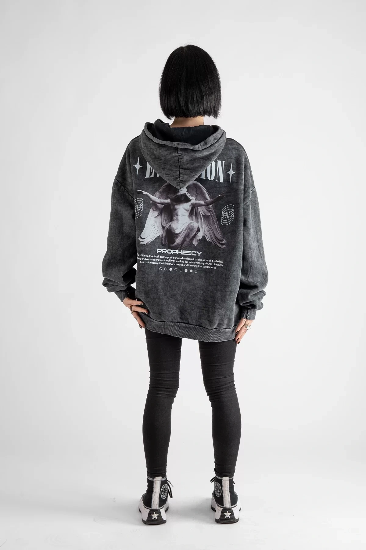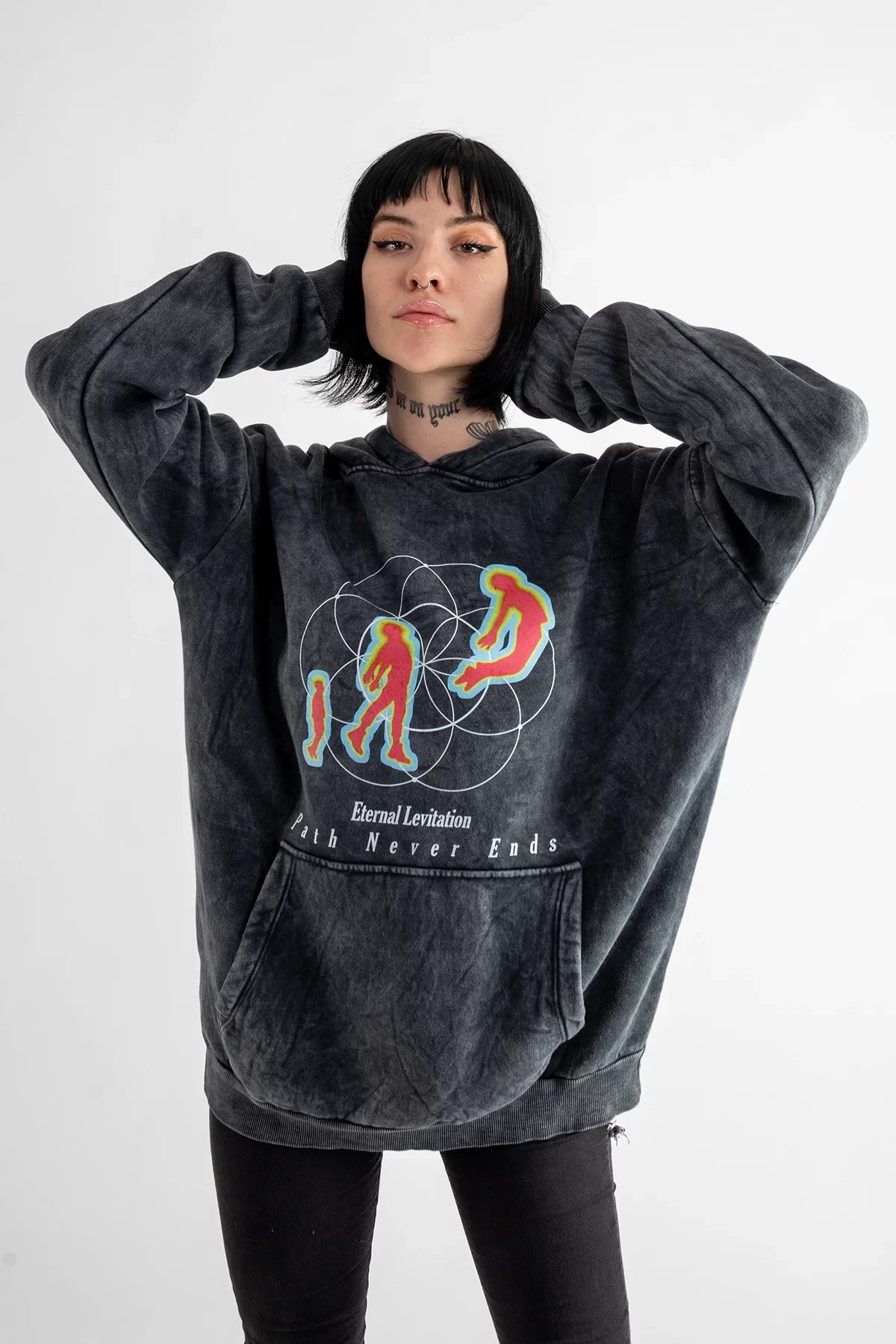 Yıkamalı Siyah Eternal Levitation Baskılı Oversize Unisex Hoodie