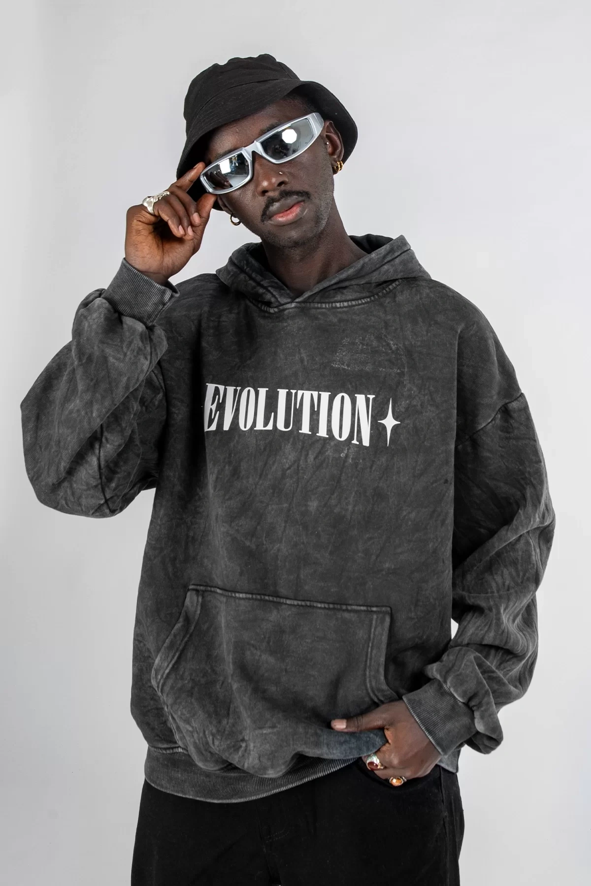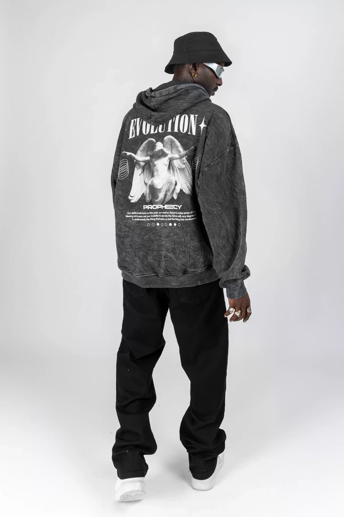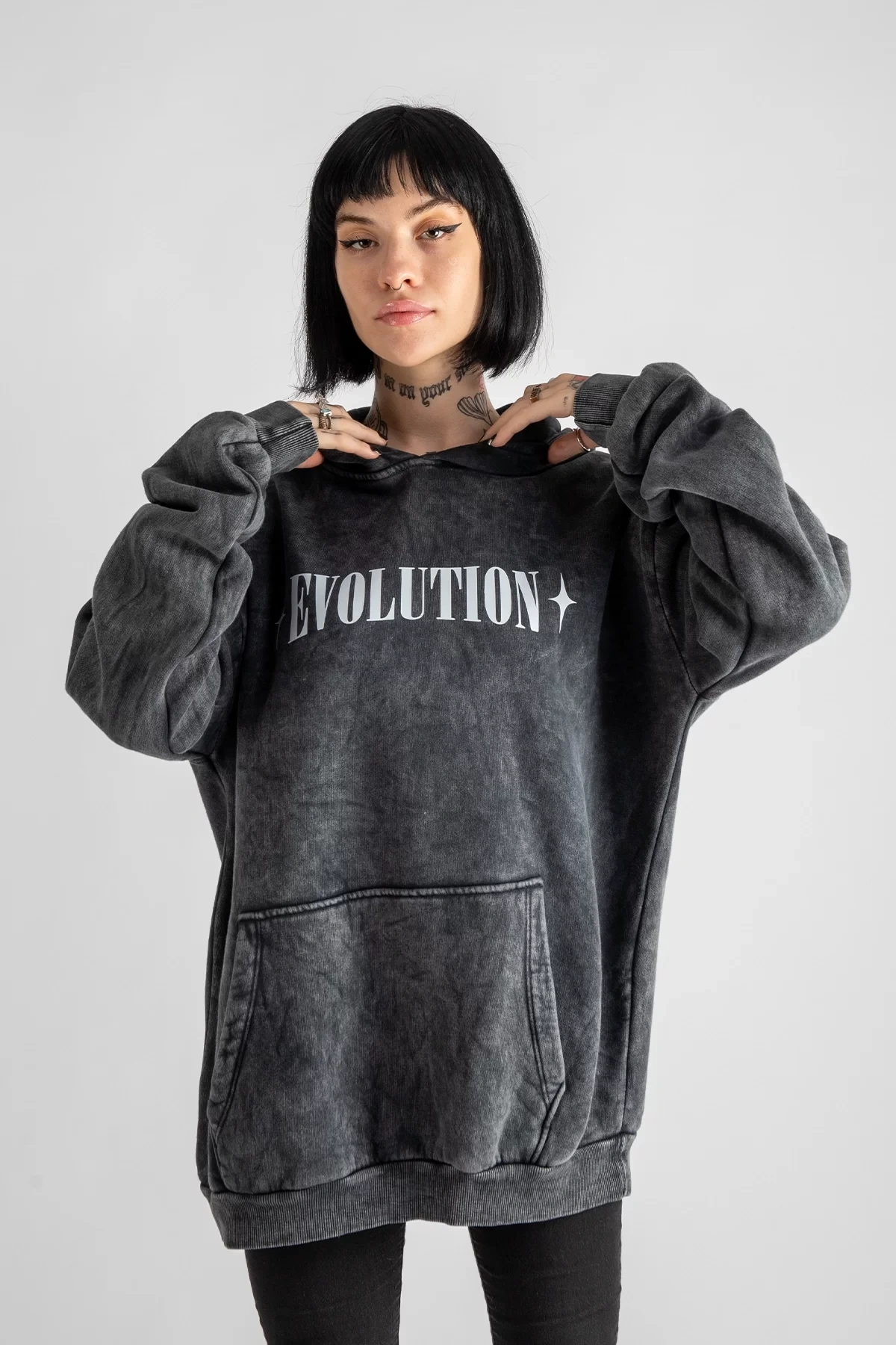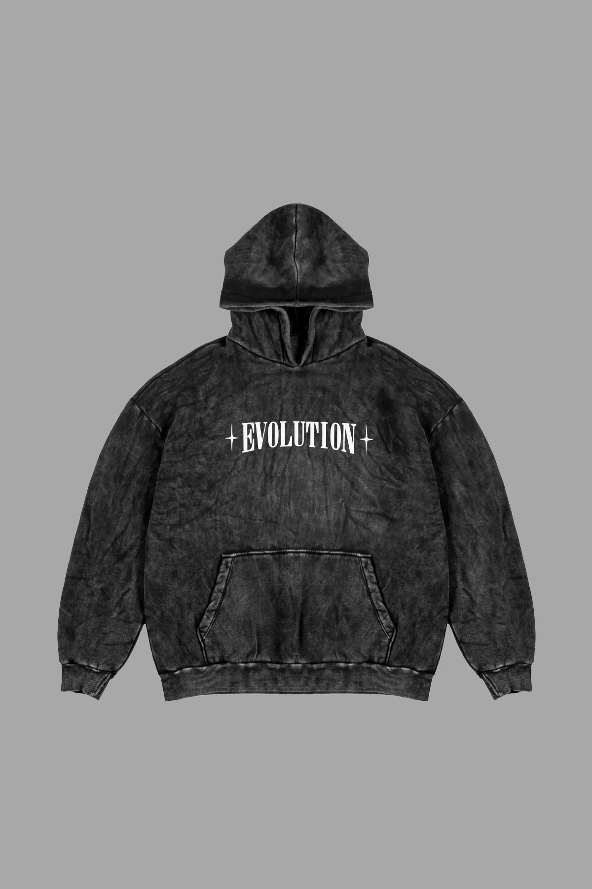 Yıkamalı Siyah Evolution Baskılı Oversize Unisex Kapüşonlu Hoodie