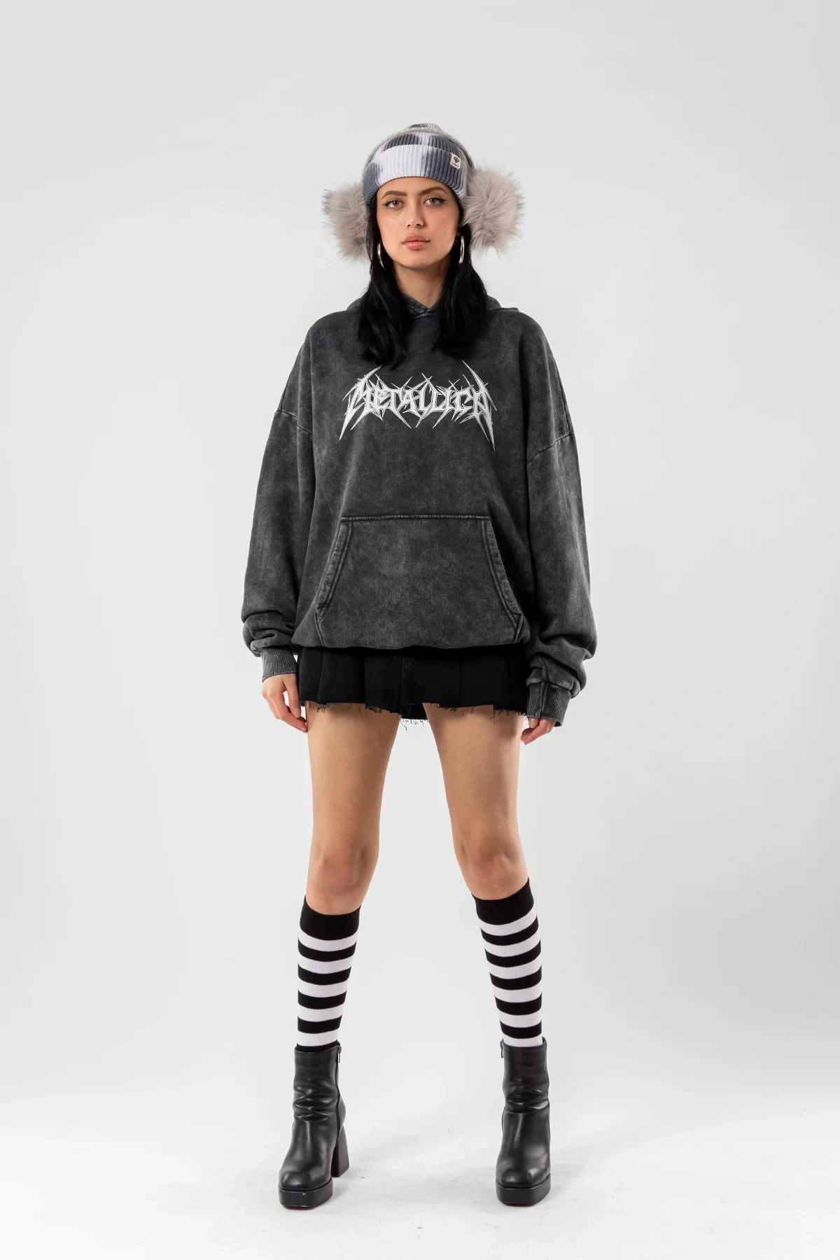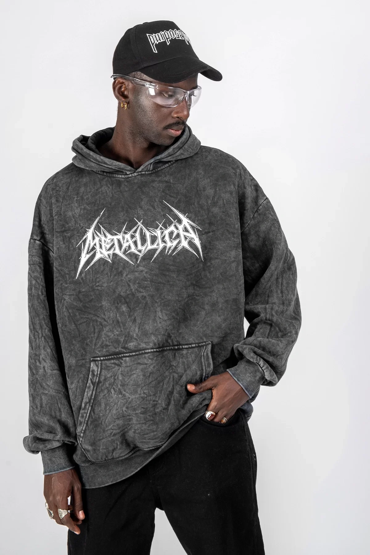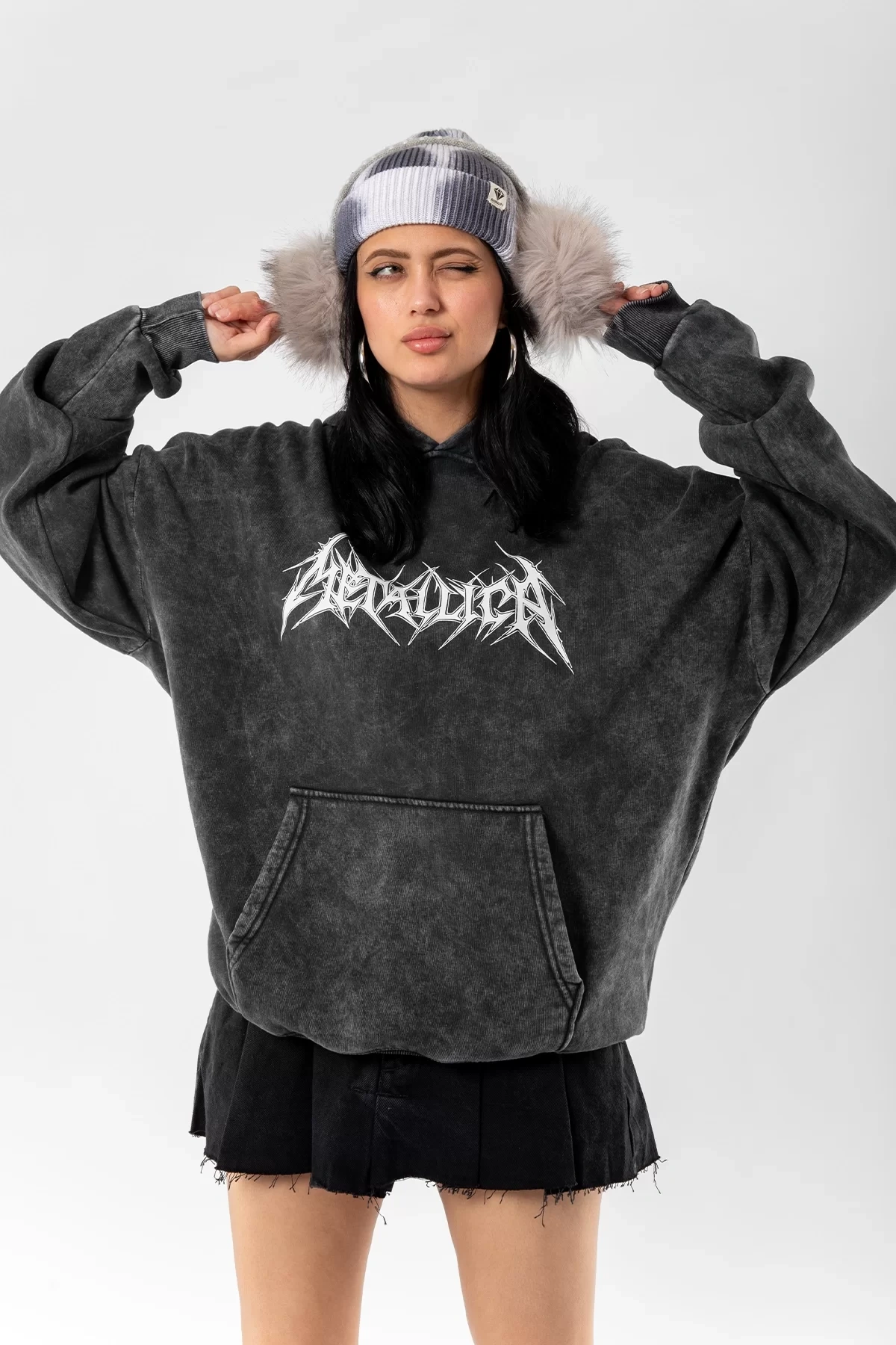 Yıkamalı Siyah Metallica Logo Baskılı Oversize Unisex Hoodie