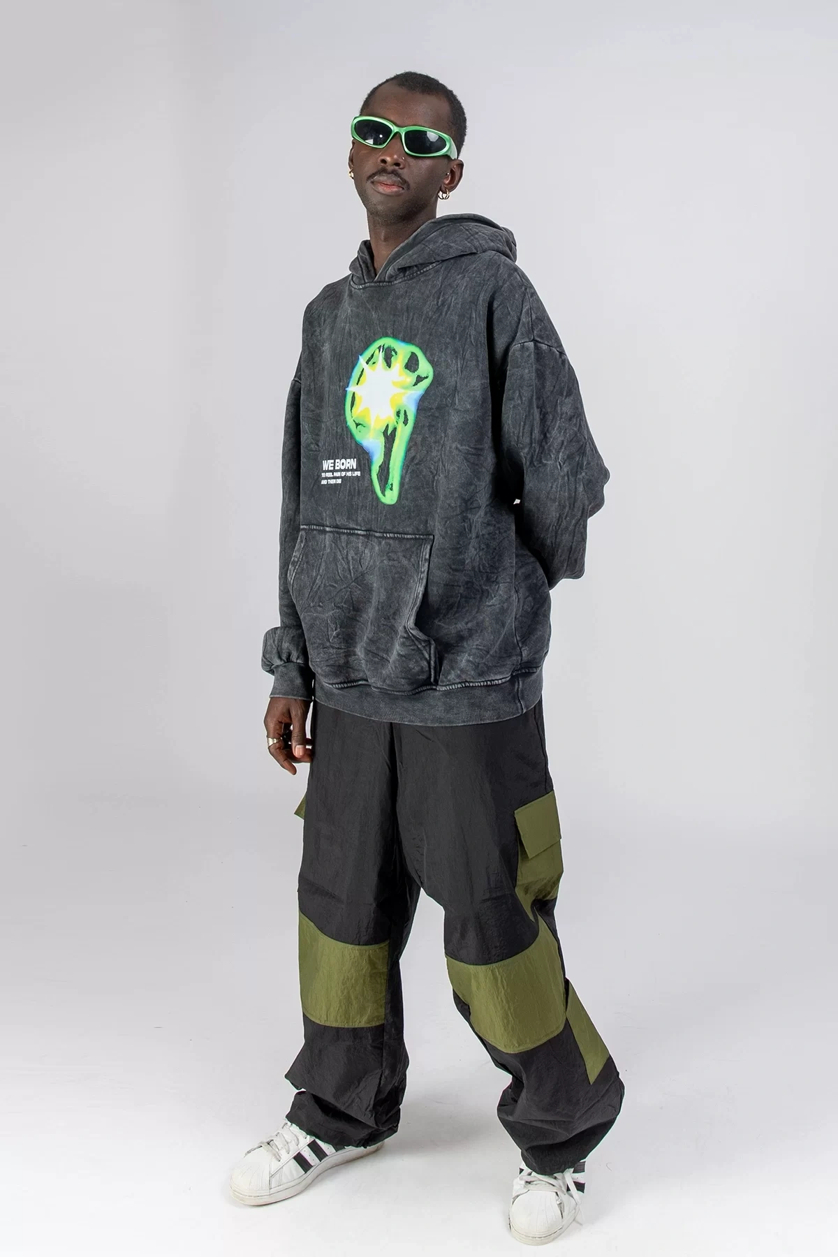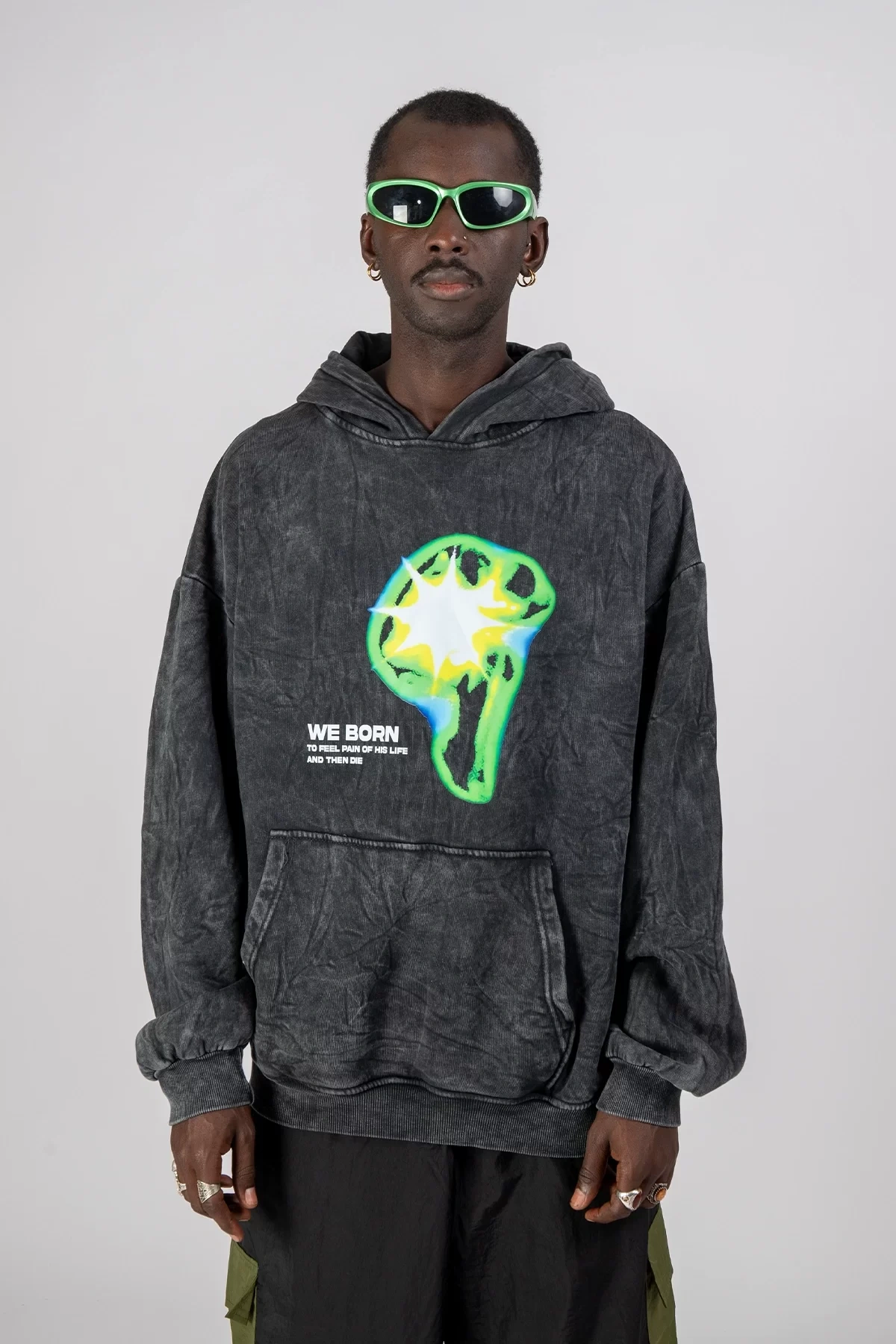 Yıkamalı Siyah WE BORN Baskılı Oversize Unisex Hoodie