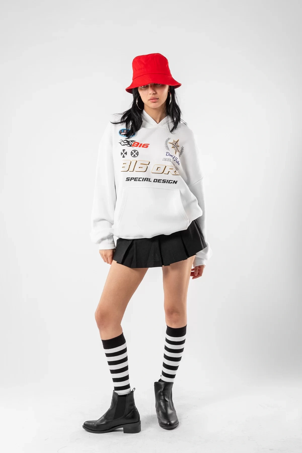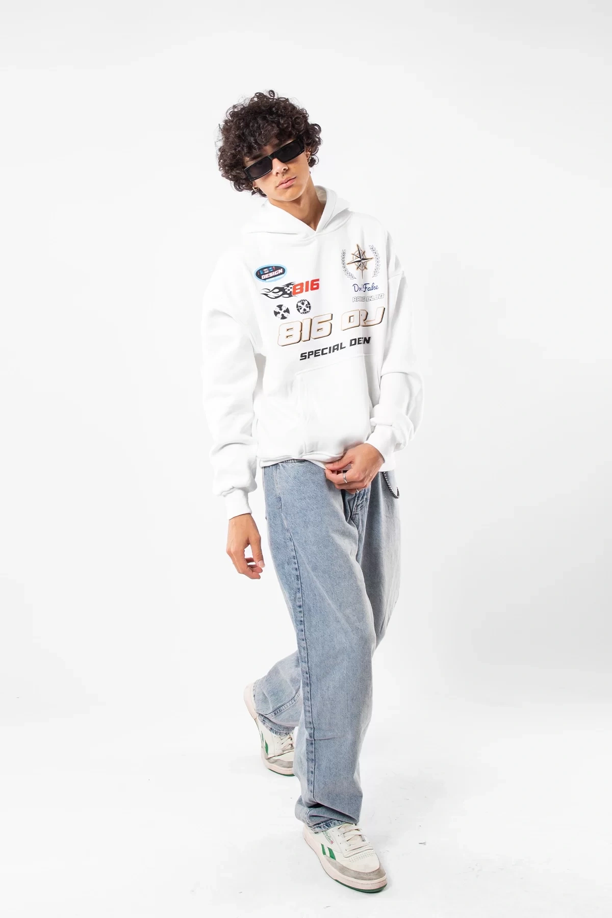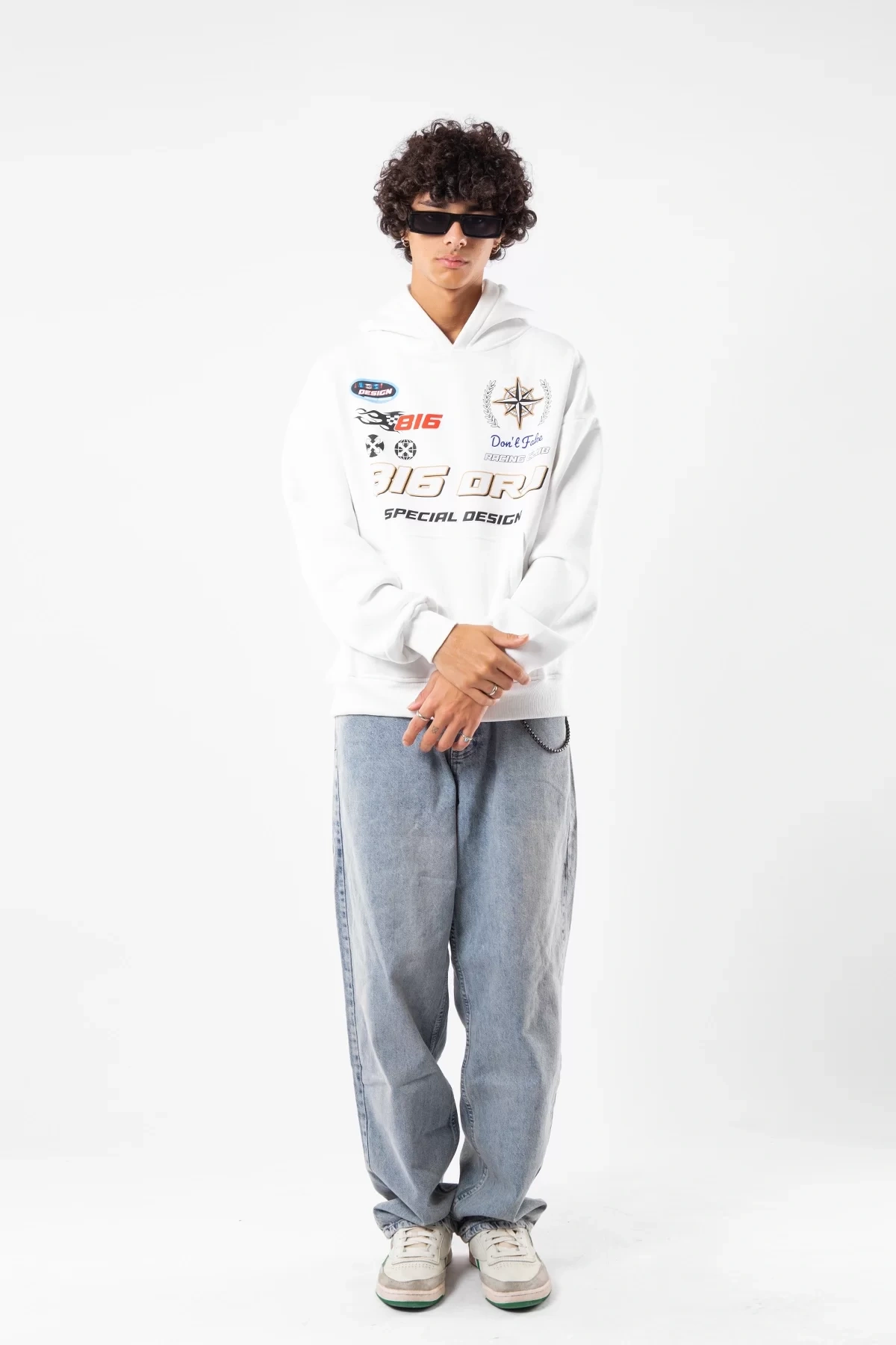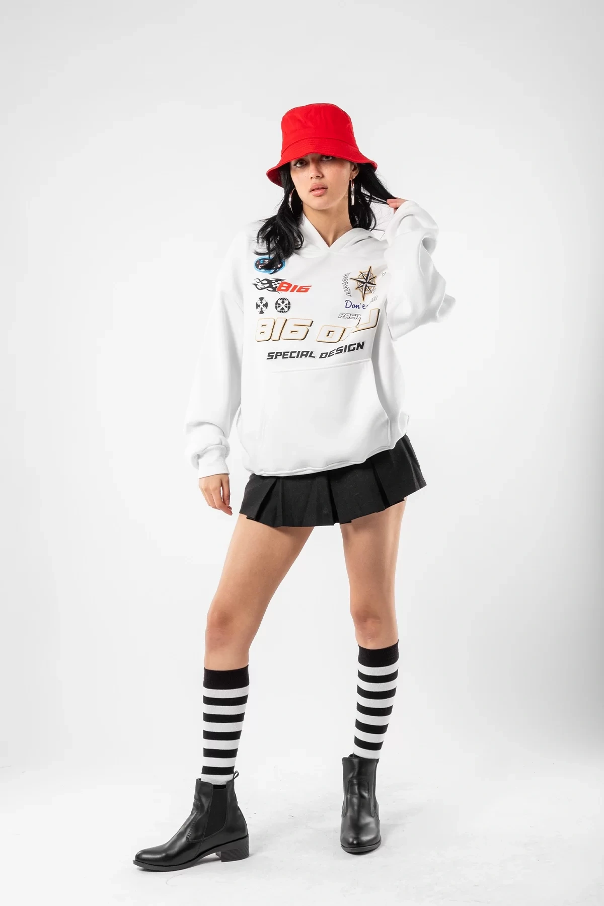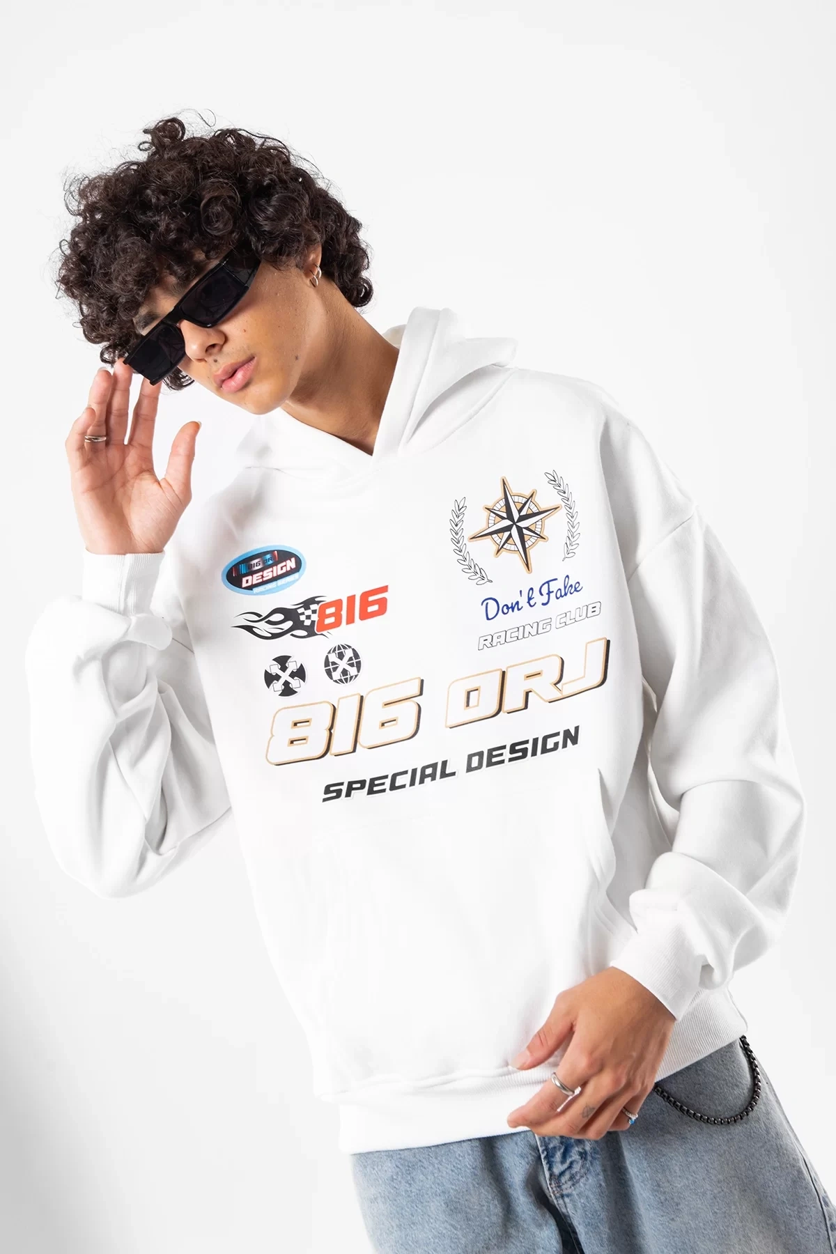 816 Racing Baskılı Oversize Unisex Beyaz Hoodie