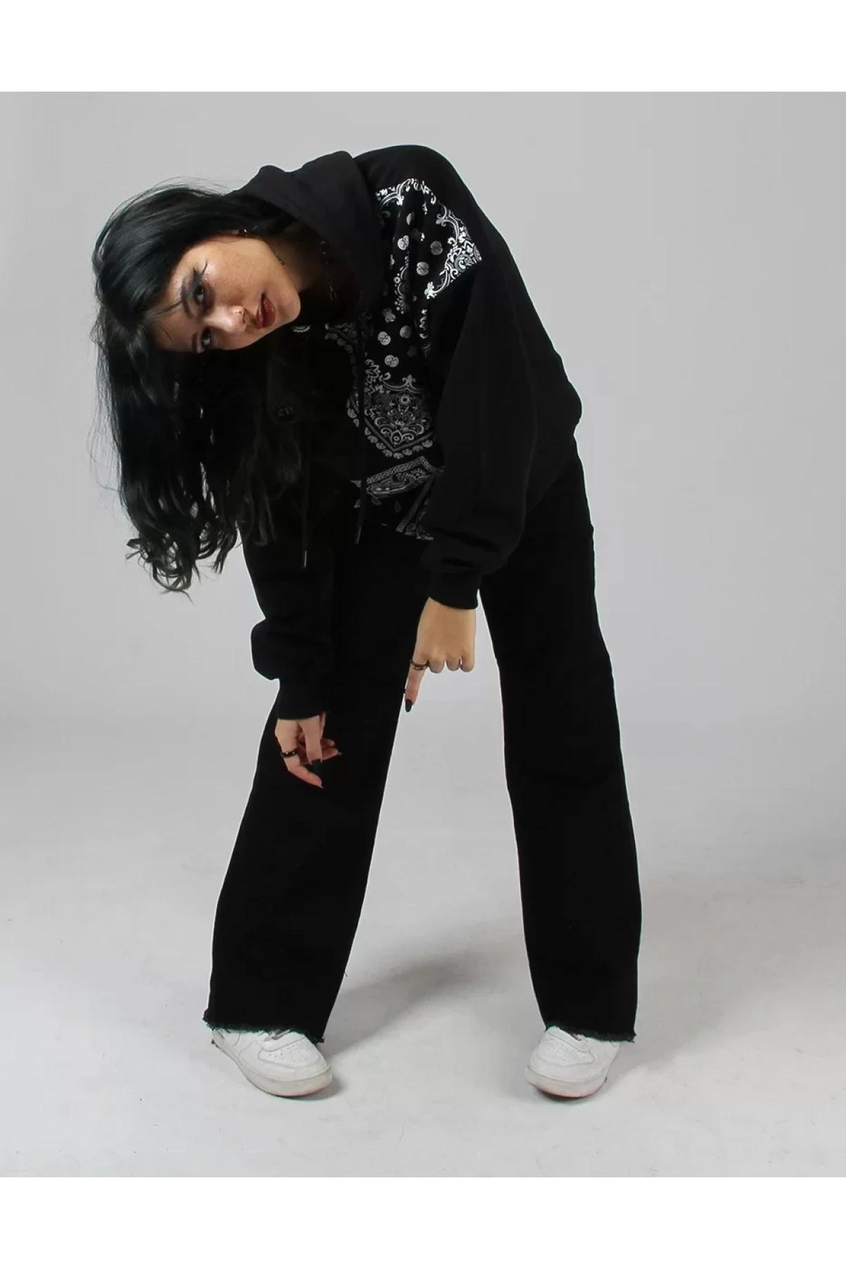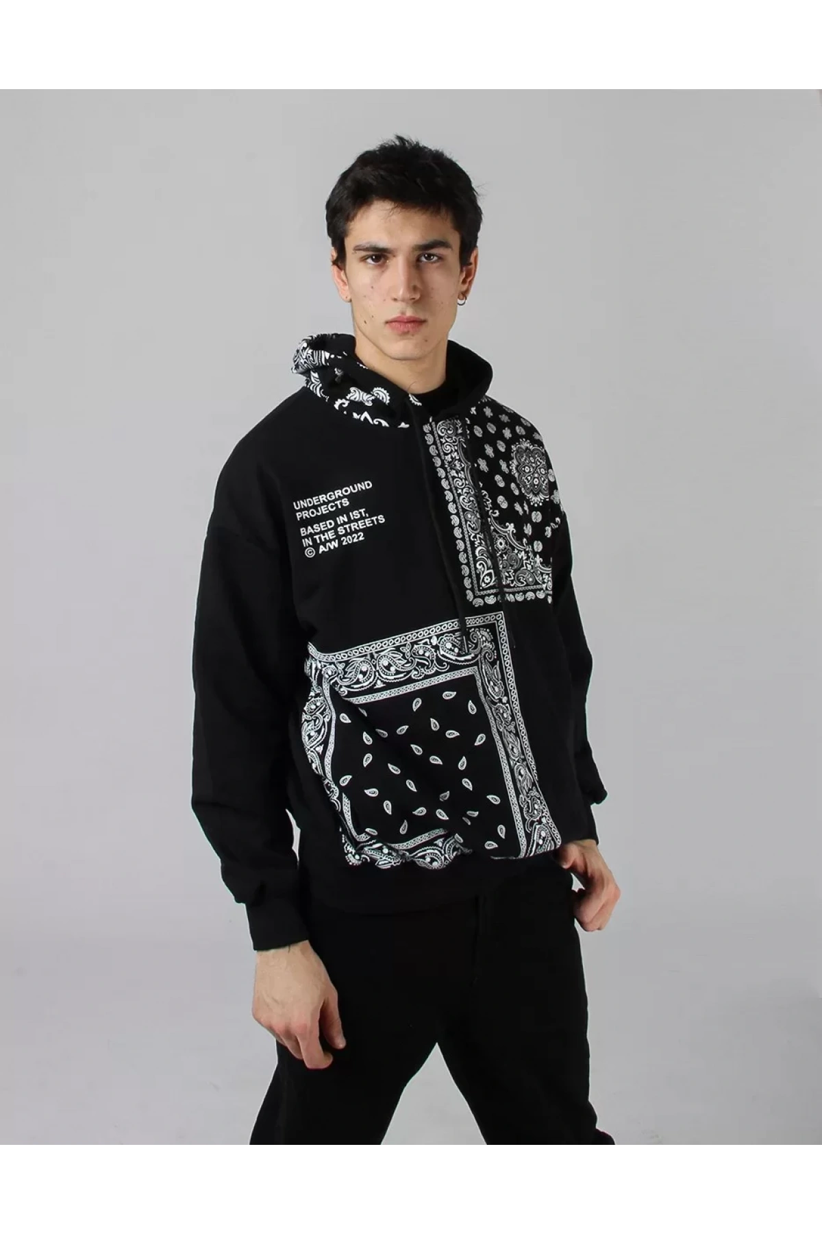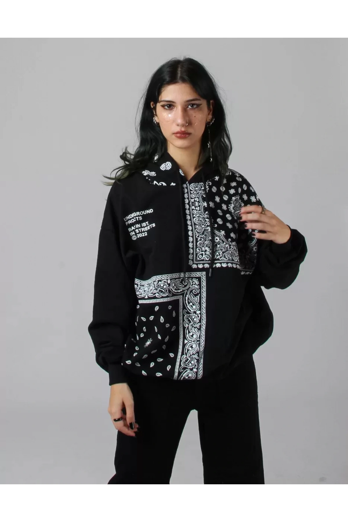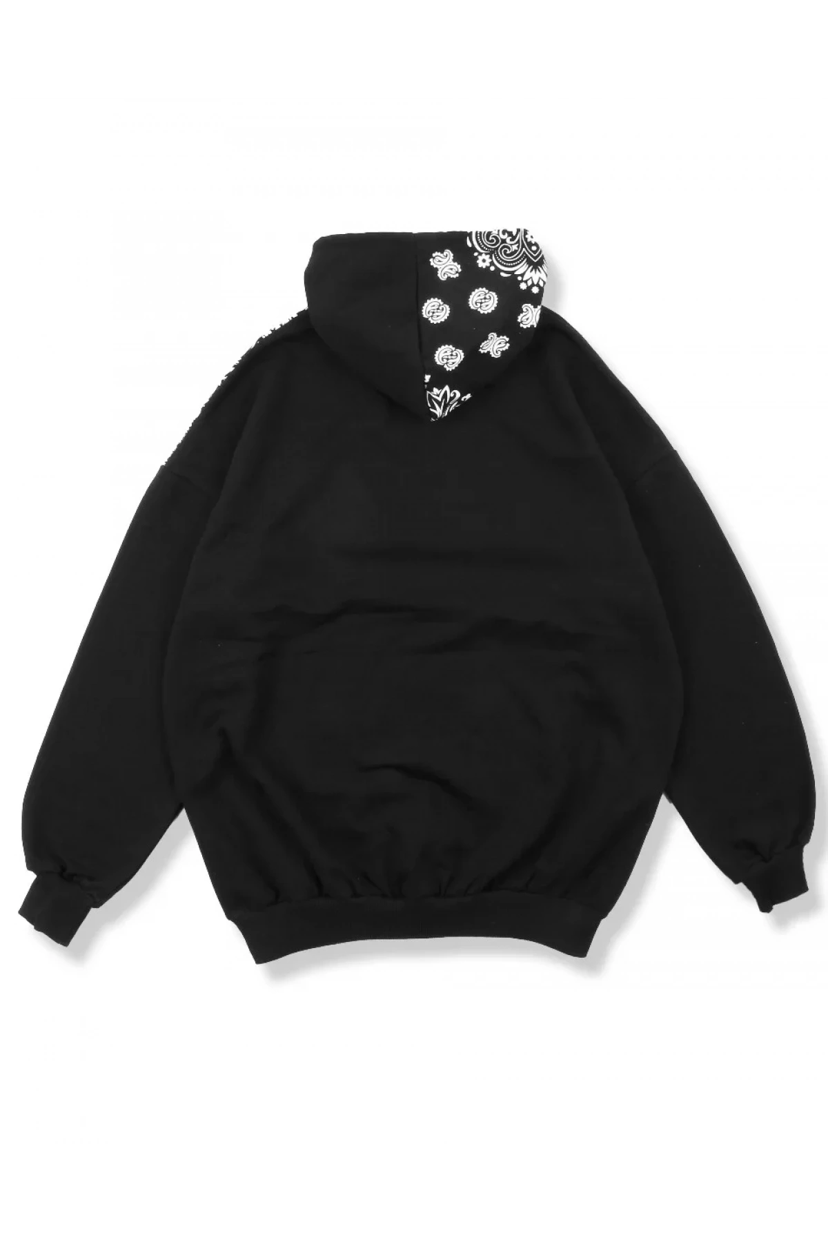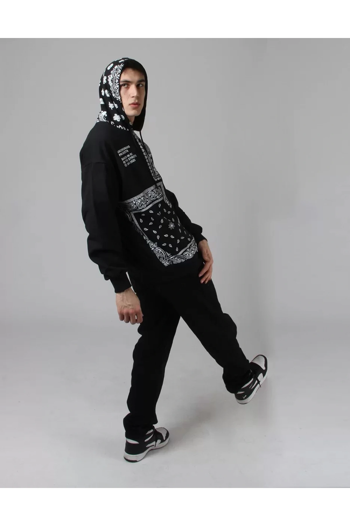 Bandana Baskılı Siyah Rahat Kalıp Hoodie