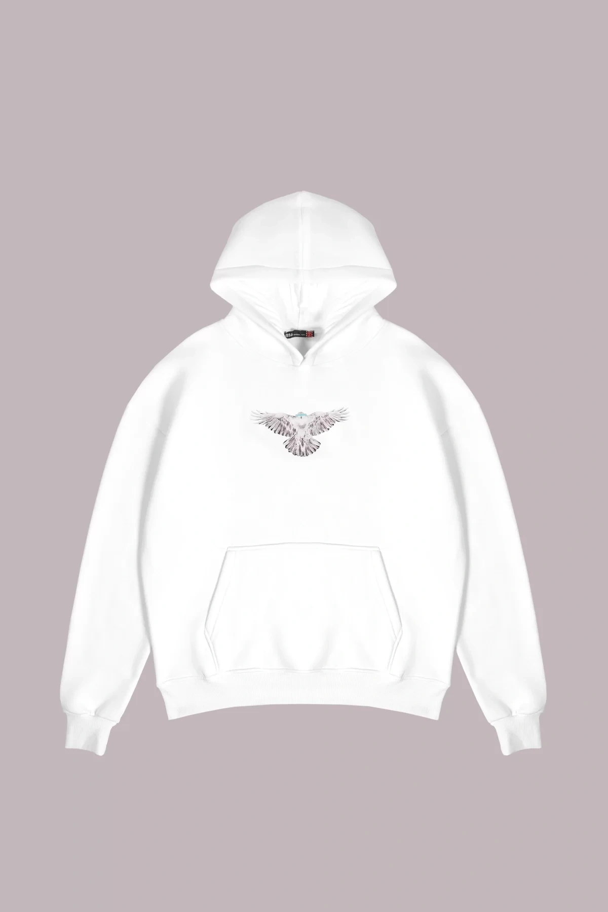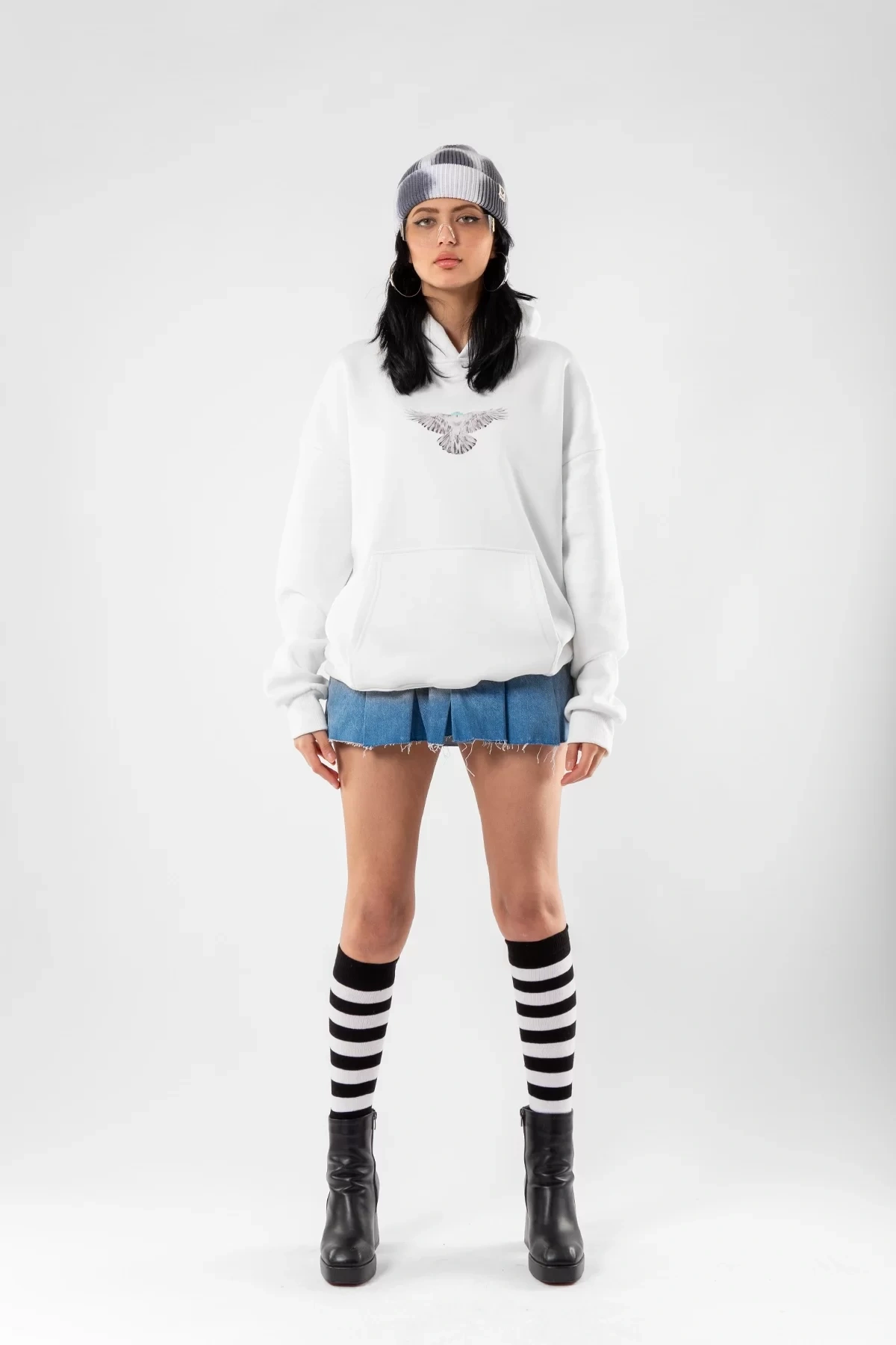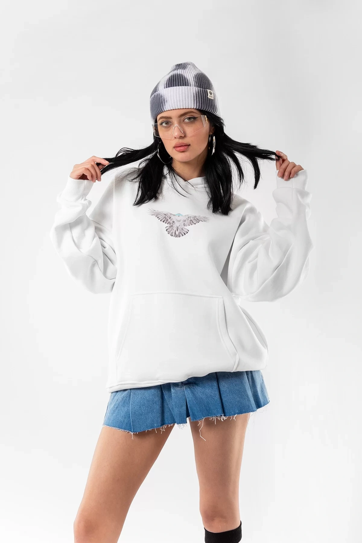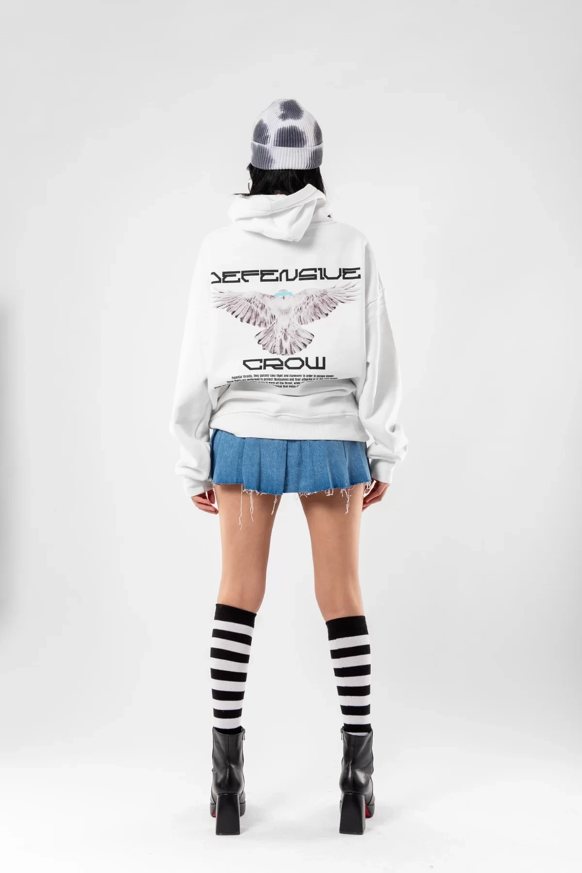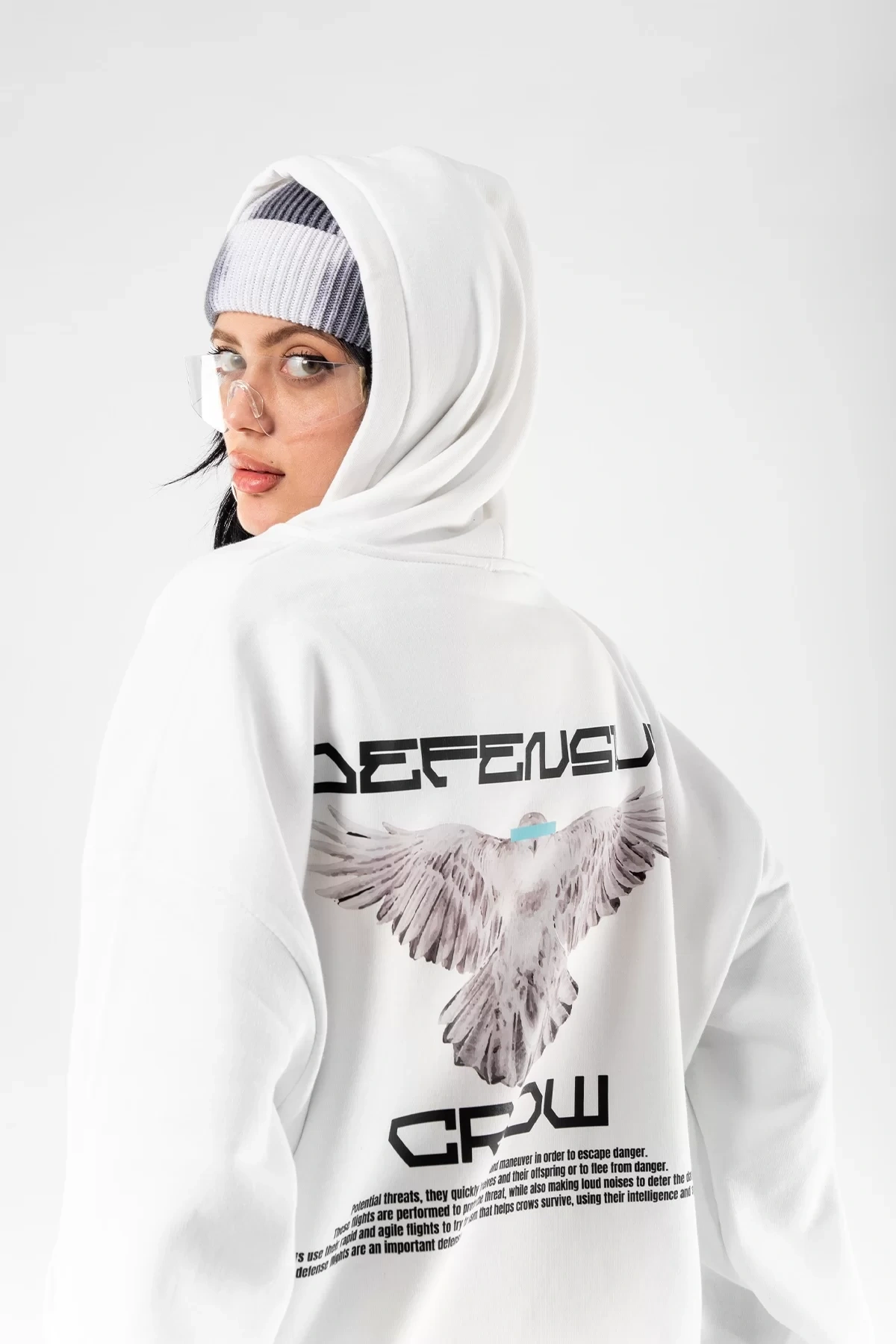 Defensive Crow Baskılı Oversize Unisex Beyaz Hoodie