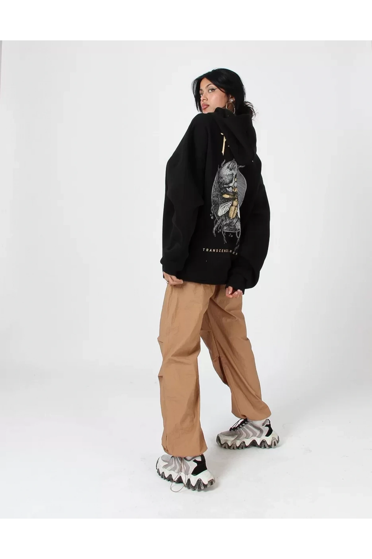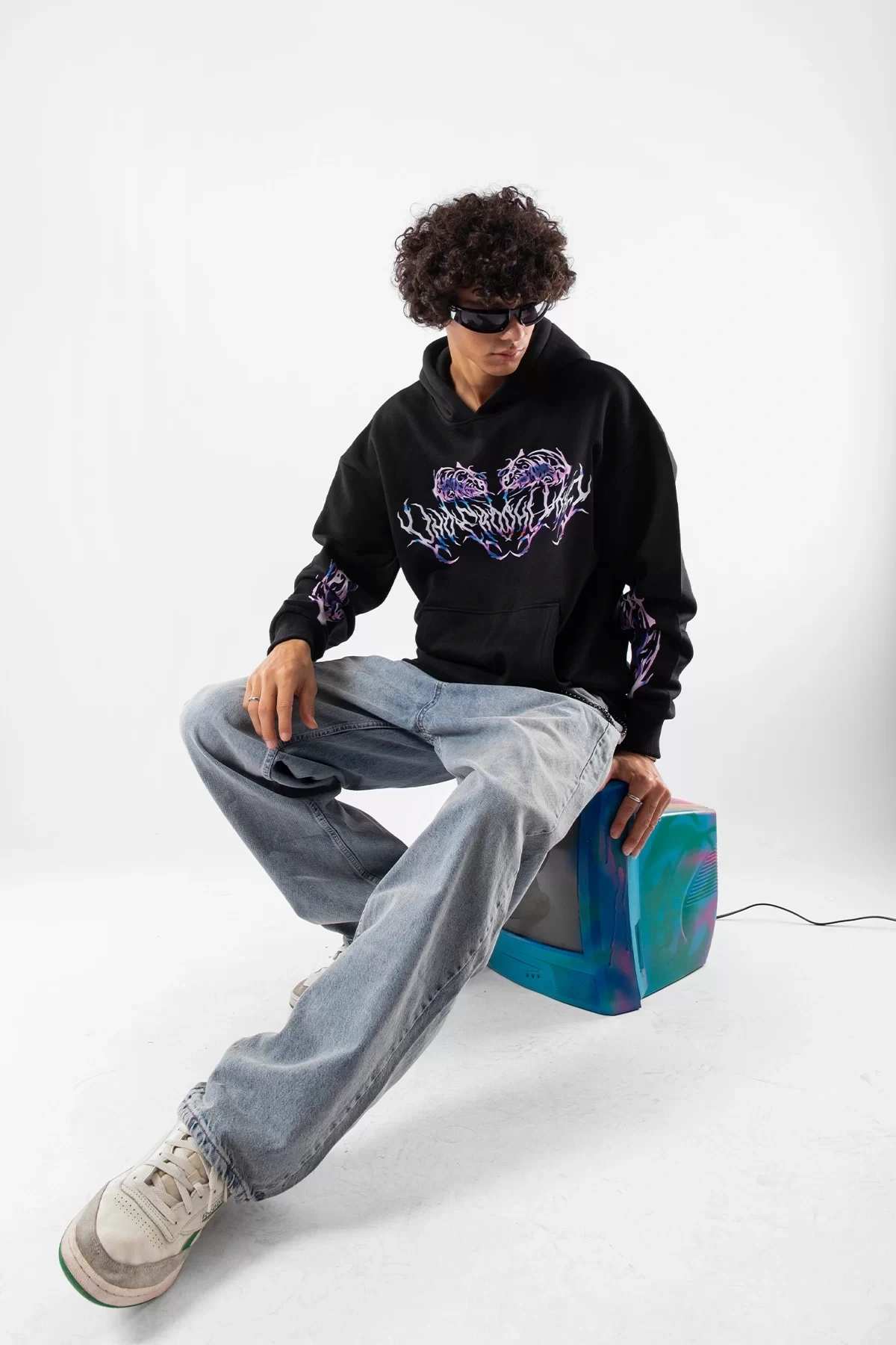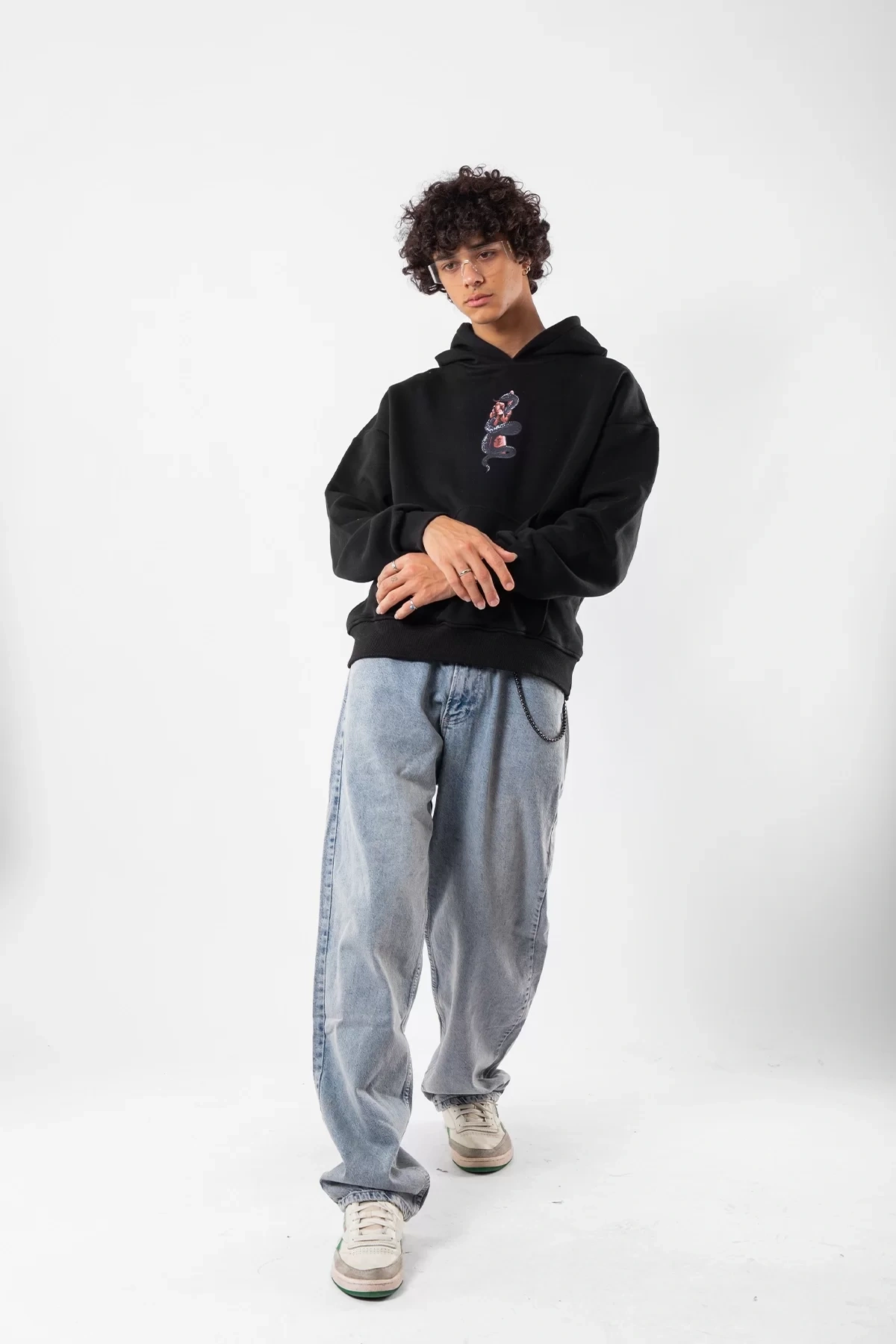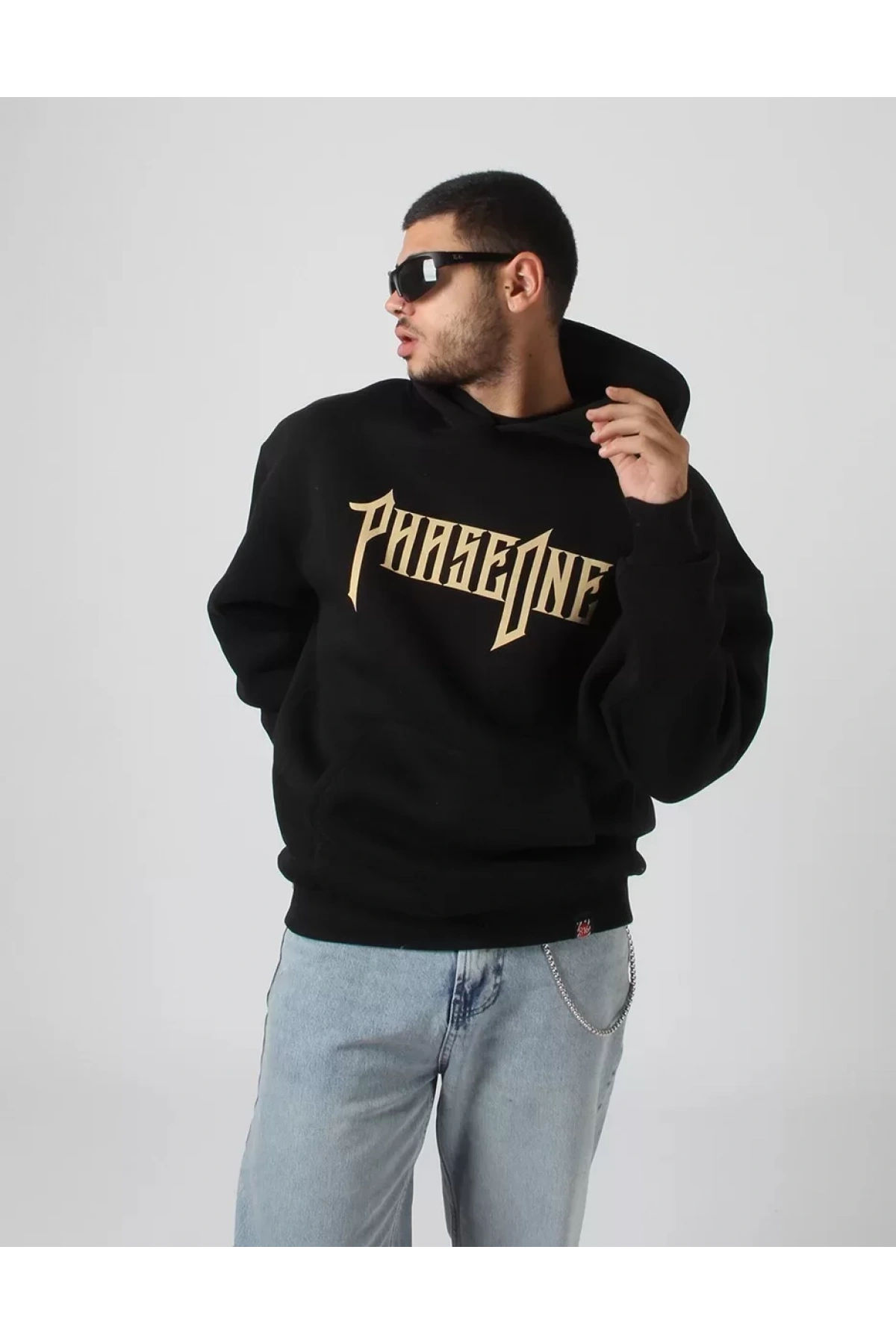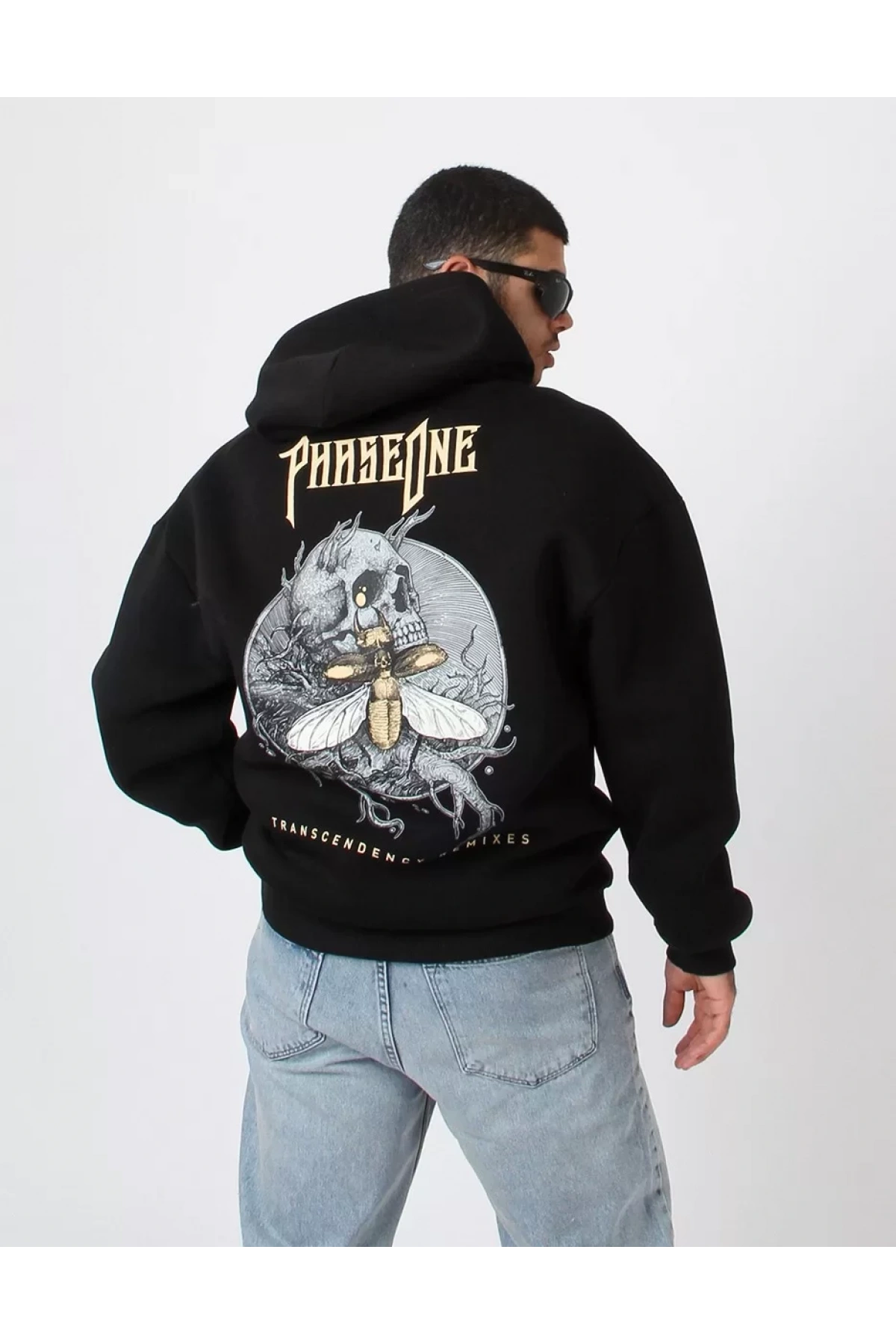 Phaseone Baskılı Siyah Oversize Unisex Kapüşonlu Sweatshirt