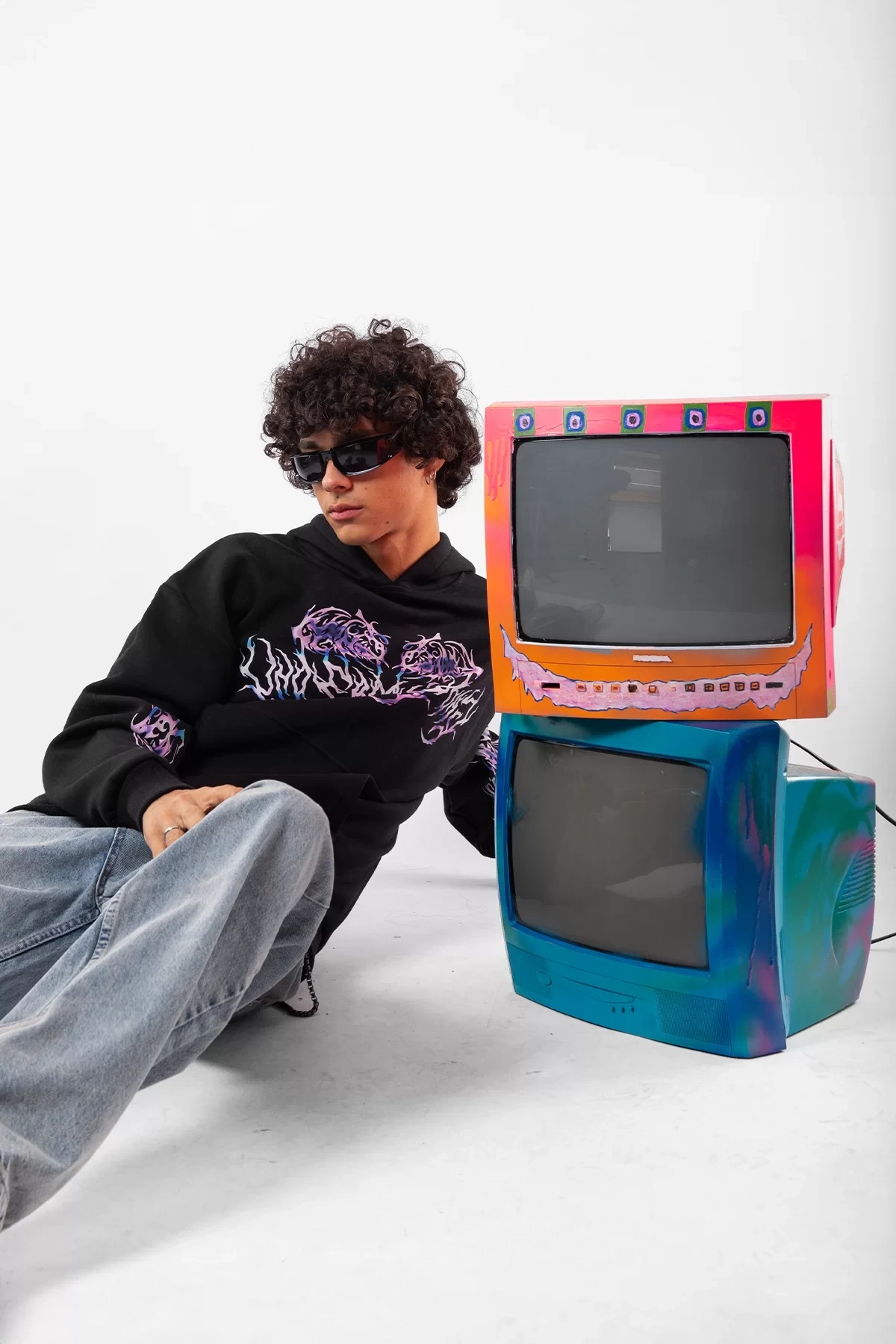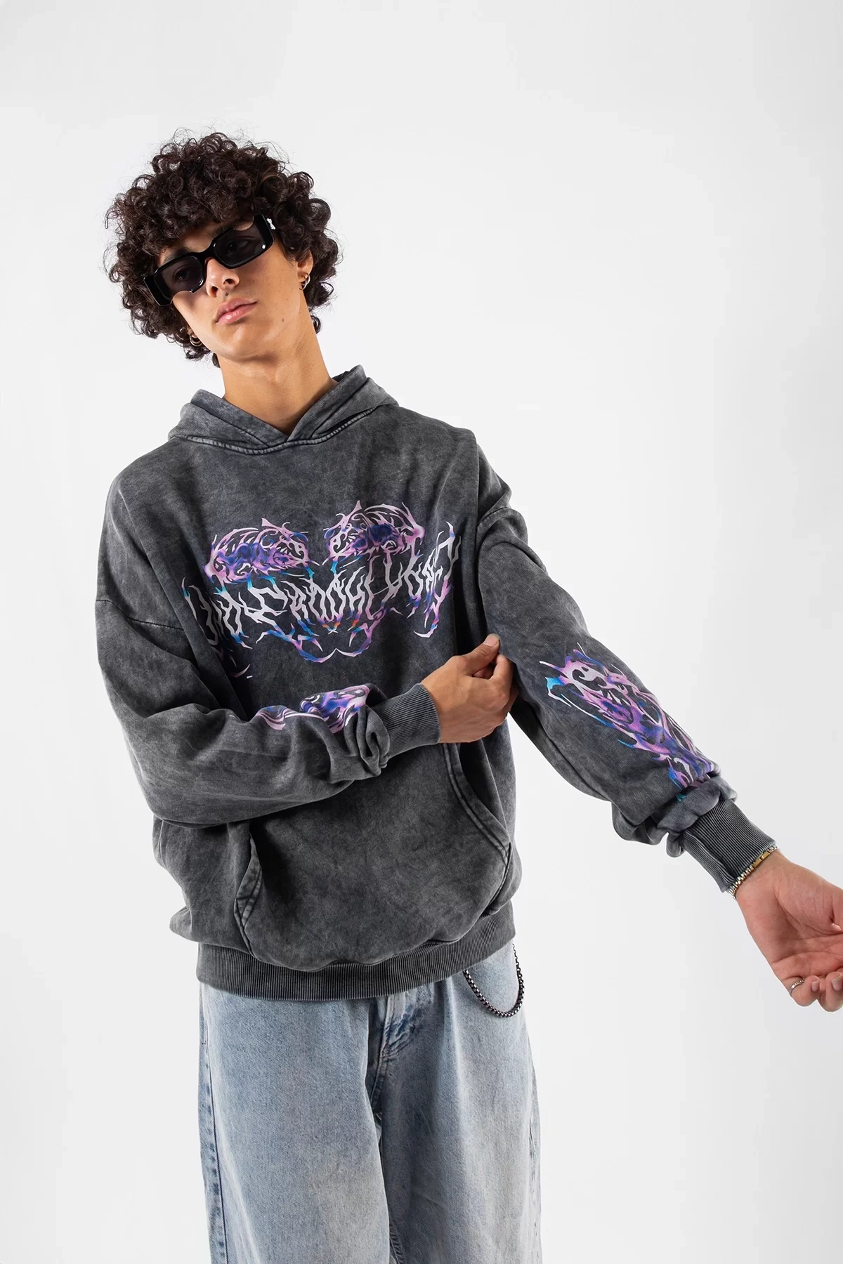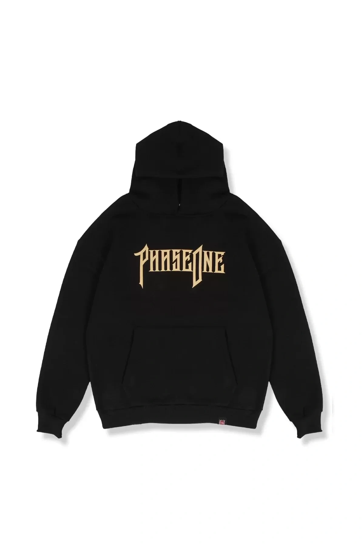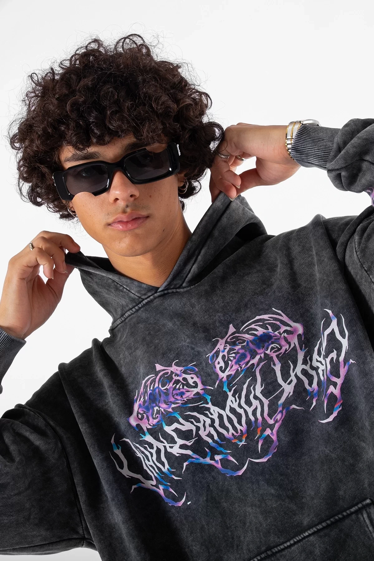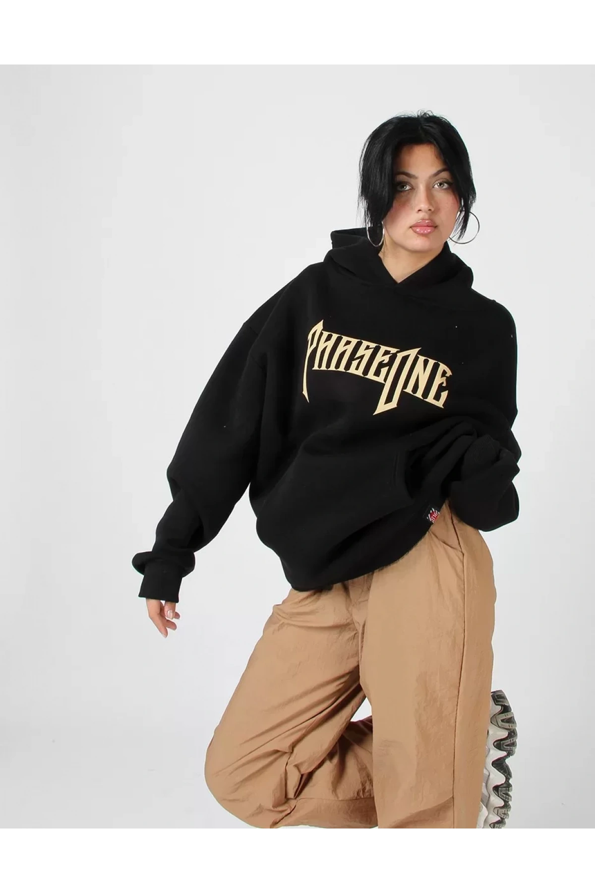 Phaseone Baskılı Siyah Oversize Unisex Kapüşonlu Sweatshirt