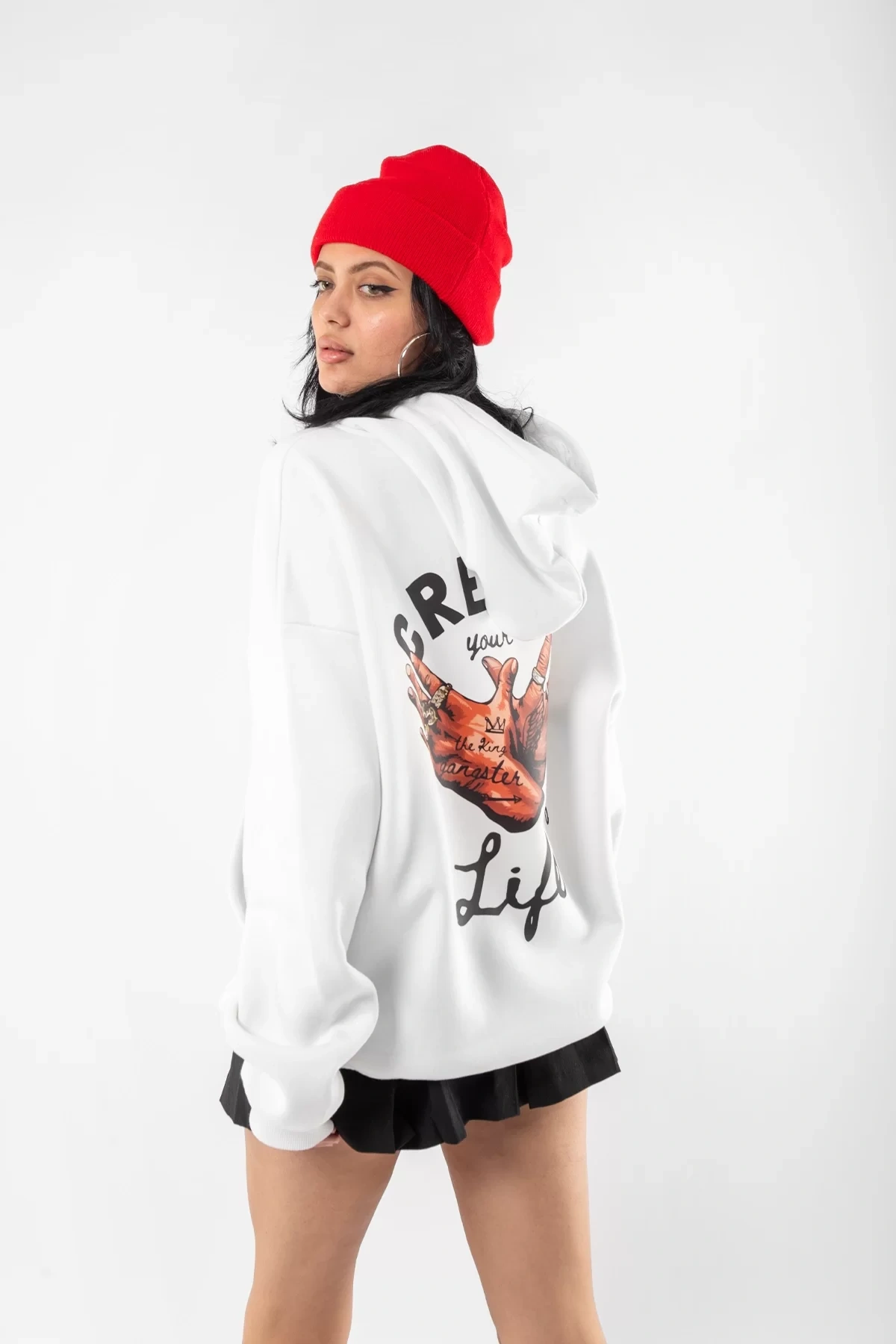 Free Gangster Baskılı Oversize Unisex Beyaz Hoodie