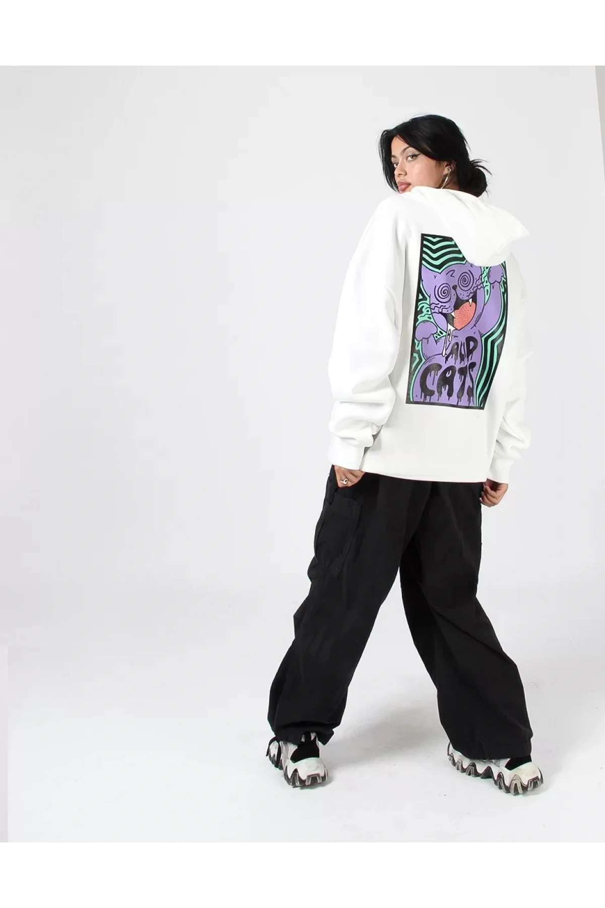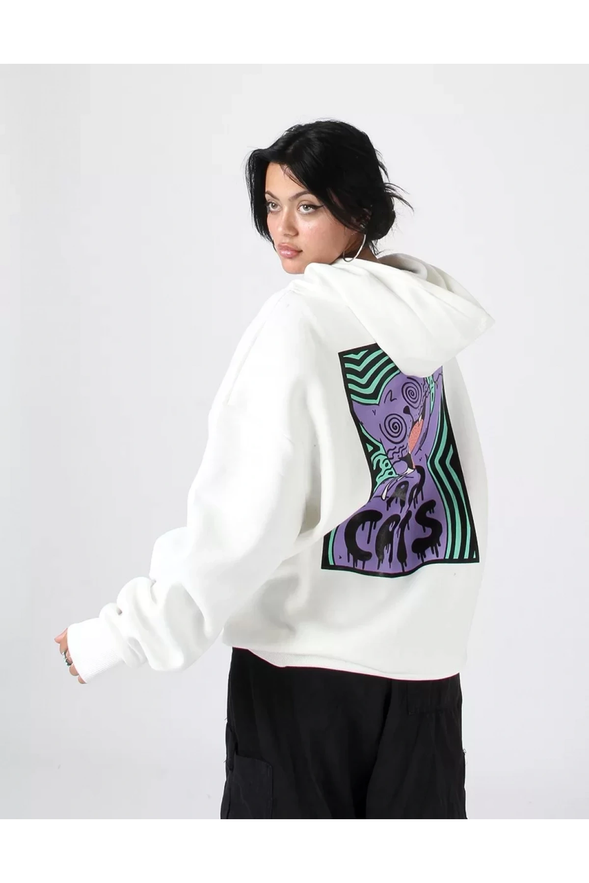 Acid Cat Sırt Baskılı Beyaz Oversize Unisex Kapüşonlu Sweatshirt