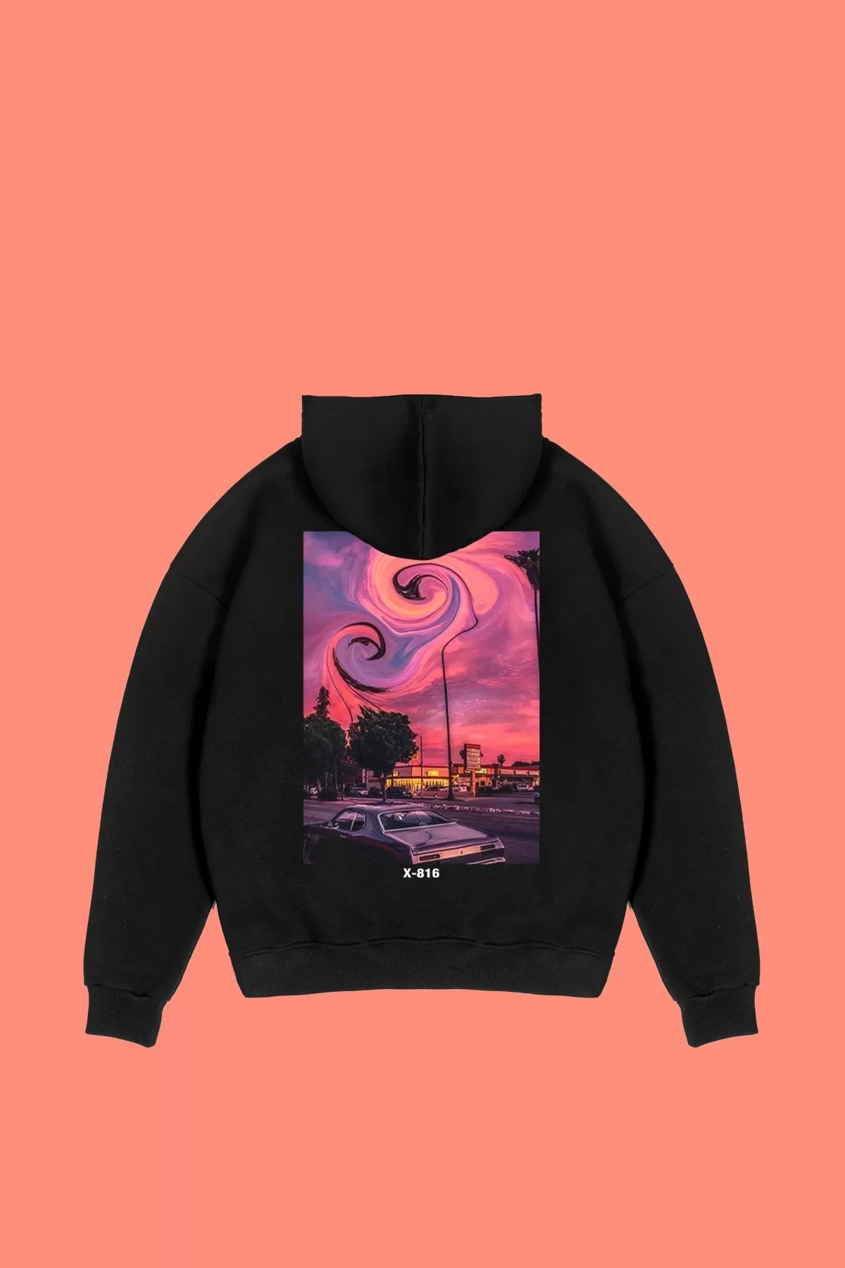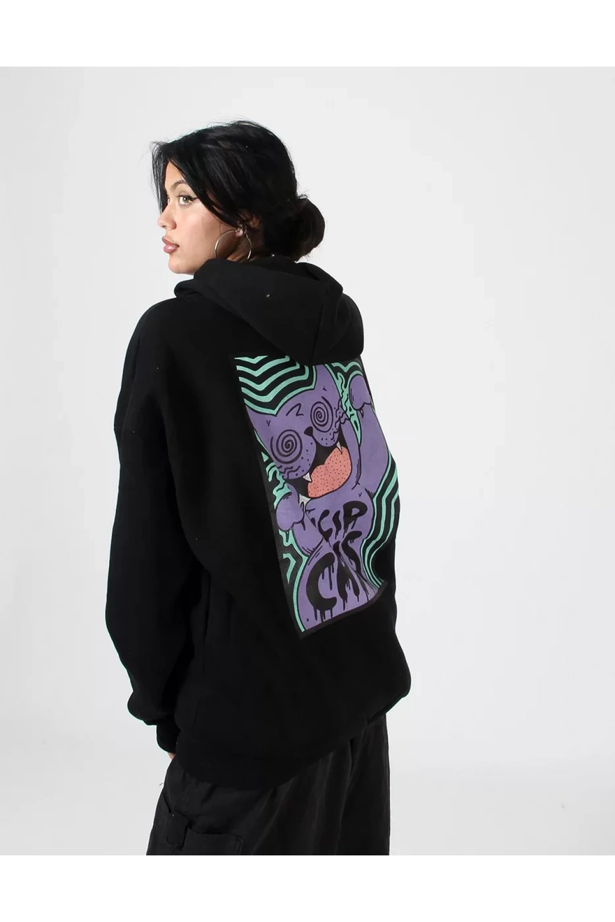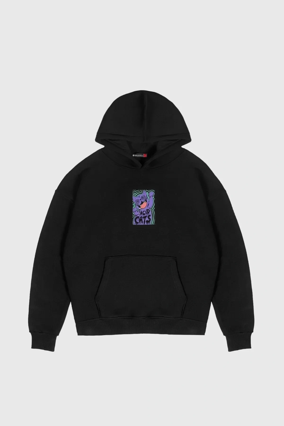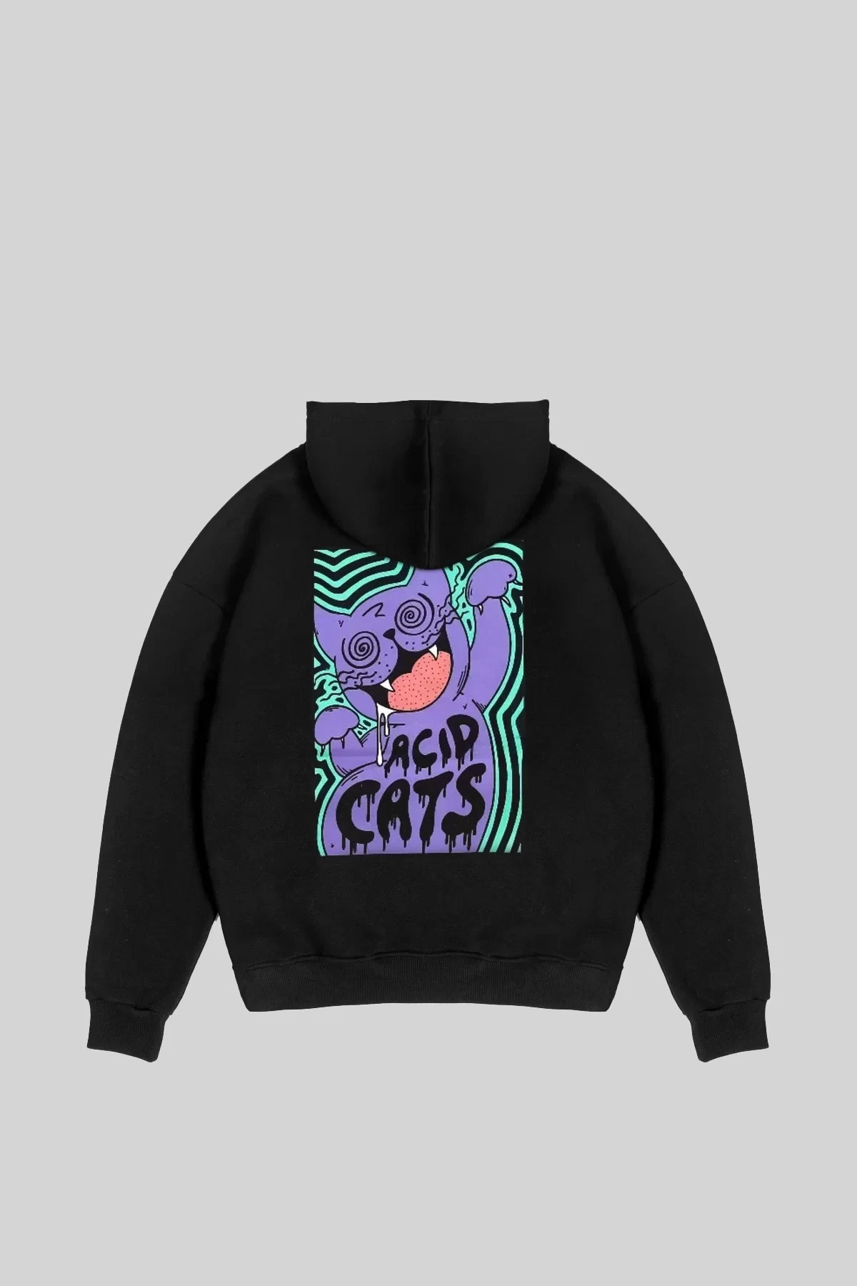 Acid Cat Sırt Baskılı Siyah Oversize Unisex Kapüşonlu Sweatshirt