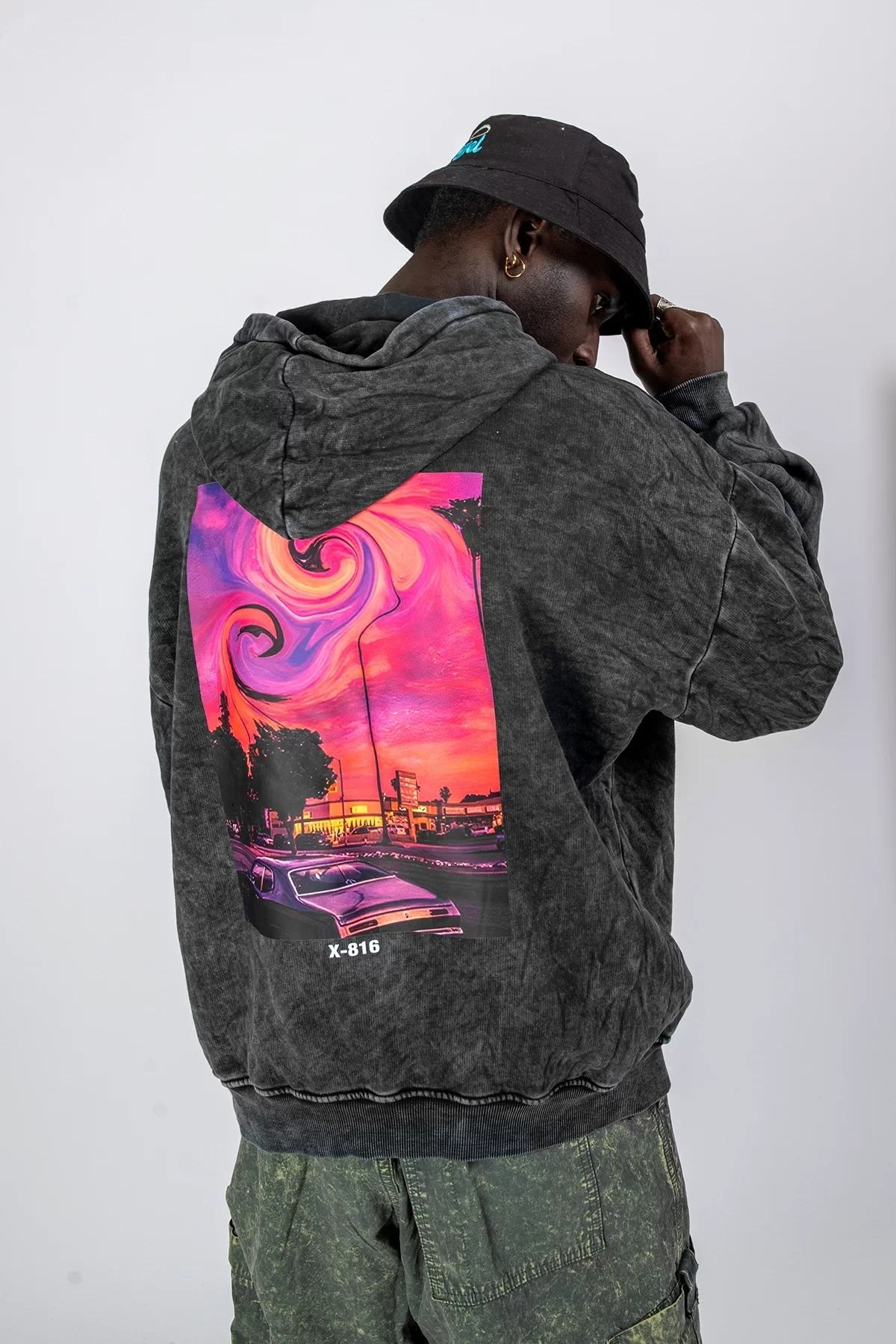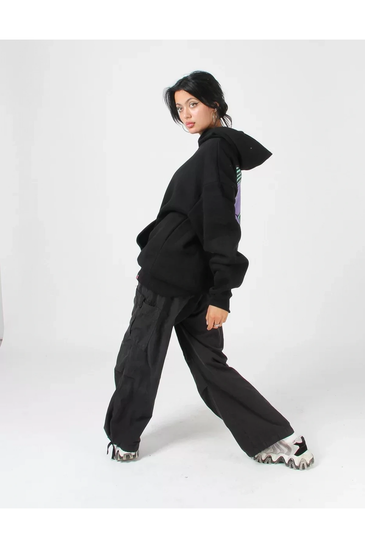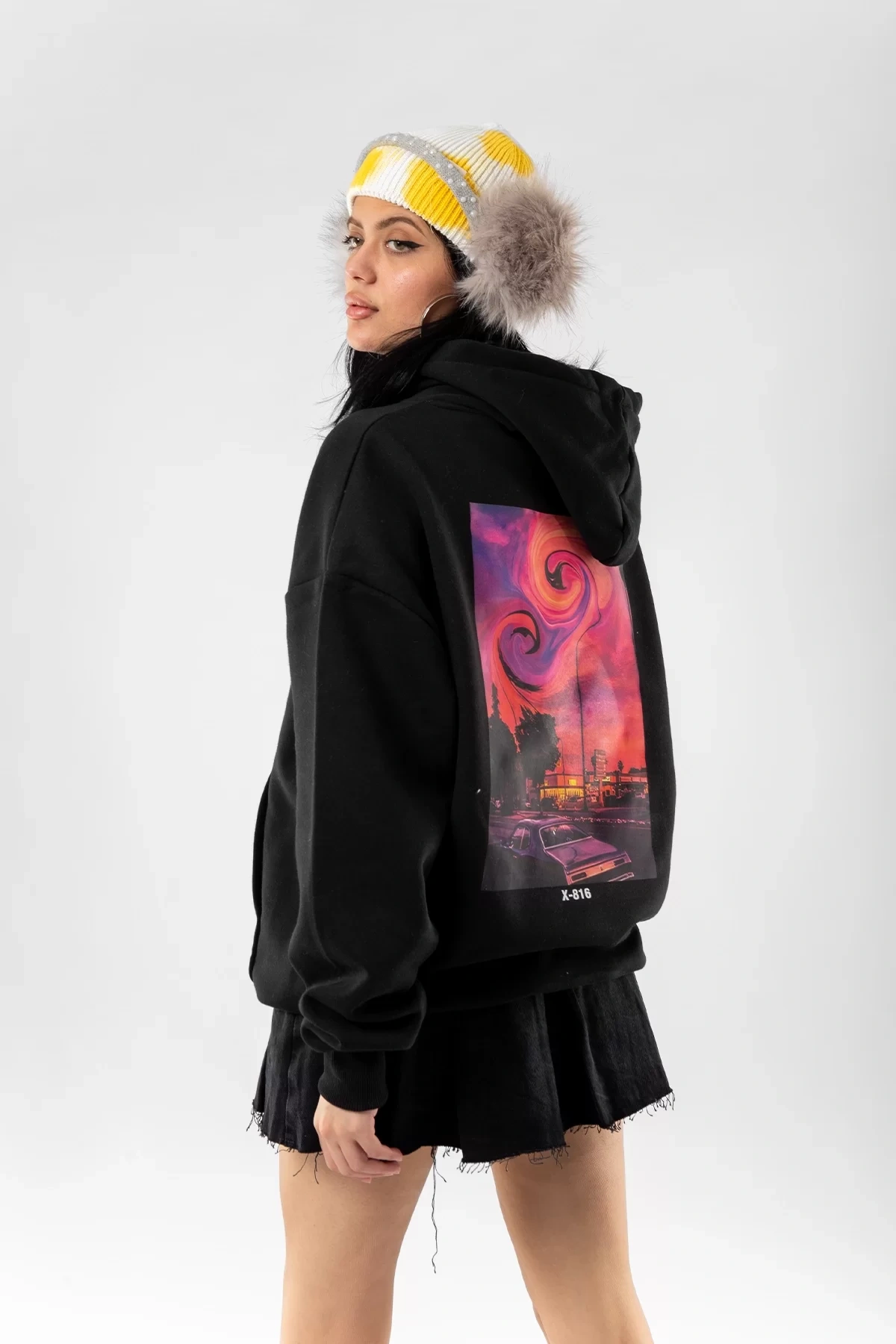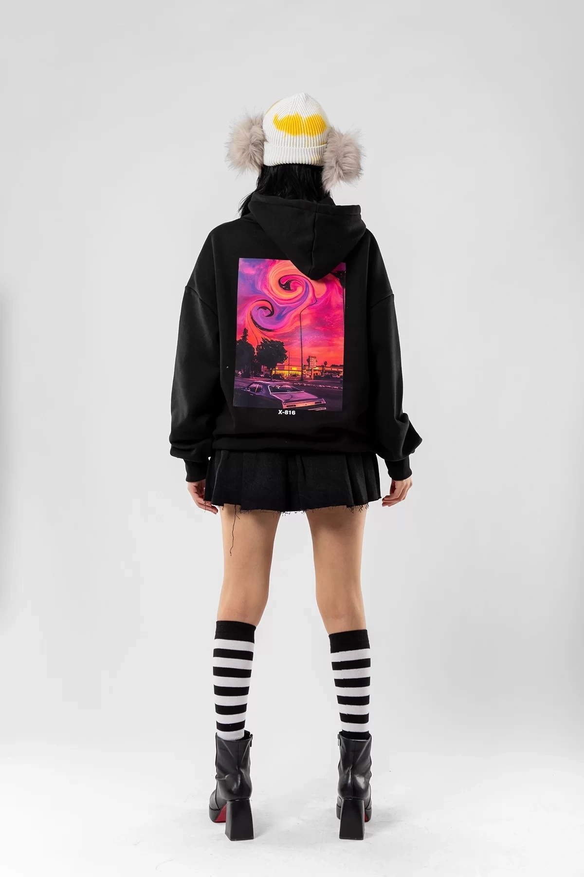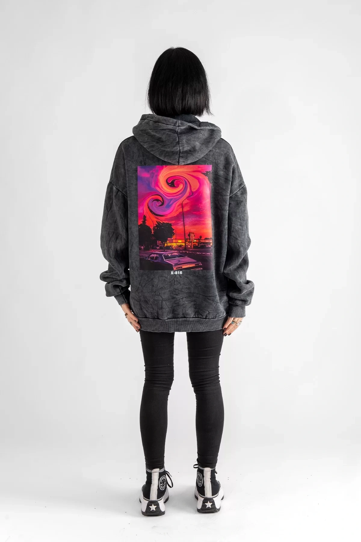 Acid Cat Sırt Baskılı Siyah Oversize Unisex Kapüşonlu Sweatshirt