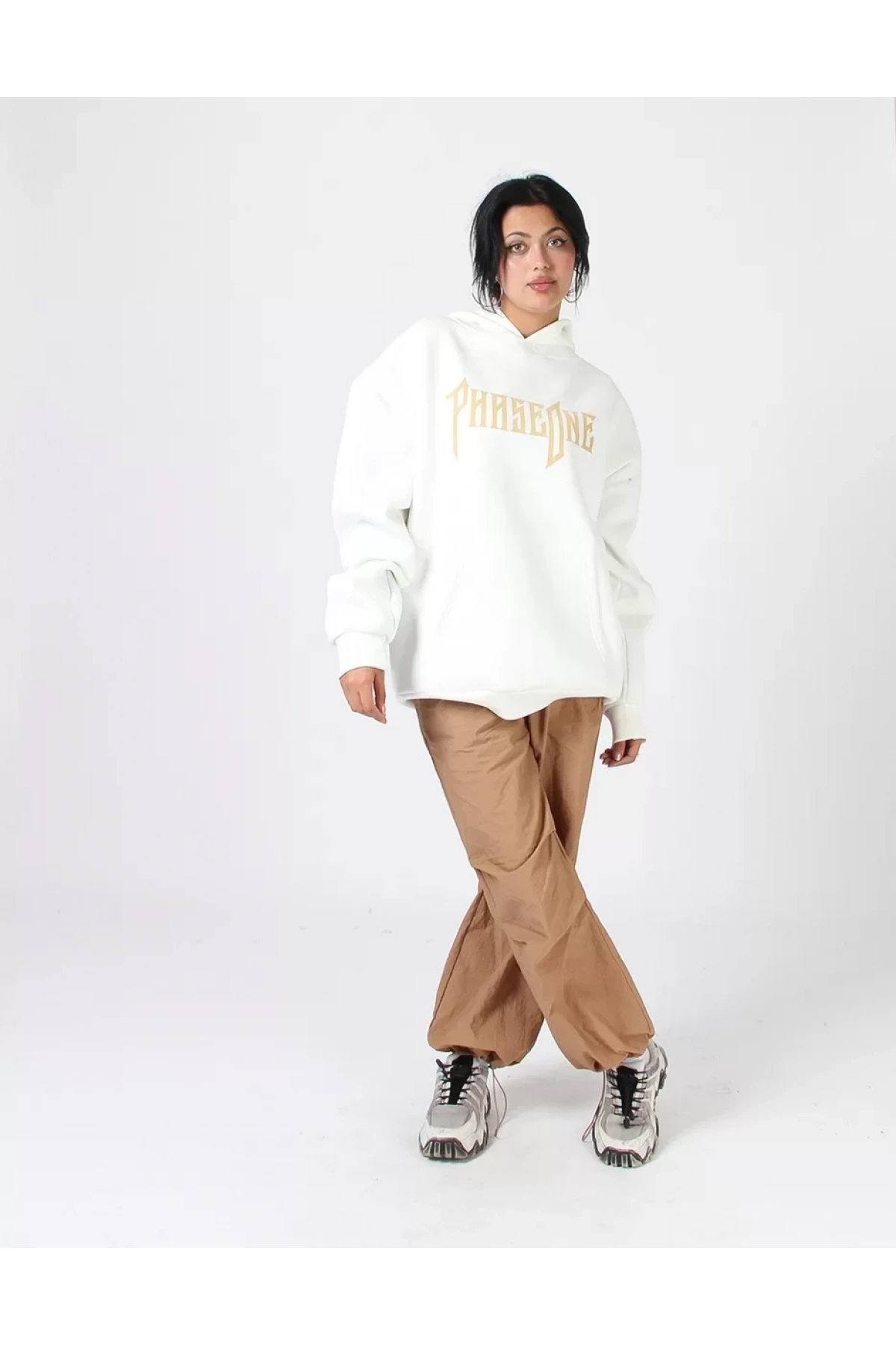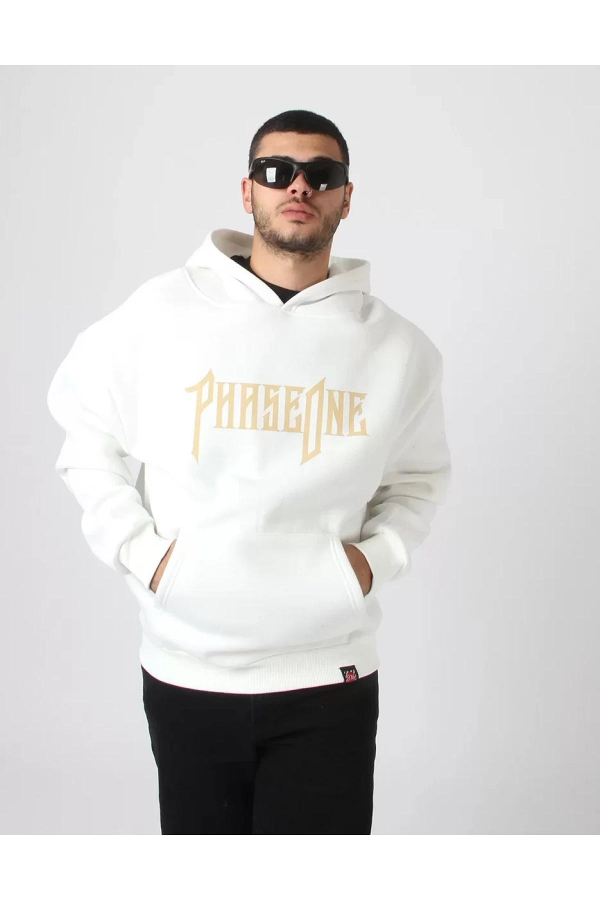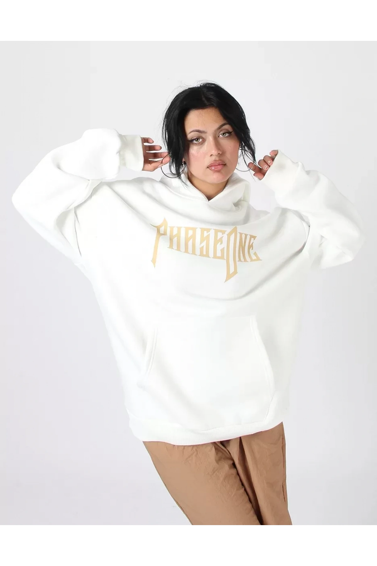 Phaseone Baskılı Beyaz Oversize Unisex Kapüşonlu Sweatshirt