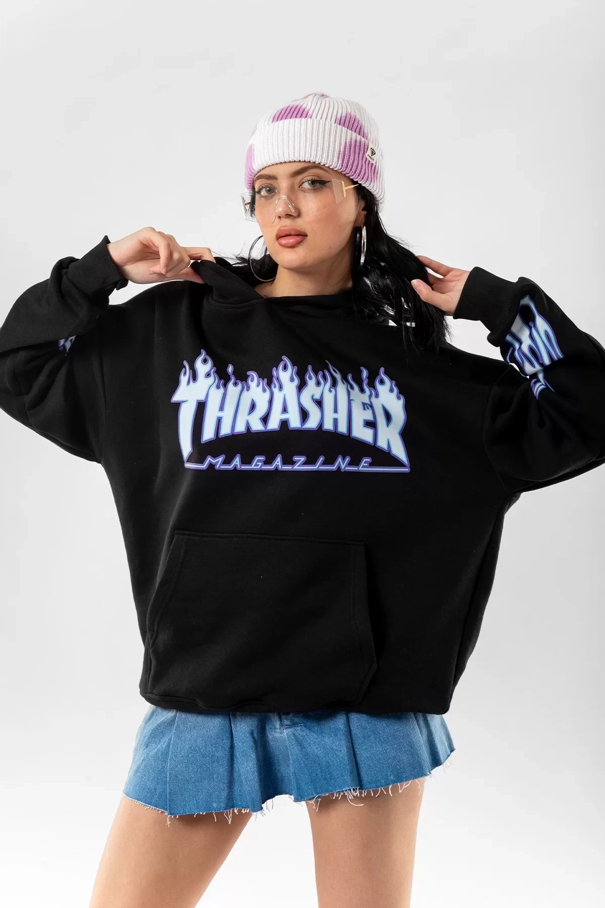 Thrasher Flam Baskılı Oversize Unisex Beyaz Hoodie