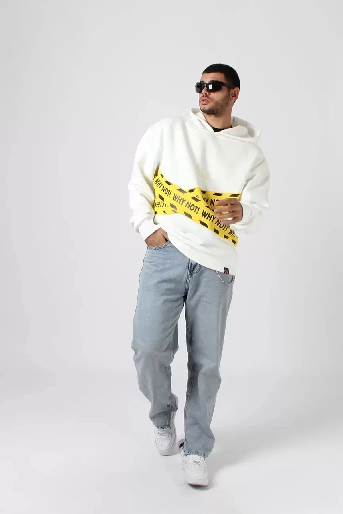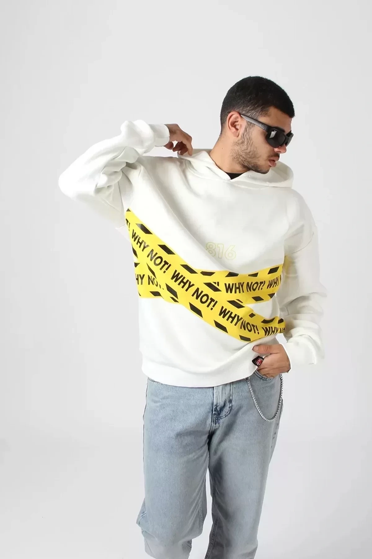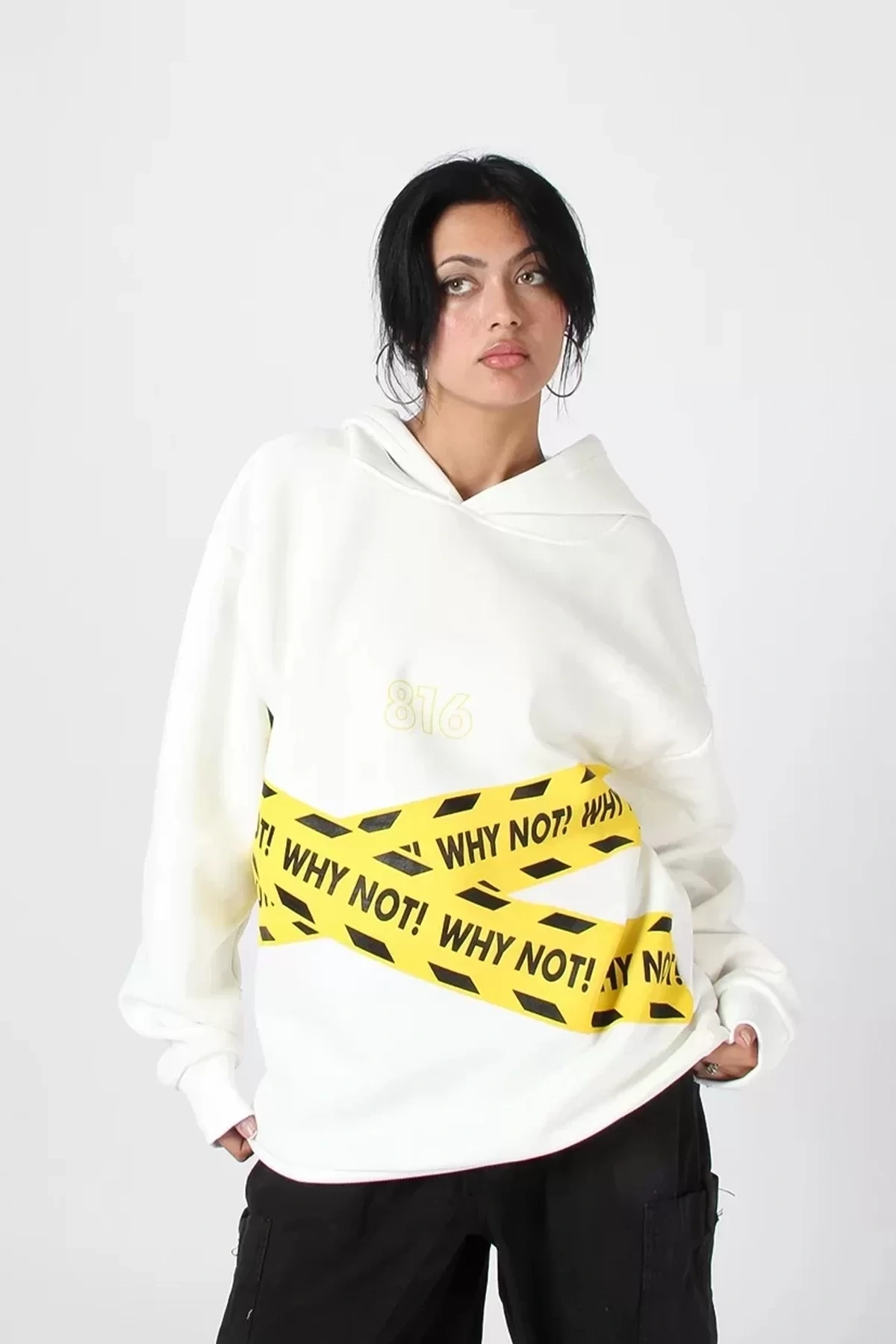 WHY NOT Baskılı Beyaz Oversize Unisex Kapüşonlu Sweatshirt