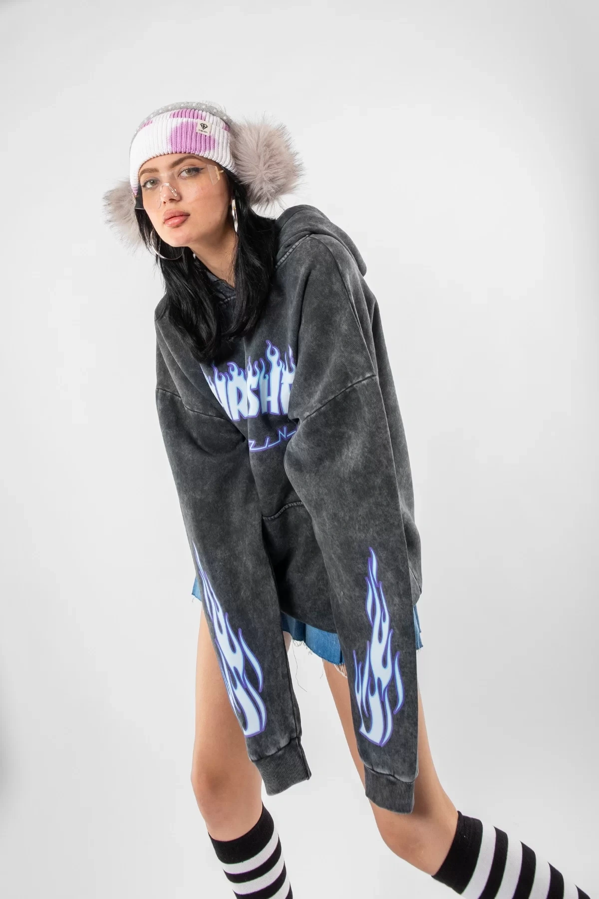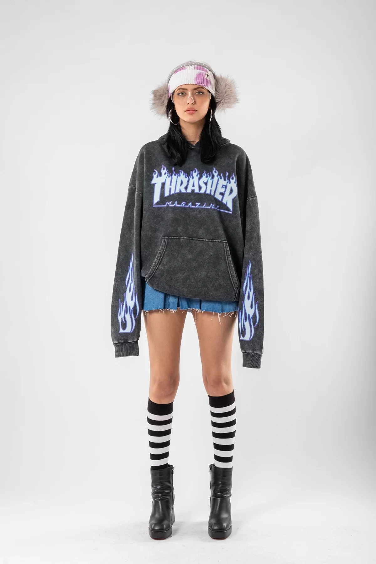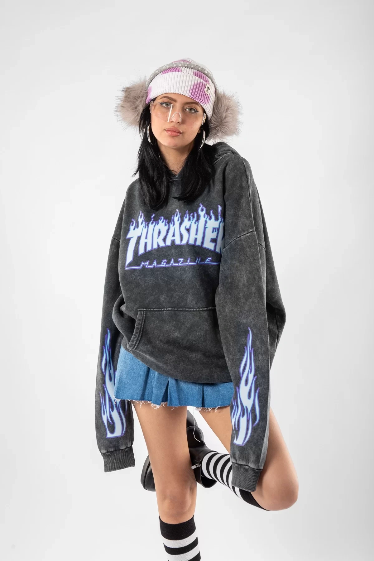 Yıkamalı Siyah Thrasher Flam Baskılı Oversize Unisex Hoodie