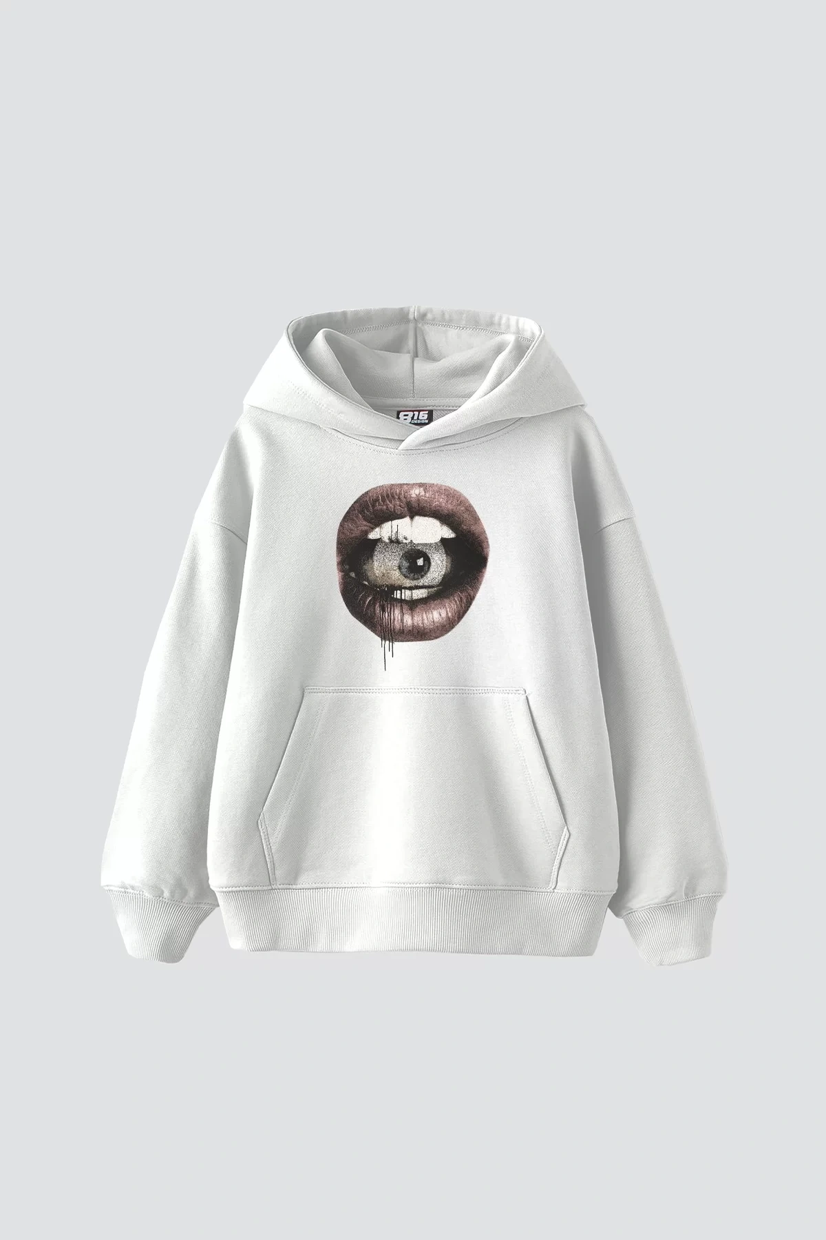 Eye İn Mouth Baskılı Oversize Unisex Premium Beyaz Hoodie