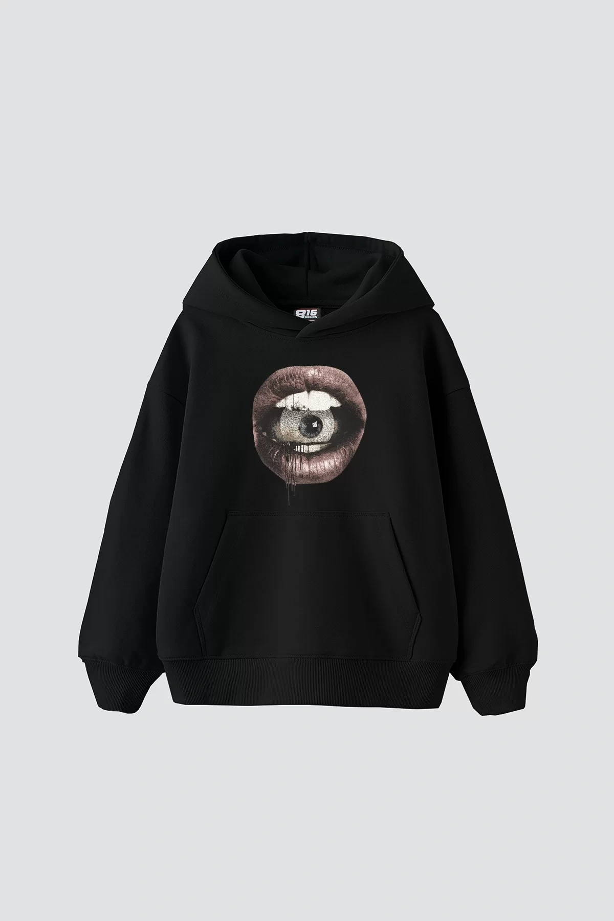 Eye İn Mouth Baskılı Oversize Unisex Premium Siyah Hoodie