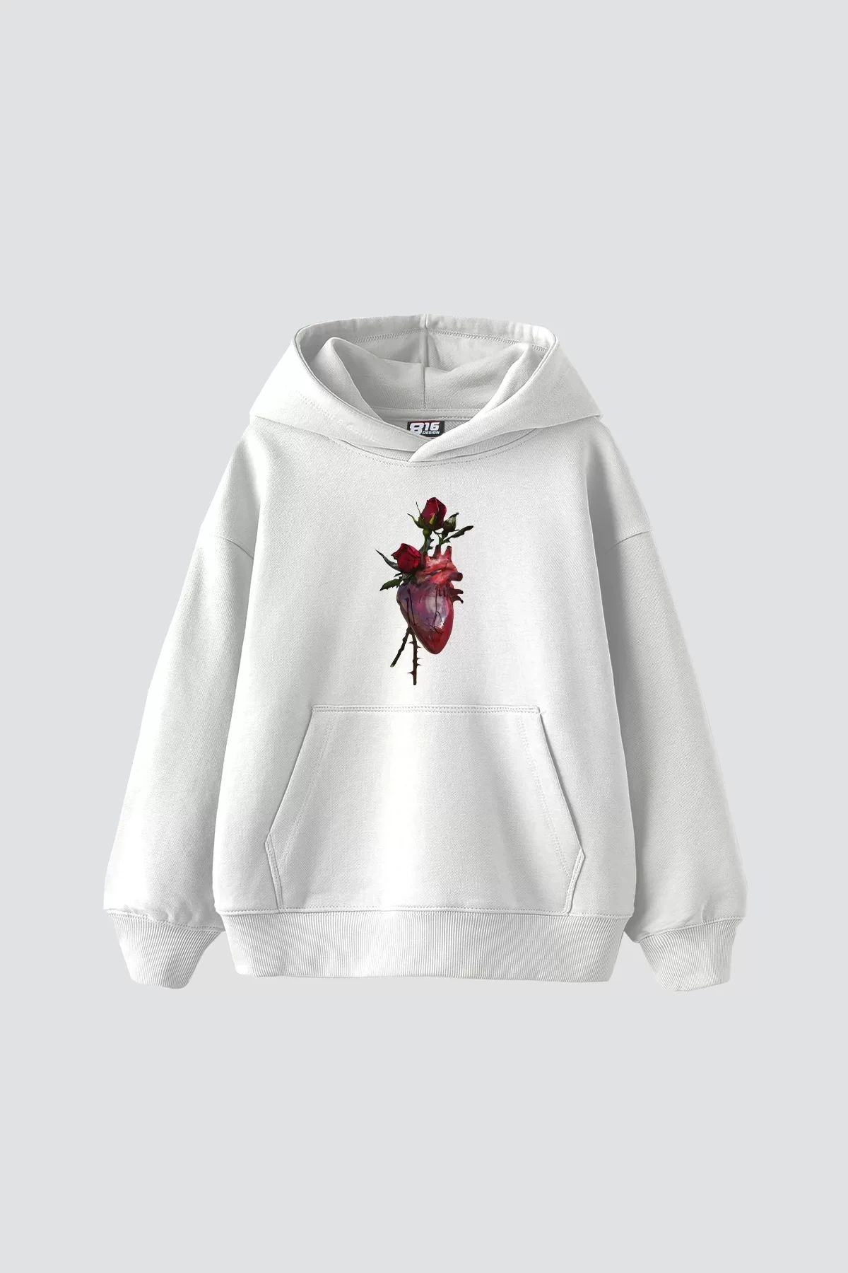 Heart&Rose Baskılı Oversize Unisex Premium Beyaz Hoodie
