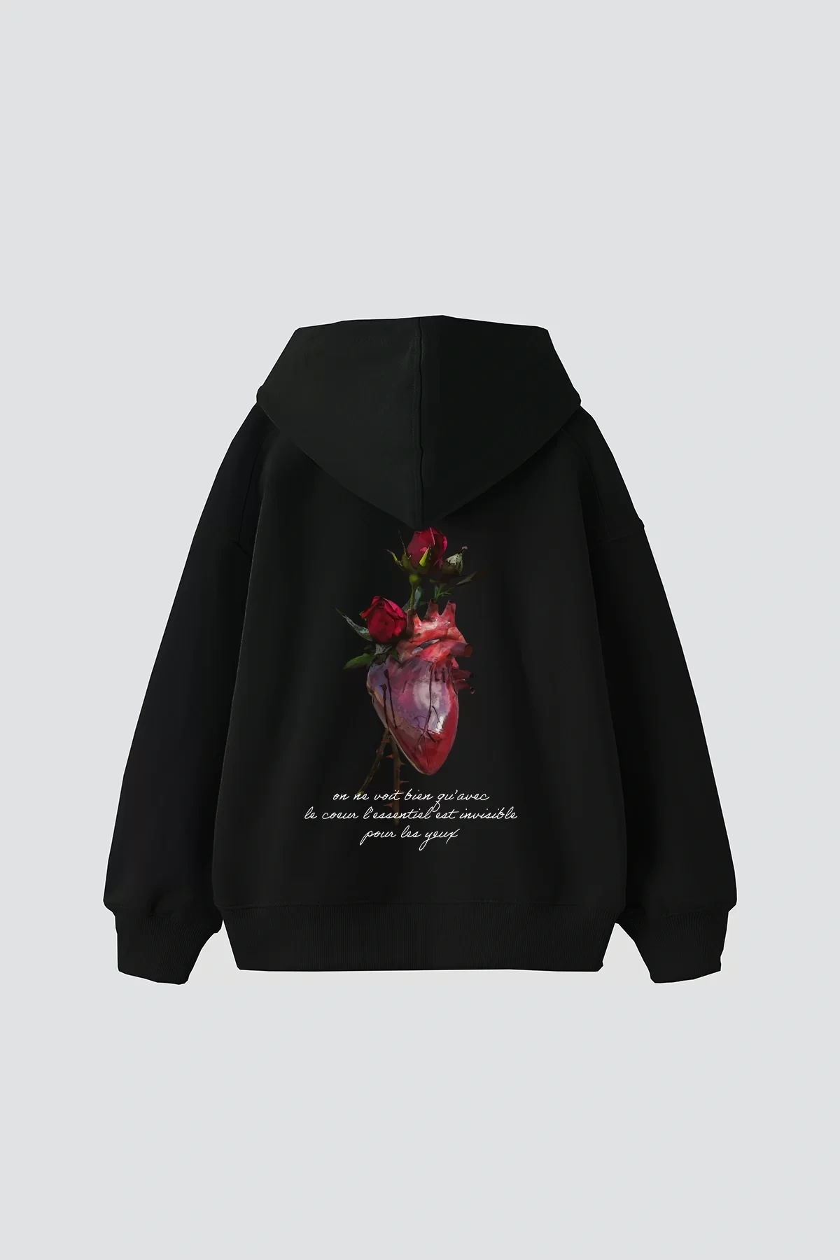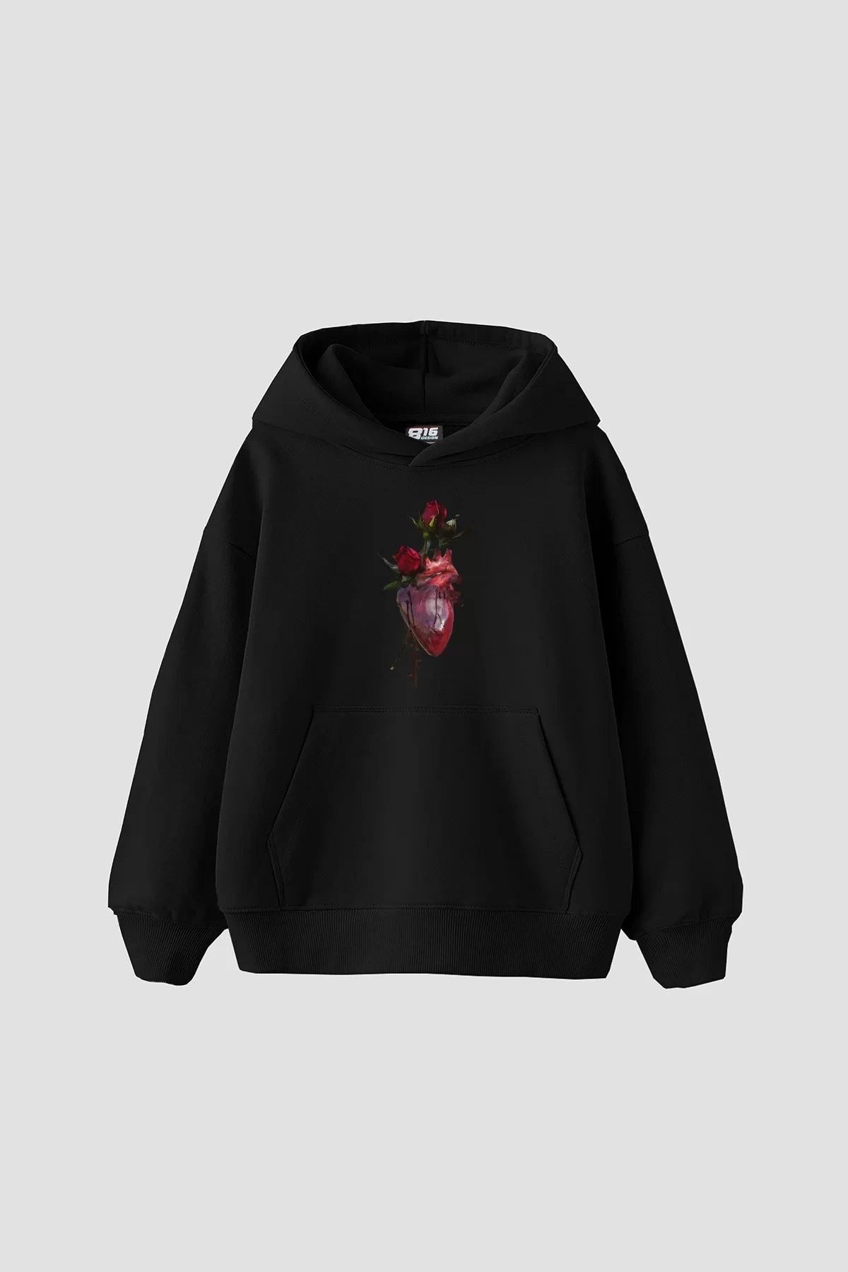 Heart&Rose Baskılı Oversize Unisex Premium Siyah Hoodie