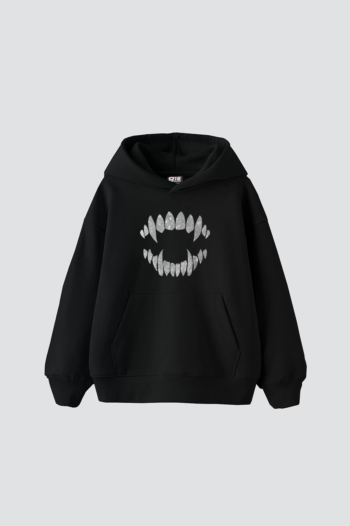 Shining Teeth Baskılı Oversize Unisex Premium Siyah Hoodie