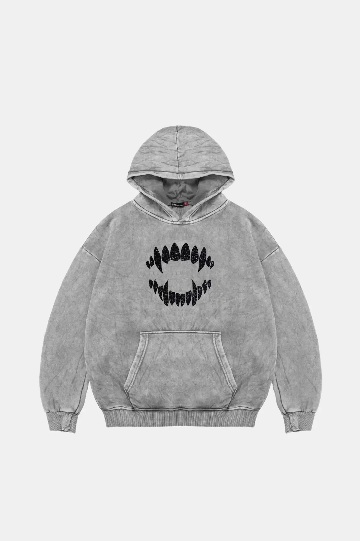 Shining Teeth Baskılı Oversize Unisex Premium Yıkamalı Siyah Hoodie