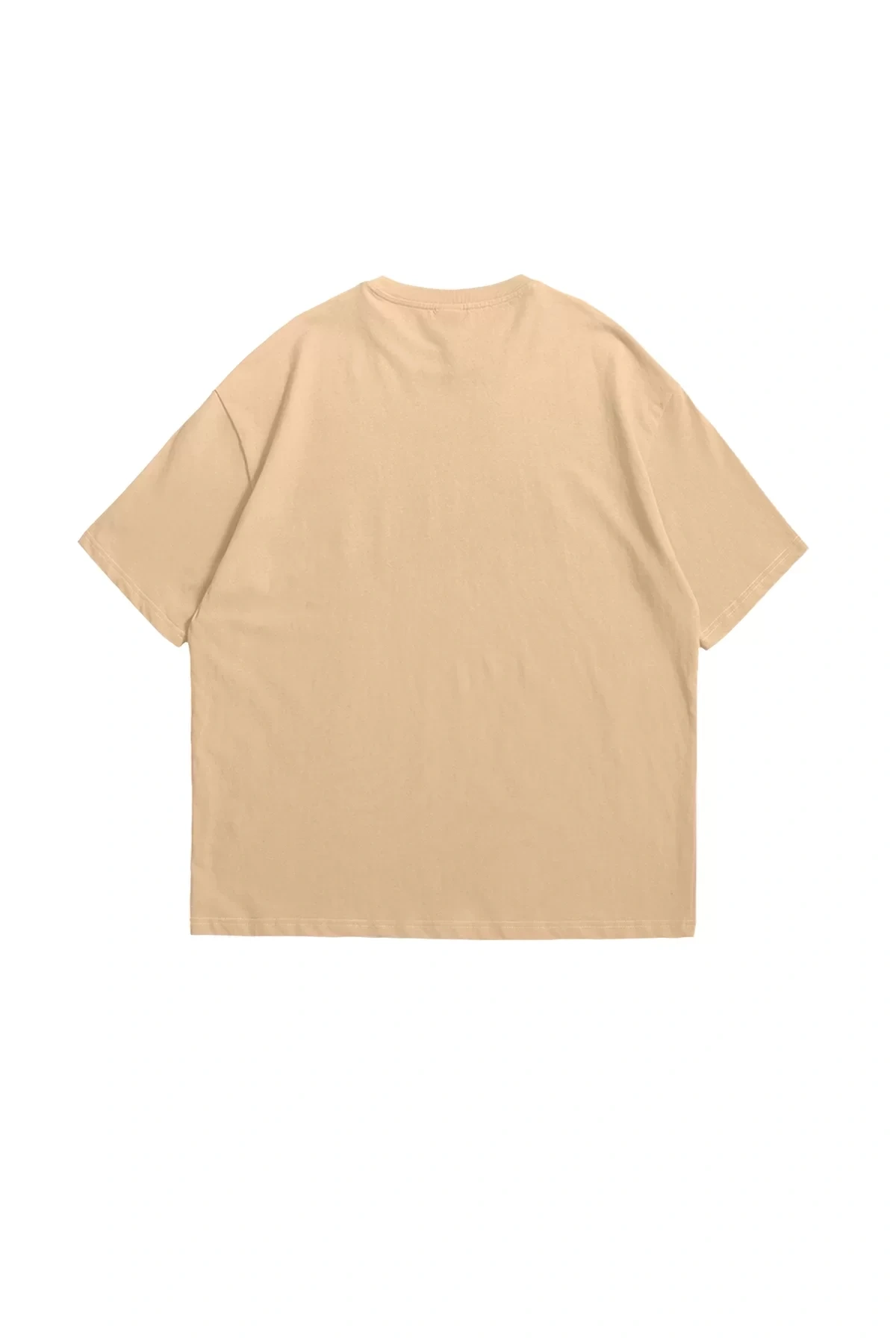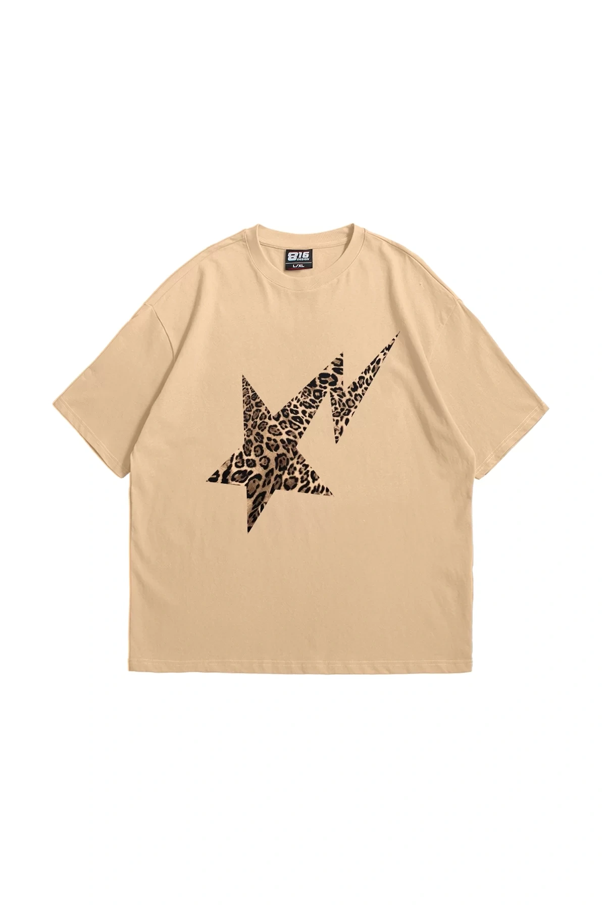 Leopar Falling Star Baskılı Oversize Unisex Bej Tshirt