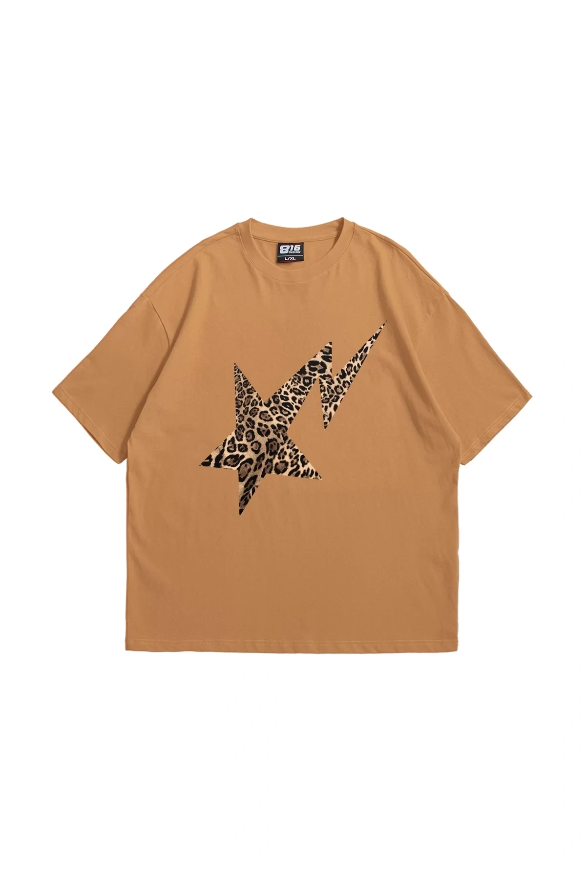 Leopar Falling Star Baskılı Oversize Unisex Kahverengi Tshirt