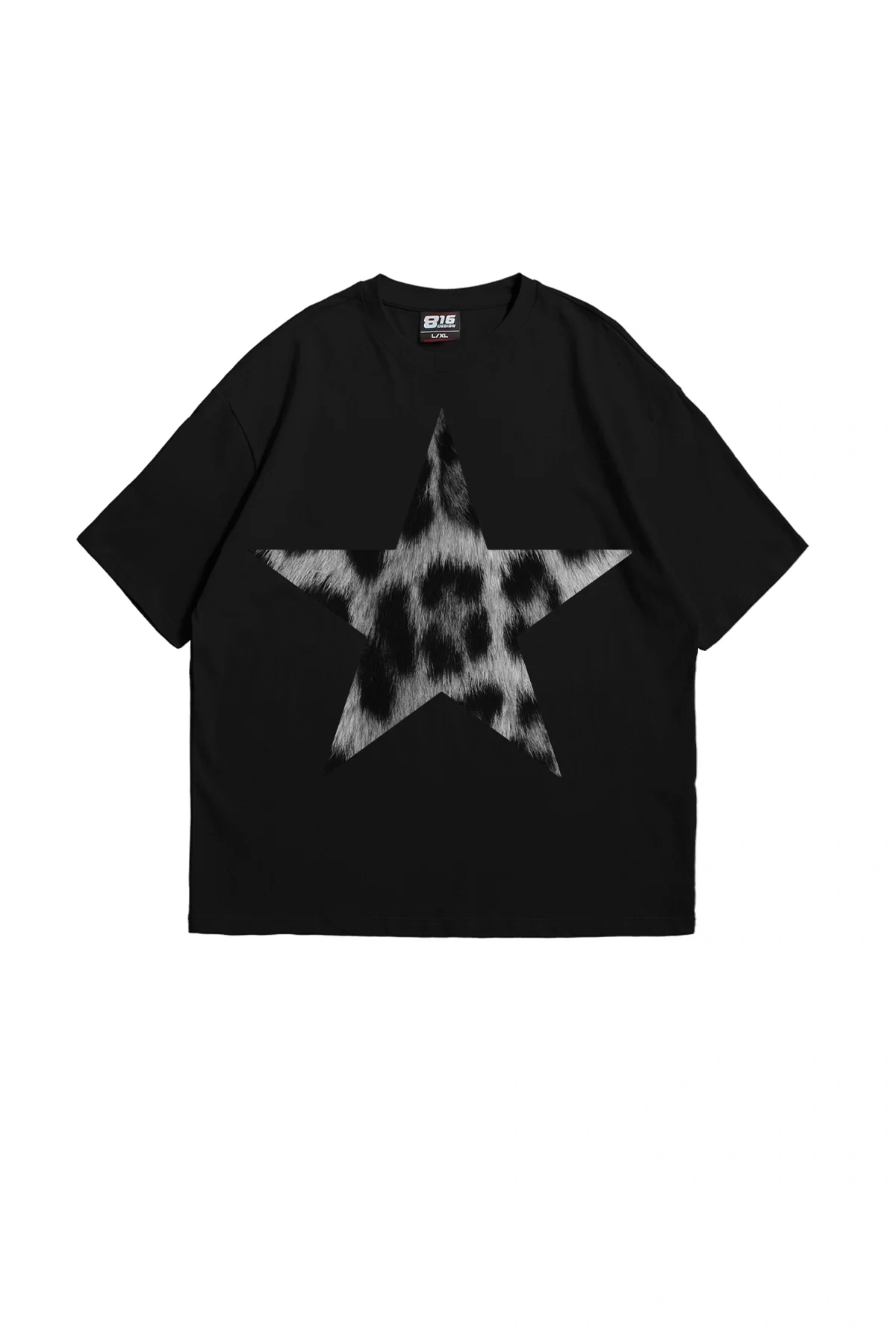 Starz Leopar Baskılı "V2" 24/1 Oversize Unisex Siyah Tshirt