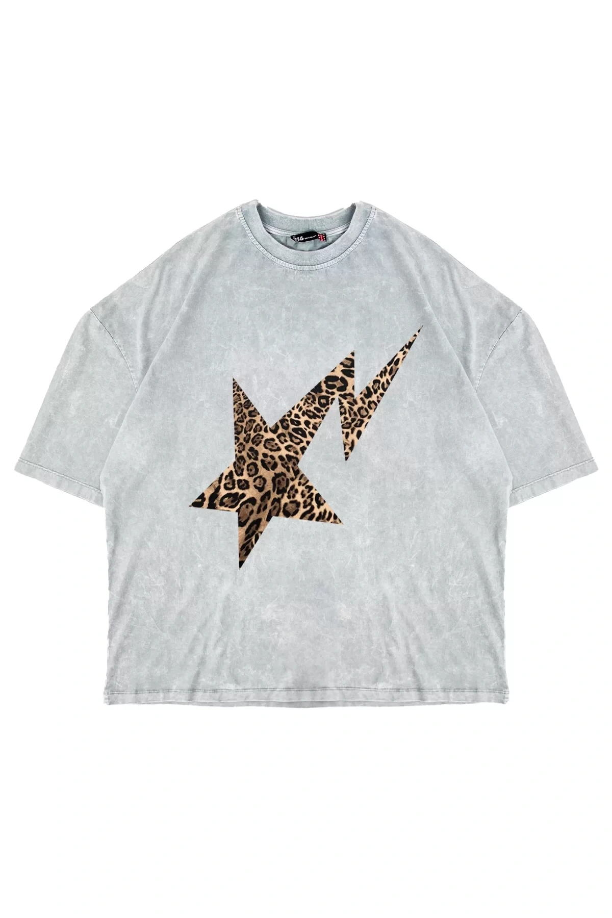 Starz Leopar Baskılı "V2" 24/1 Oversize Unisex Yıkamalı beyaz Tshirt