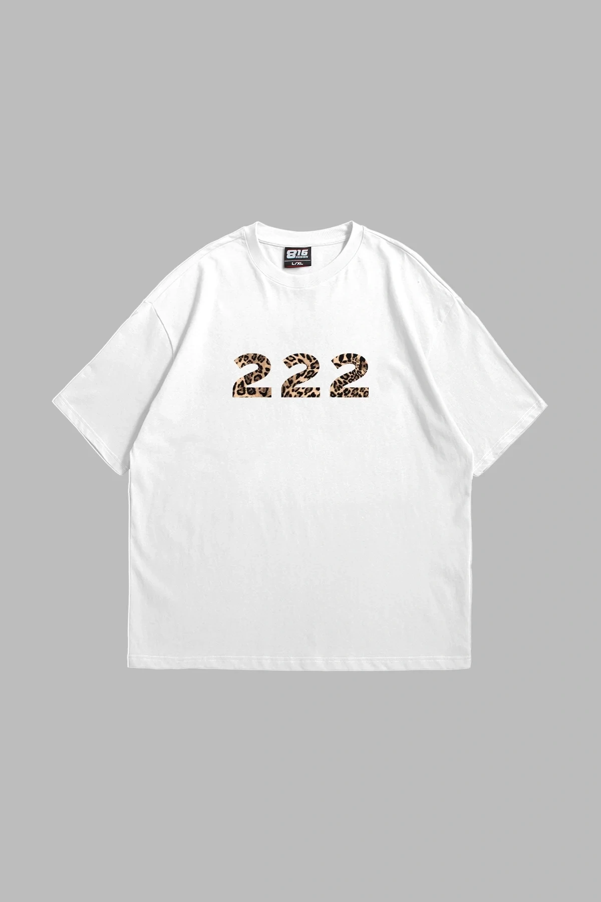 222 Leopar Baskılı Oversize Unisex Beyaz Tshirt