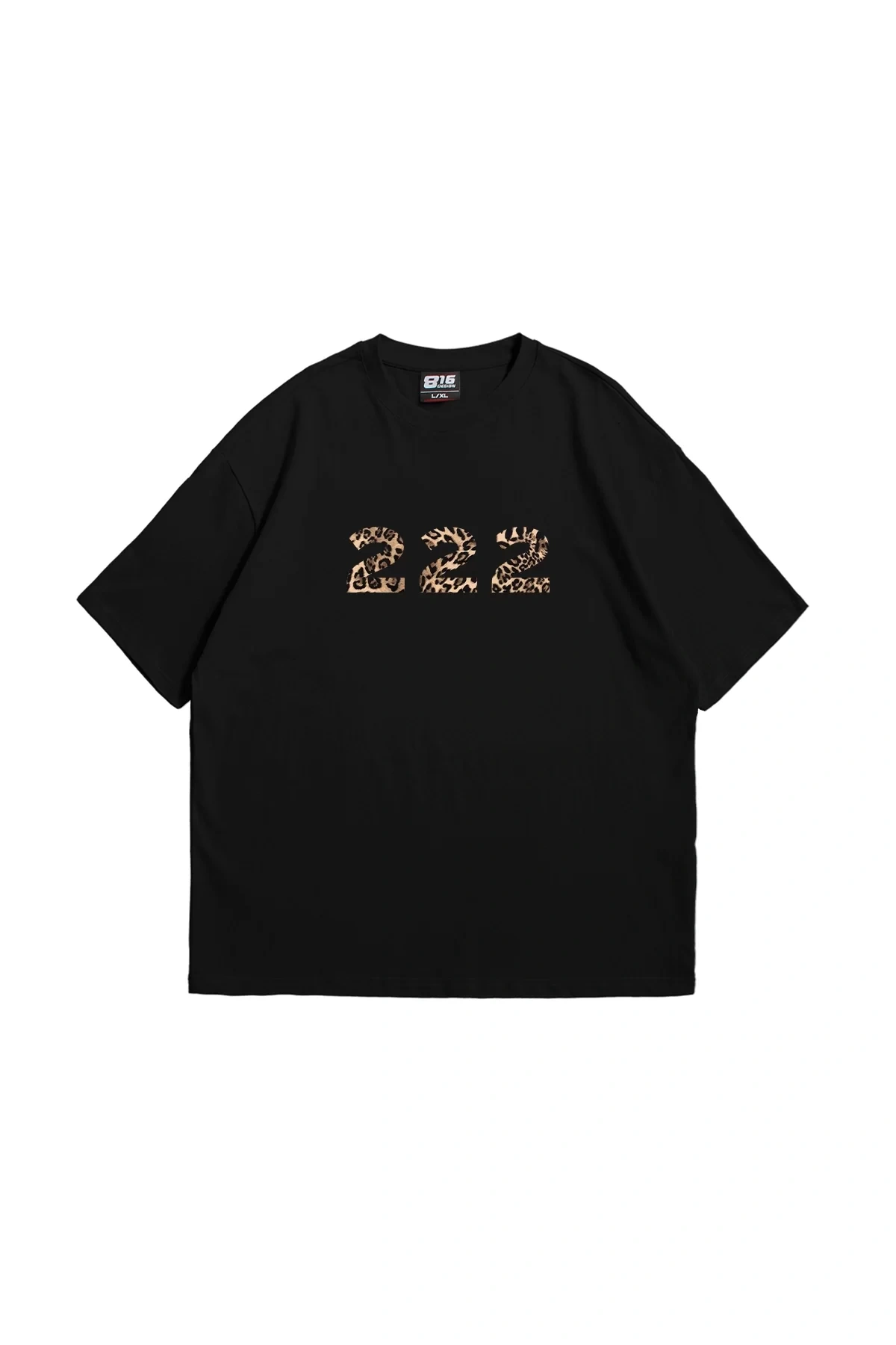 222 Leopar Baskılı Oversize Unisex Siyah Tshirt