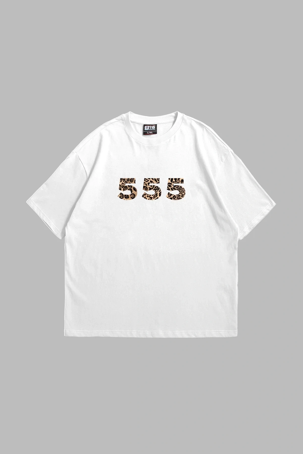 555 Leopar Baskılı Oversize Unisex Beyaz Tshirt