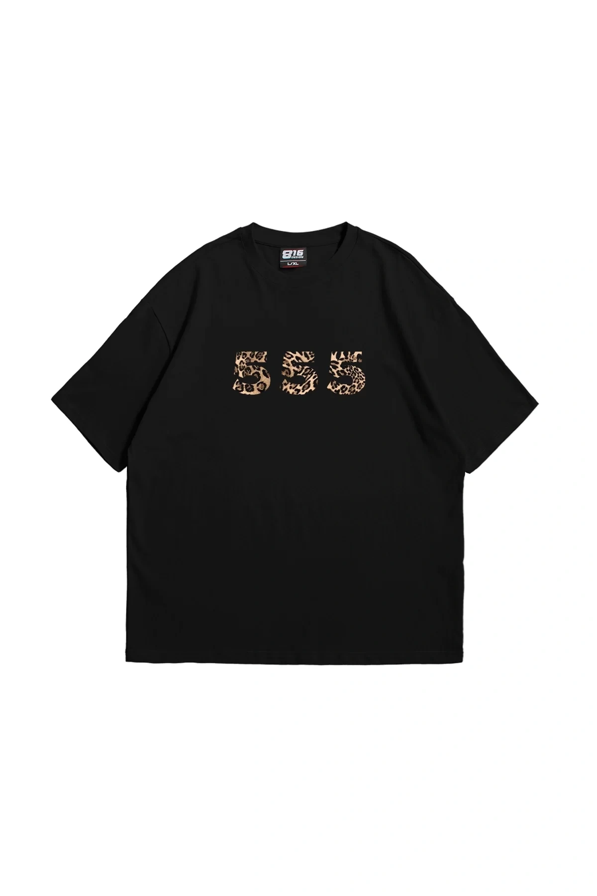 555 Leopar Baskılı Oversize Unisex Siyah Tshirt