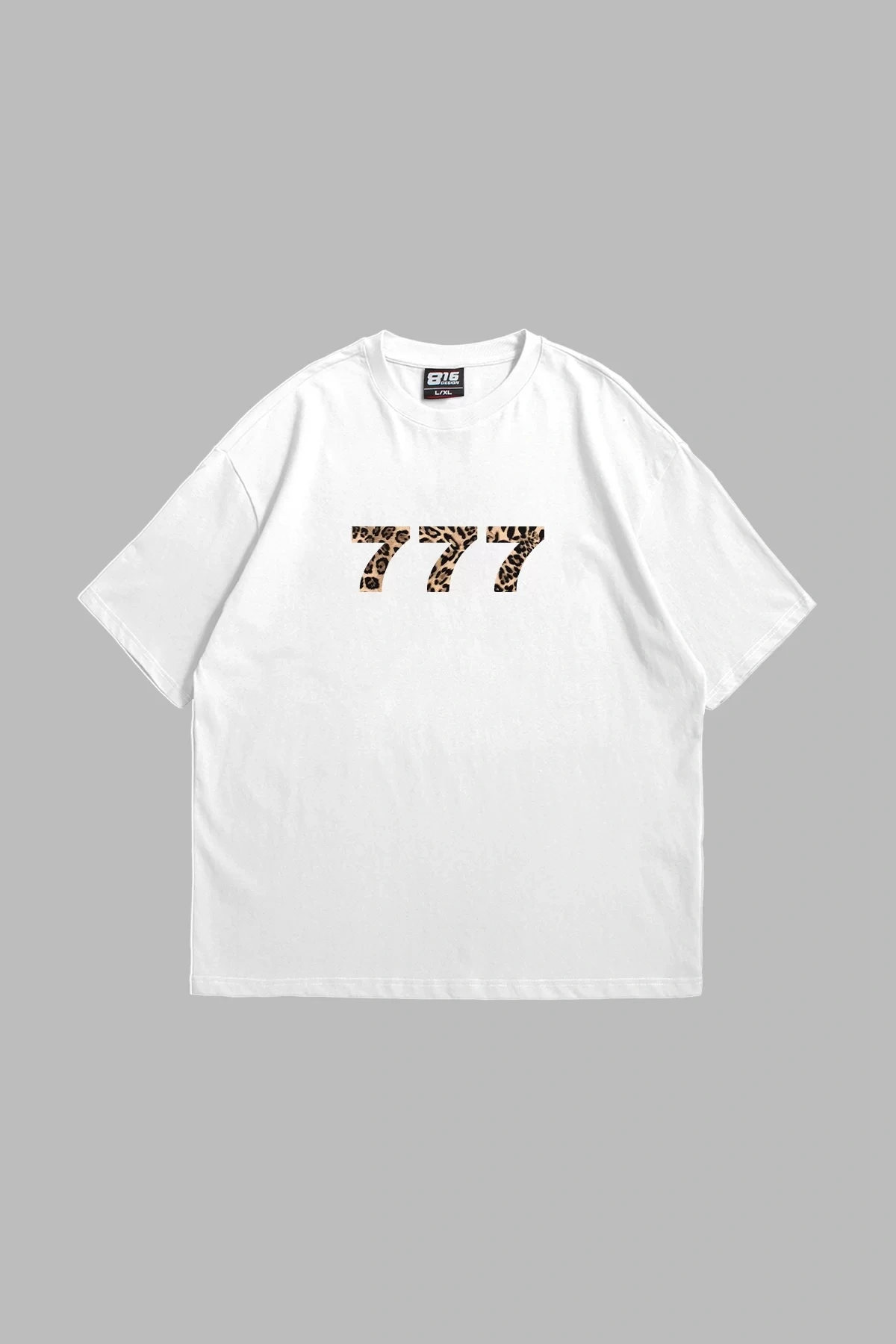 777 Leopar Baskılı Oversize Unisex Beyaz Tshirt