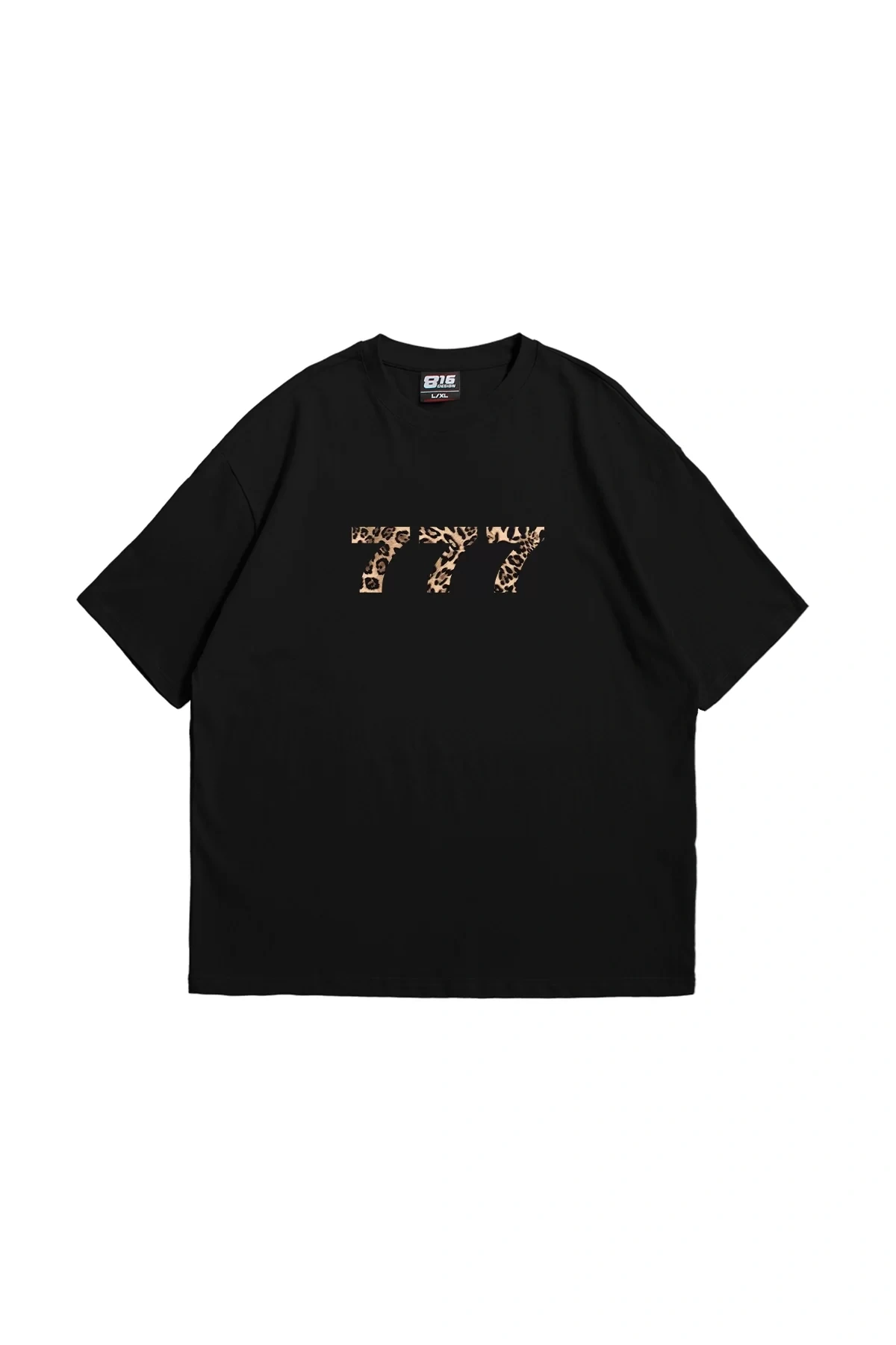 777 Leopar Baskılı Oversize Unisex Siyah Tshirt